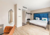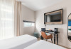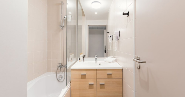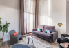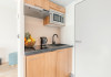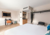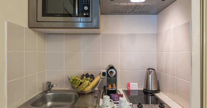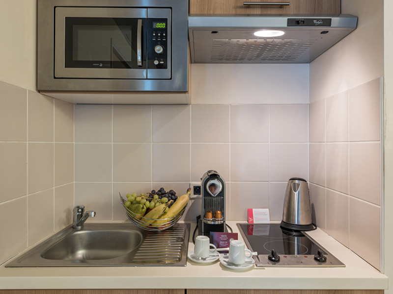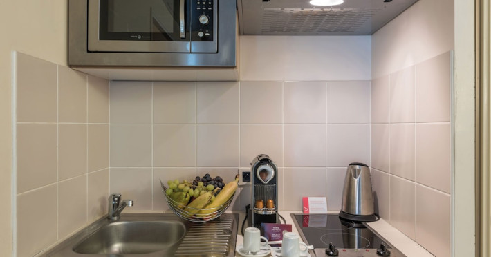 Each apartment includes a flat-screen TV, desk, safe, and a kitchen equipped with a refrigerator, microwave, hob, kettle, and dishes. Some rooms also feature a coffee/tea maker, a separate living room, and blackout curtains. Select bathrooms include a hairdryer and toiletries.