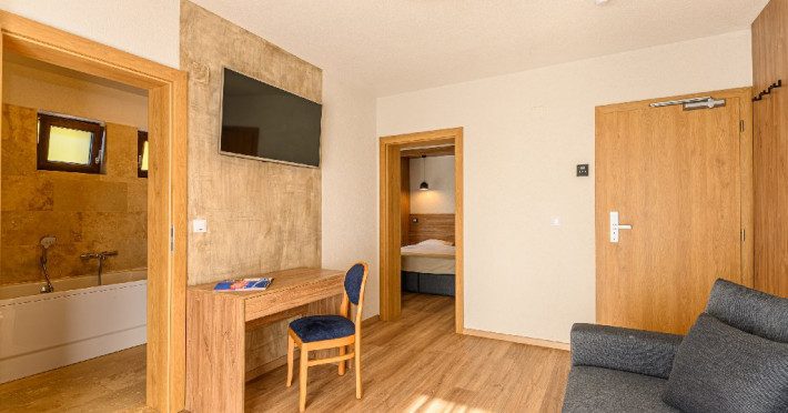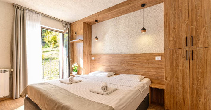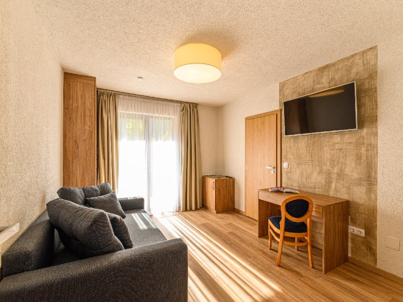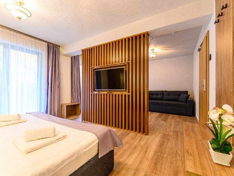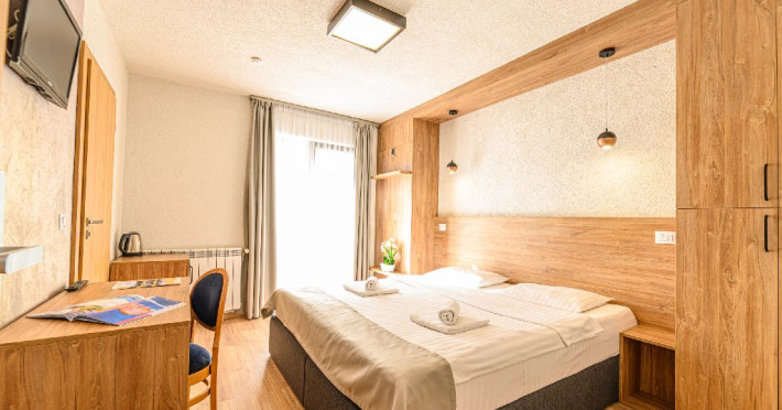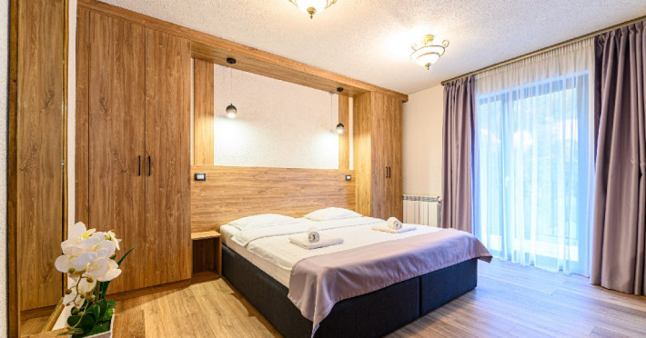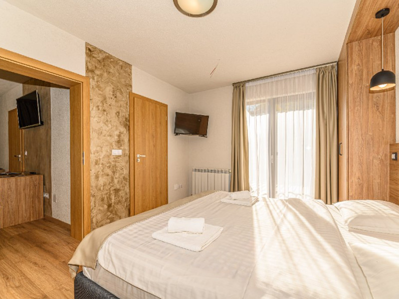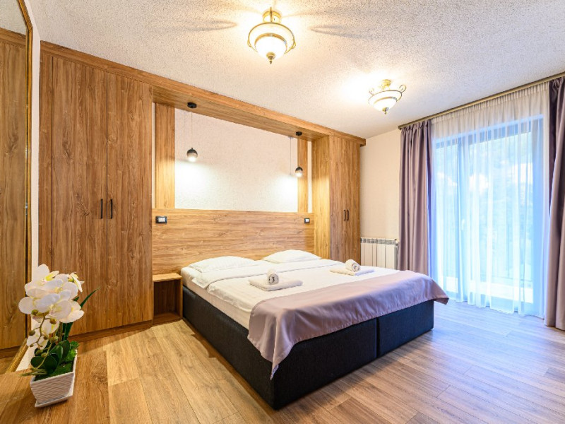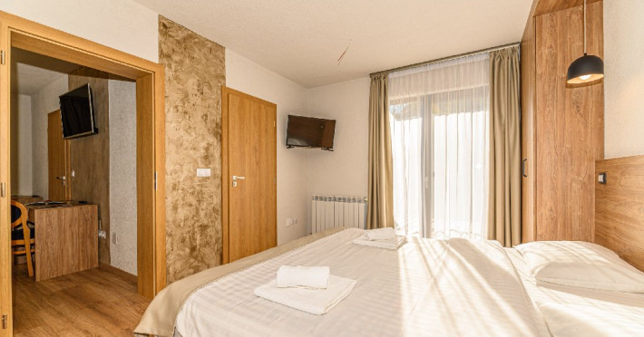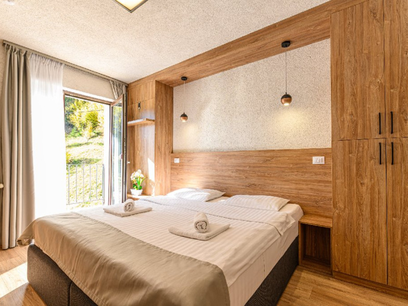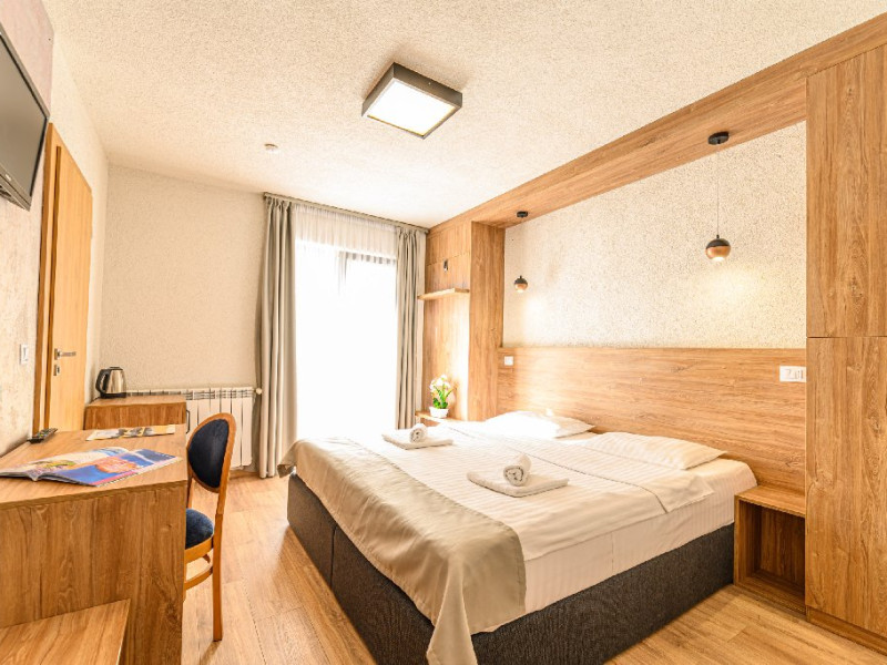 DESCRIERE UNITATE: Unitatea dispune de restaurant, terasa, zona SPA - sauna si ciubar, zona de masaj, parcare, spatiu de joaca. DESCRIERE CAMERE: camerele duble dispun de mobilier modern, pat matrimonial sau twin, Tv, fierbator, birou de lucru, baie cu dus, uscator de par.
