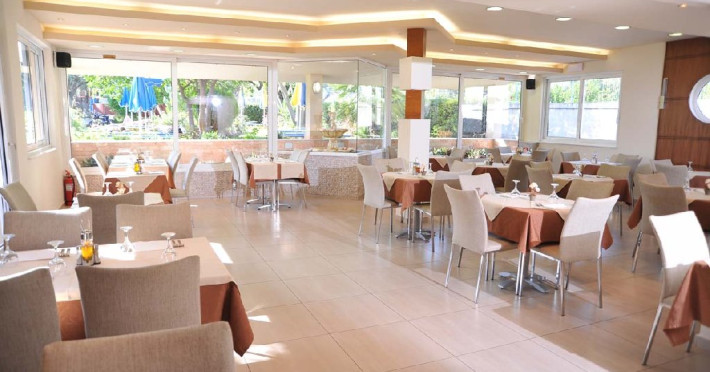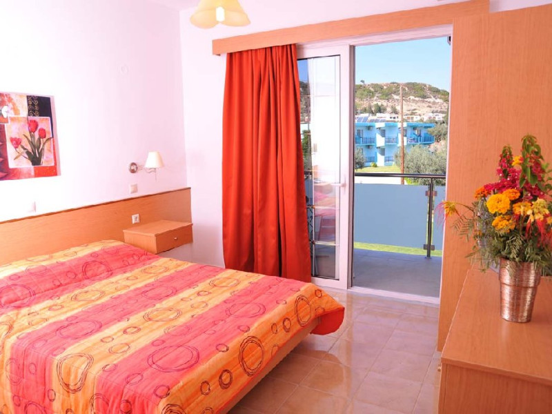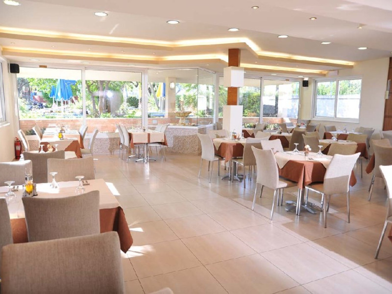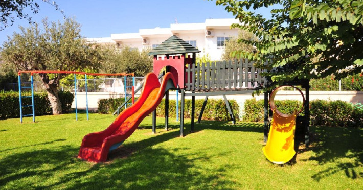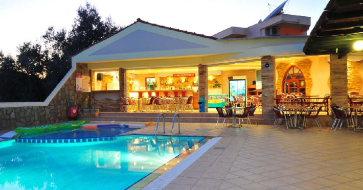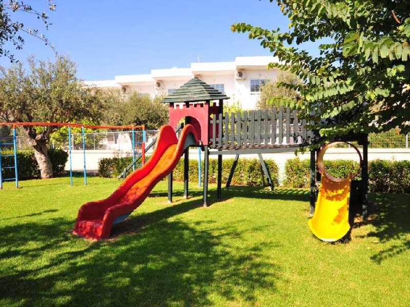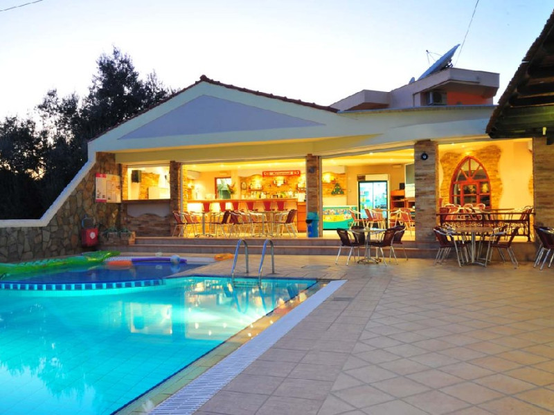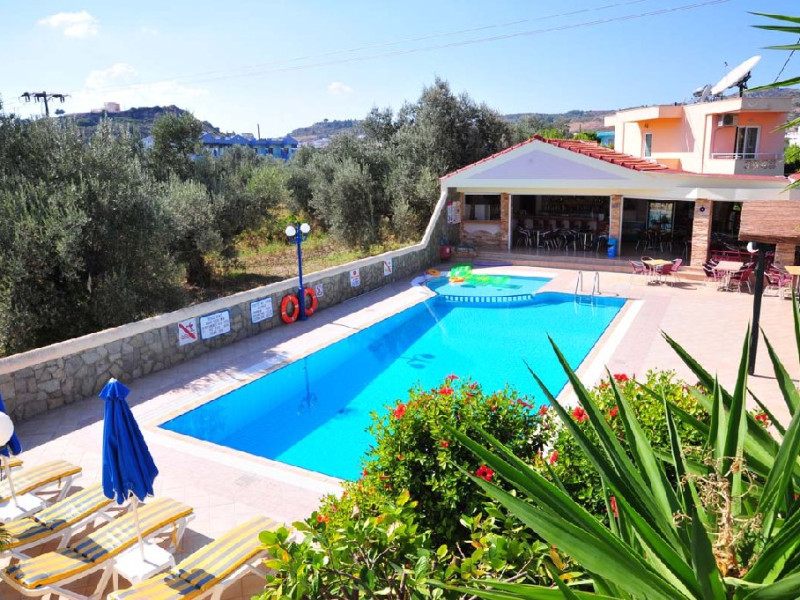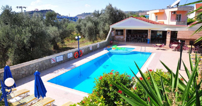 Facilitati hotel: A fost construit pe o proprietate mare de 18.000 m patrati si este format din mai multe cladiri. Toate cladirile sunt inconjurate de pajisti verzi si gradini de maslini, palmieri si tufe de hibiscus.Hotelul are restaurant, snack -bar, piscina exterioara cu sectiune pentru copii, jacuzzi exterior, loc de joaca pentru copii, camera de jocuri electronice, biliard , tenis de masa.