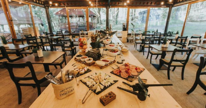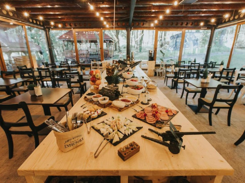 SERVICII DE MASA: Pe cat de disciplinati sunt chelnerii, pe atat de indisciplinat este meniul. Fasolea cazona la cazan e acum depasita numeric de felurite bucate. Pe stil vanatoresc: gratar la foc de tabara cu cartofi copti in jar sau pe stil ardelenesc, faimosii virsli de Brad ori de Salasu, balmos ori branza framantata, placinte traditionale umplute cu varza, ceapa, carne sau prune. Turul de forta in bucataria locala nu se poate incheia fara un strop de afinata sau tuica (permise acum in unitate). Micul dejun este bufet suedez, pranzul si cina variante de meniu.