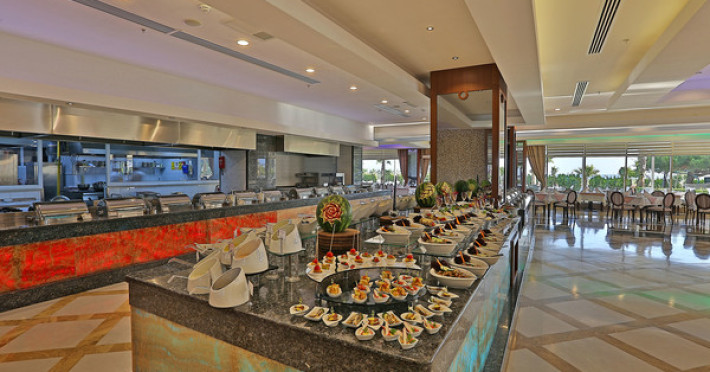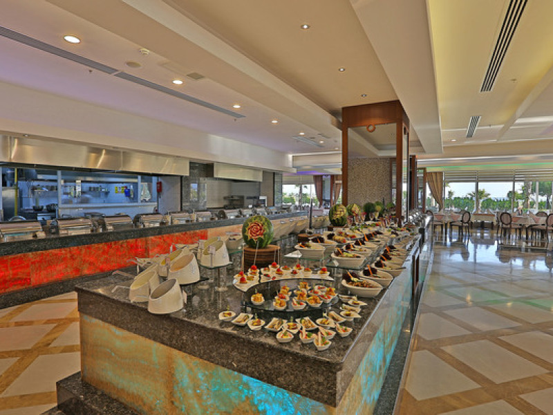 Serviciile ultra all inclusive includ mic dejun zilnic, prânz și cină. Oaspeții pot lua cina la restaurantele a la carte cu rezervare. Există 3 restaurante à la carte, care servesc mâncăruri tradiționale turcești, mediteraneene și asiatice. Există, de asemenea, 6 baruri la fața locului, care servesc băuturi.