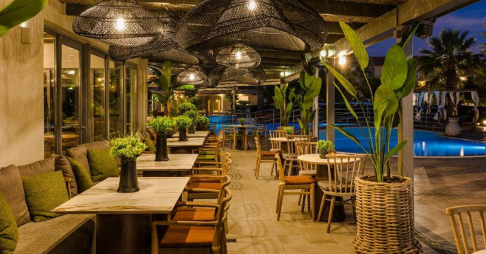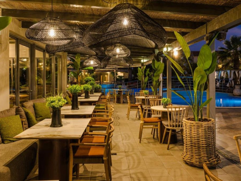 Arhitectura complexului, simpla si cu nuante deschise, se integreaza armonios in mediul natural, inconjurata de gradini frumoase. Piscina de dimensiuni olimpice, situata intre cele paisprezece cladiri de cazare, ii invita pe oaspeti sa se relaxeze in jurul ei si sa se bucure de cocktailuri racoritoare si gustari delicioase, servite la barul de la piscina.