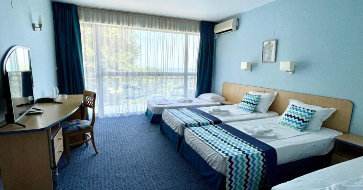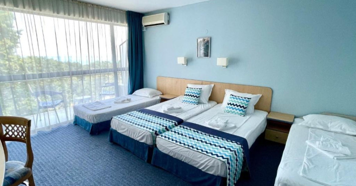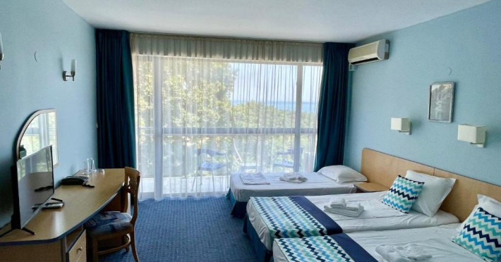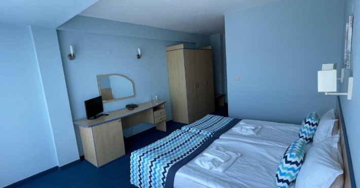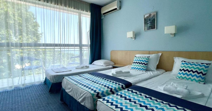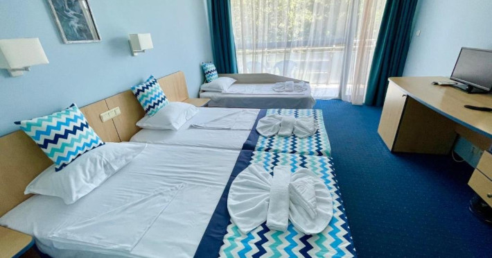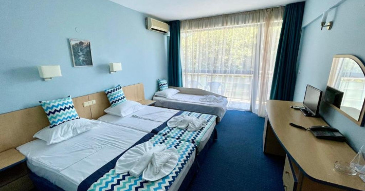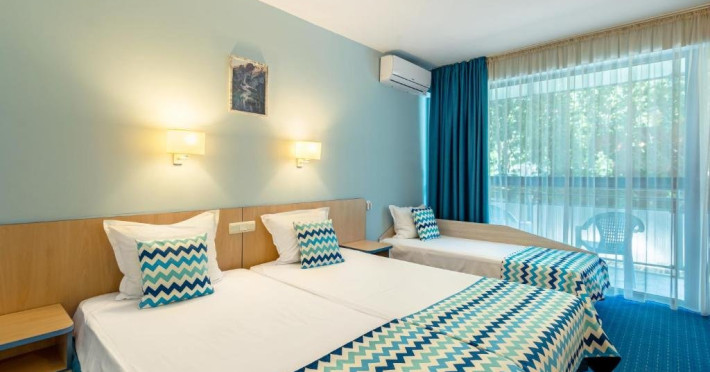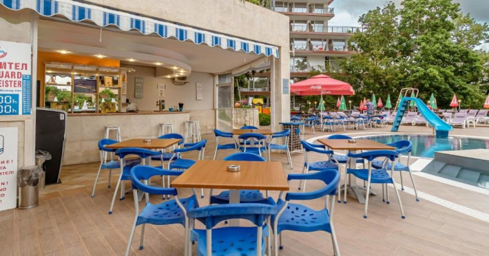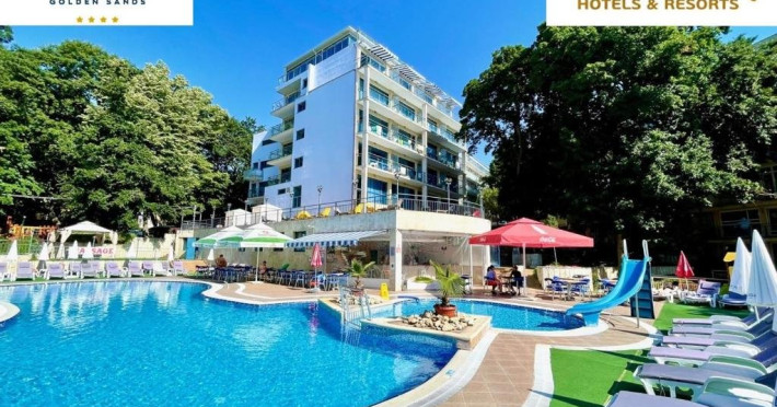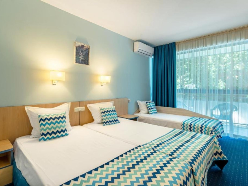 Hotelul este situat in partea de sud-vest a statiunii Nisipurile de Aur. Exista o statie de autobuz la 20 m distanta. Se afla la 1 km de centrul orasului si de zona comerciala a statiunii. Plaja: Nisiposa, la 600 m de hotel (prin iesirea din spate a hotelului si pe scari catre hotel Gradina). Fundul marii este plat, cu acces lin. Plaja este castigatoare a premiului Blue Flag. Cazare: Hotelul a fost partial renovat in 2022 si 2023. Hotelul cu 5 etaje are 145 de camere. Vederile sunt catre piscina sau gradina. Unele camere de la ultimele etaje au vedere la mare. Exista un lift in hotel. DBL 2+0 ECONOMY: Aproximativ 20 m2. Camerele au vedere la parc si sunt dotate cu doua paturi standard. Toate camerele sunt echipate cu baie cu dus, sistem individual de aer conditionat, TV prin satelit, Wi-Fi, telefon, balcon, mini frigider si uscator de par. Capacitatea maxima este de 2 adulti. DBL 2+1: Aproximativ 22 m2. Camerele au doua paturi standard si un fotoliu extensibil. Toate camerele sunt echipate cu baie cu dus, sistem individual de aer conditionat, TV prin satelit, Wi-Fi, telefon, balcon, mini frigider si uscator de par. Capacitatea maxima este de 3 adulti. DBL 2+2/3+1 LARGE: Aproximativ 29 m2. Camerele au patru paturi standard (doua cu dimensiunile 100/200 cm si doua cu dimensiunea 80/190 cm). Toate camerele sunt echipate cu baie cu dus, sistem individual de aer conditionat, TV prin satelit, Wi-Fi, telefon, balcon, mini frigider si uscator de par. Capacitatea maxima este de 4 adulti. TRP 2+1: Aproximativ 23 m2. Camerele au trei paturi standard (doua cu dimensiunile 100/200 cm si unul cu dimensiunea 80/190 cm). Toate camerele sunt echipate cu baie cu dus, sistem individual de aer conditionat, TV prin satelit, Wi-Fi, telefon, balcon, mini frigider si uscator de par. Capacitatea maxima este de 3 adulti. TRP 2+1 AQUA: Aproximativ 23 m2. Camerele au trei paturi standard (doua cu dimensiunile 100/200 cm si unul cu dimensiunea 80/190 cm). Toate camerele sunt echipate cu baie cu dus, sistem individual de aer conditionat, TV prin satelit, Wi-Fi, telefon, balcon, mini frigider si uscator de par. Capacitatea maxima este de 3 adulti. Daca aceasta camera este rezervata, oaspetii beneficiaza de acces gratuit la Aquapark-ul Hotelului Gradina (piscina cu 4 tobogane si o noua piscina pentru copii cu tobogane)! DBL 2+2/3+1 LARGE AQUA: Aproximativ 29 m2. Camerele au patru paturi standard (doua cu dimensiunile 100/200 cm si doua cu dimensiunea 80/190 cm). Toate camerele sunt echipate cu baie cu dus, sistem individual de aer conditionat, TV prin satelit, Wi-Fi, telefon, balcon, mini frigider si uscator de par. Capacitatea maxima este de 4 adulti. Daca aceasta camera este rezervata, oaspetii beneficiaza de acces gratuit la Aquapark-ul Hotelului Gradina (piscina cu 4 tobogane si o noua piscina pentru copii cu tobogane)! Este permis sa fie cazat un bebelus peste capacitatea maxima a camerei. Patutul pentru bebelusi este oferit gratuit la cerere prealabila. La parter exista camere adaptate pentru persoane cu dizabilitati. Animalele de companie nu sunt permise. Despre hotel: Lobby, receptie deschisa 24h, seifuri de inchiriat la receptie, Wi-Fi, schimb valutar in apropiere, restaurant principal cu terasa, lobby bar, pool bar, piscina exterioara cu terase pentru plaja, sala de jocuri cu biliard, air-hockey si fotbal de masa (contra cost). Sport: Hotelul ofera tenis de masa, teren de joaca pentru volei/fotbal si mini-fotbal.