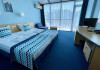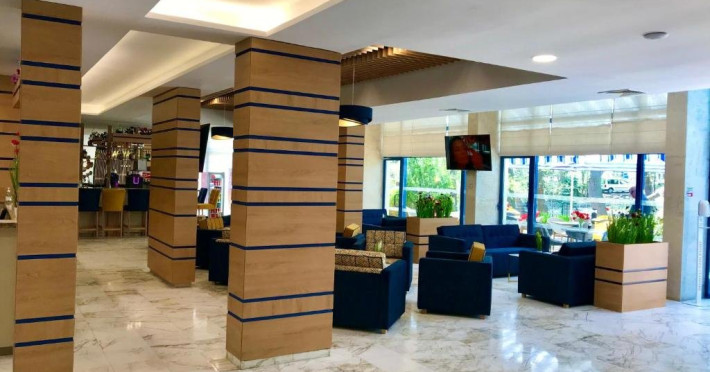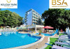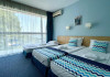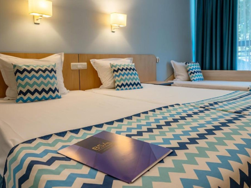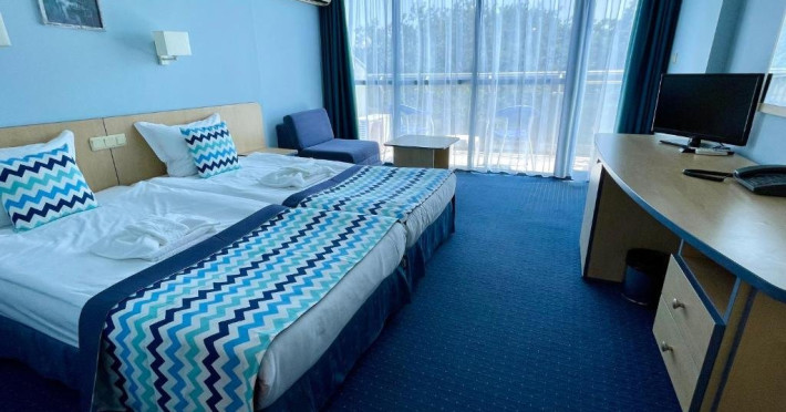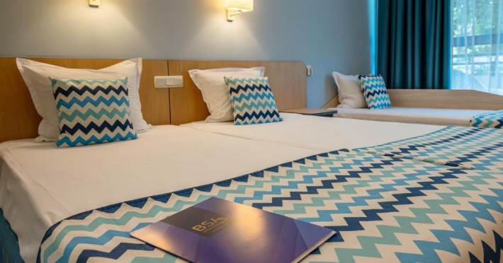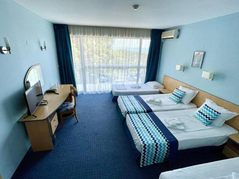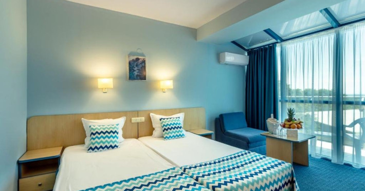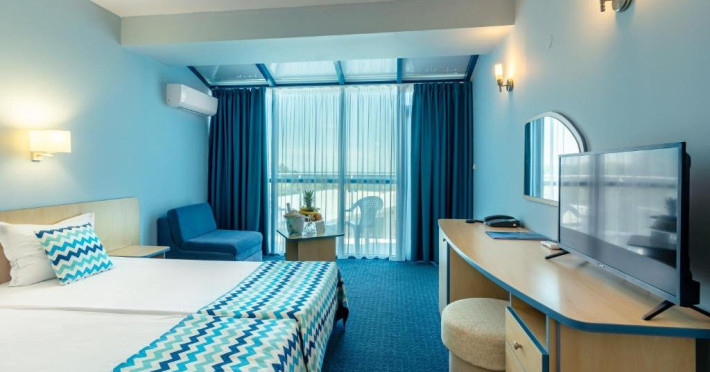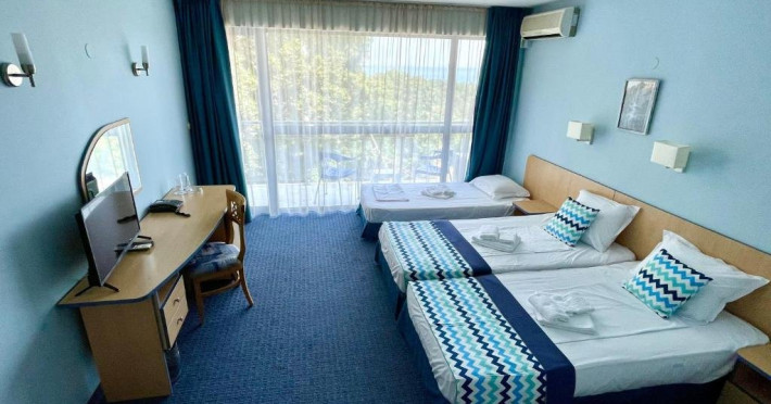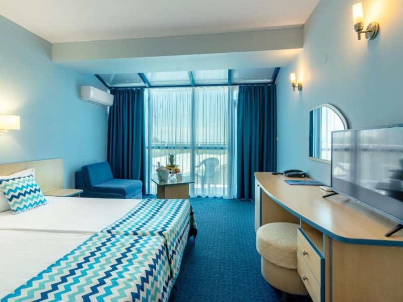 Hotelul este situat in partea de sud-vest a statiunii Nisipurile de Aur. Exista o statie de autobuz la 20 m distanta. Se afla la 1 km de centrul orasului si de zona comerciala a statiunii. Plaja: Nisiposa, la 600 m de hotel (prin iesirea din spate a hotelului si pe scari catre hotel Gradina). Fundul marii este plat, cu acces lin. Plaja este castigatoare a premiului Blue Flag. Cazare: Hotelul a fost partial renovat in 2022 si 2023. Hotelul cu 5 etaje are 145 de camere. Vederile sunt catre piscina sau gradina. Unele camere de la ultimele etaje au vedere la mare. Exista un lift in hotel. DBL 2+0 ECONOMY: Aproximativ 20 m2. Camerele au vedere la parc si sunt dotate cu doua paturi standard. Toate camerele sunt echipate cu baie cu dus, sistem individual de aer conditionat, TV prin satelit, Wi-Fi, telefon, balcon, mini frigider si uscator de par. Capacitatea maxima este de 2 adulti. DBL 2+1: Aproximativ 22 m2. Camerele au doua paturi standard si un fotoliu extensibil. Toate camerele sunt echipate cu baie cu dus, sistem individual de aer conditionat, TV prin satelit, Wi-Fi, telefon, balcon, mini frigider si uscator de par. Capacitatea maxima este de 3 adulti. DBL 2+2/3+1 LARGE: Aproximativ 29 m2. Camerele au patru paturi standard (doua cu dimensiunile 100/200 cm si doua cu dimensiunea 80/190 cm). Toate camerele sunt echipate cu baie cu dus, sistem individual de aer conditionat, TV prin satelit, Wi-Fi, telefon, balcon, mini frigider si uscator de par. Capacitatea maxima este de 4 adulti. TRP 2+1: Aproximativ 23 m2. Camerele au trei paturi standard (doua cu dimensiunile 100/200 cm si unul cu dimensiunea 80/190 cm). Toate camerele sunt echipate cu baie cu dus, sistem individual de aer conditionat, TV prin satelit, Wi-Fi, telefon, balcon, mini frigider si uscator de par. Capacitatea maxima este de 3 adulti. TRP 2+1 AQUA: Aproximativ 23 m2. Camerele au trei paturi standard (doua cu dimensiunile 100/200 cm si unul cu dimensiunea 80/190 cm). Toate camerele sunt echipate cu baie cu dus, sistem individual de aer conditionat, TV prin satelit, Wi-Fi, telefon, balcon, mini frigider si uscator de par. Capacitatea maxima este de 3 adulti. Daca aceasta camera este rezervata, oaspetii beneficiaza de acces gratuit la Aquapark-ul Hotelului Gradina (piscina cu 4 tobogane si o noua piscina pentru copii cu tobogane)! DBL 2+2/3+1 LARGE AQUA: Aproximativ 29 m2. Camerele au patru paturi standard (doua cu dimensiunile 100/200 cm si doua cu dimensiunea 80/190 cm). Toate camerele sunt echipate cu baie cu dus, sistem individual de aer conditionat, TV prin satelit, Wi-Fi, telefon, balcon, mini frigider si uscator de par. Capacitatea maxima este de 4 adulti. Daca aceasta camera este rezervata, oaspetii beneficiaza de acces gratuit la Aquapark-ul Hotelului Gradina (piscina cu 4 tobogane si o noua piscina pentru copii cu tobogane)! Este permis sa fie cazat un bebelus peste capacitatea maxima a camerei. Patutul pentru bebelusi este oferit gratuit la cerere prealabila. La parter exista camere adaptate pentru persoane cu dizabilitati. Animalele de companie nu sunt permise. Despre hotel: Lobby, receptie deschisa 24h, seifuri de inchiriat la receptie, Wi-Fi, schimb valutar in apropiere, restaurant principal cu terasa, lobby bar, pool bar, piscina exterioara cu terase pentru plaja, sala de jocuri cu biliard, air-hockey si fotbal de masa (contra cost). Sport: Hotelul ofera tenis de masa, teren de joaca pentru volei/fotbal si mini-fotbal.