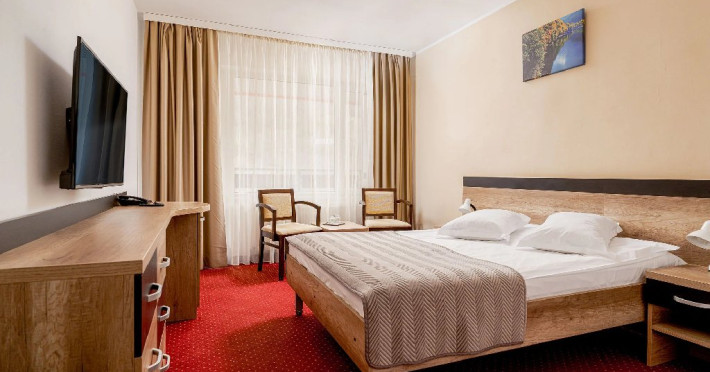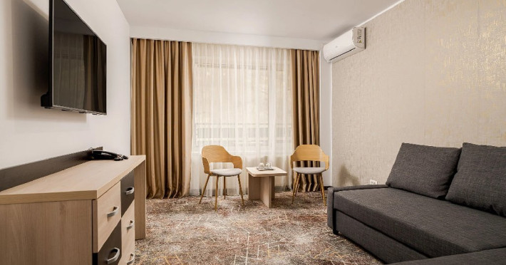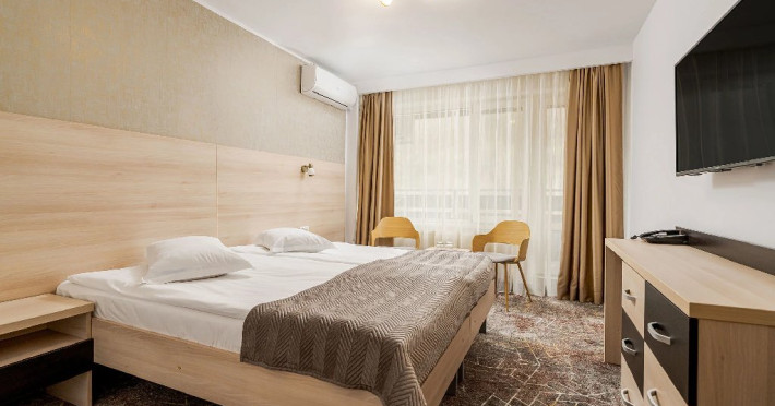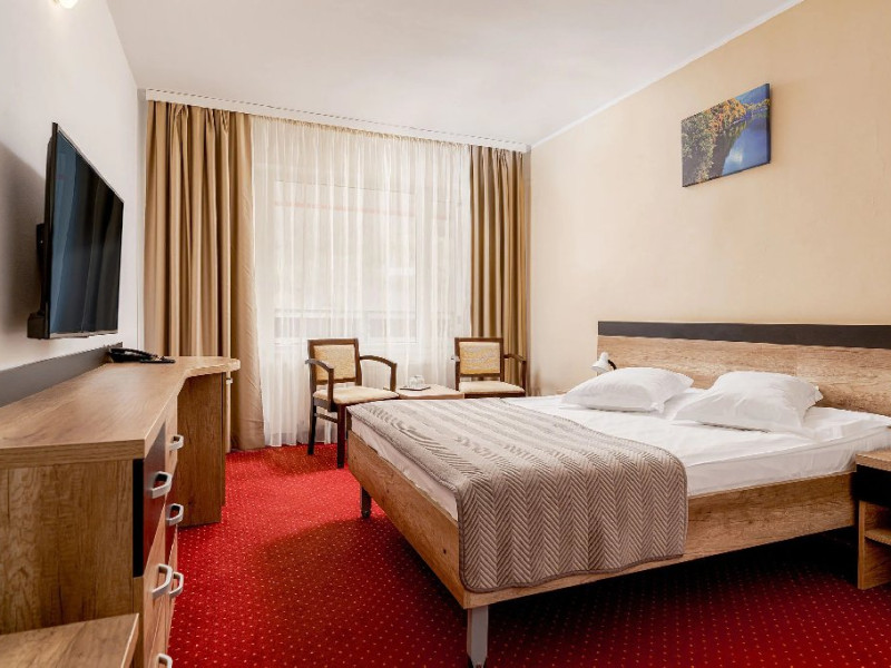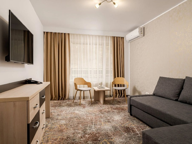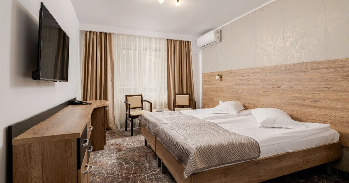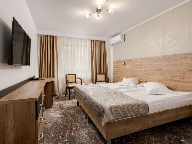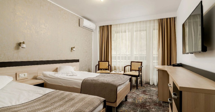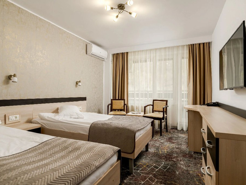Tratament: baza de tratament comuna cu serviciu de masaj unde se pot trata afectiuni ale tubului digestiv, hepato-biliare, renale, ale cailor urinare, metabolice si de nutritie, reumatismale inflamatorii, neurologice periferice, respiratorii si boli asociate. DESCRIERE CAMERE Camerele superioare renovate complet in 2025 au un design elegant si dotari moderne: 2 paturi twin/pat dublu, TV LCD Full HD, minibar, mobilier modern, baie proprie cu dus, uscator de par. Camerele standard sunt dotate cu TV, cablu, minibar, baie cu dus, uscator de par si ventilatie. LOCALIZARE Complexul se afla in statiunea Caciulata, pe drumul European E81, la cateva minute de mers de Manastirea Cozia. ATRACTII TURISTICE Manastirea Cozia (ctitorita in 1387 de catre Mircea cel Batran, Domnitorul Tarii Romanesti), cel mai vechi si mai important monument de arhitectura si arta medievala din Tara Romaneasca; Manastirea Ostrov, ctitorita in 1500 de Neagoe Basarab; Ruinele Castrului roman Arutela. POLITICI Pentru procedurile de tratament, turistii trebuie sa prezinte la hotel dovada de asigurat (adeverinta de la locul de munca sau cupon de pensie), card de sanatate si bilet de trimitere tip pentru servicii medicale in sistemul asigurarilor sociale de sanatate. In caz contrar, serviciile de tratament vor fi incasate la tarif pentru turist neasigurat iar turistul va fi obligat sa achite diferenta la receptie.