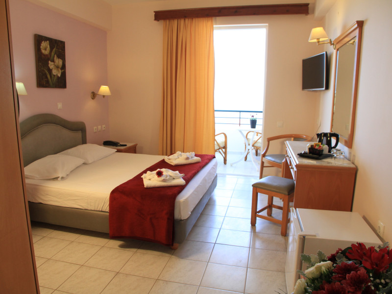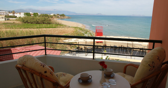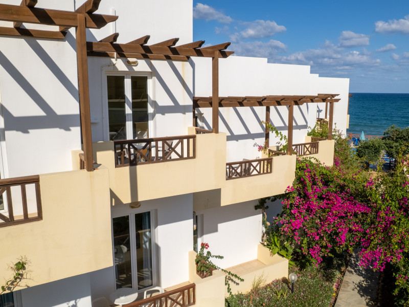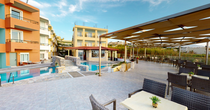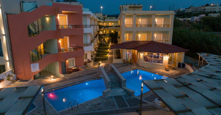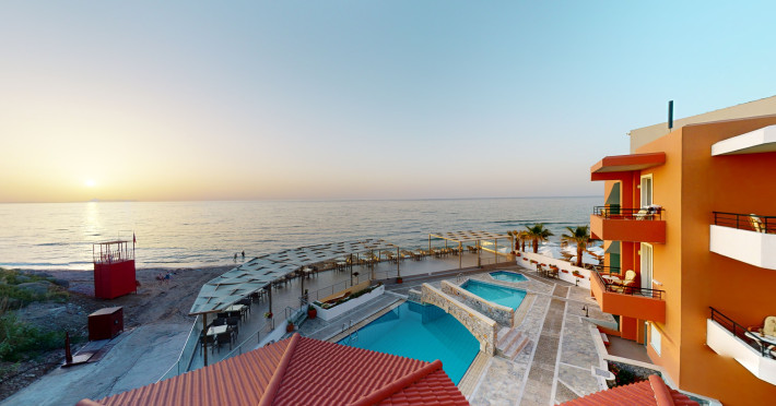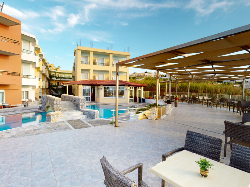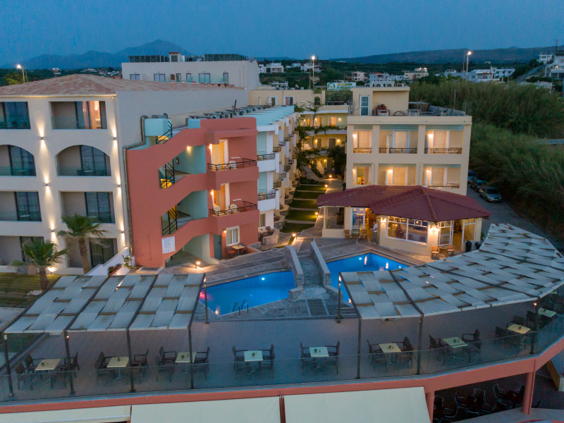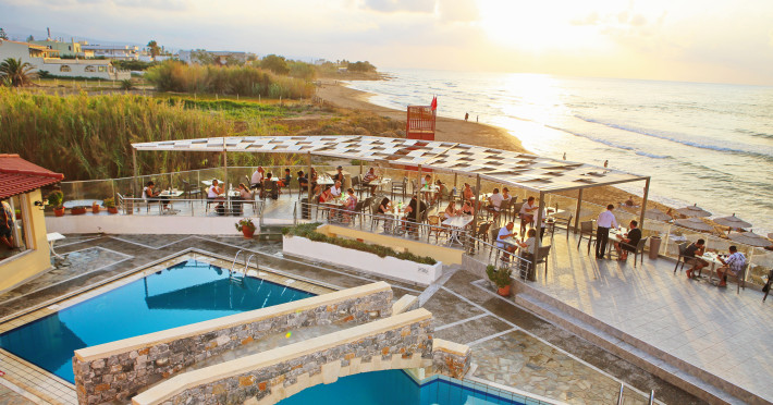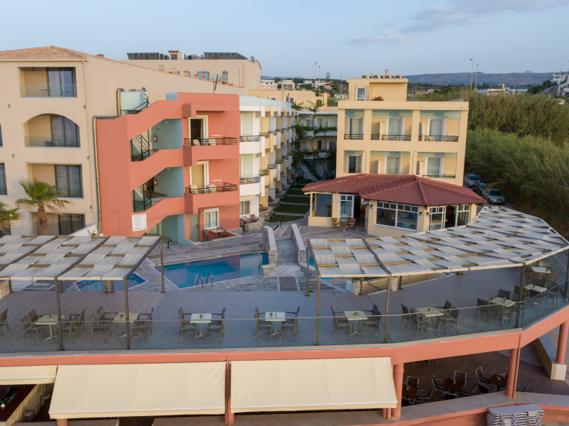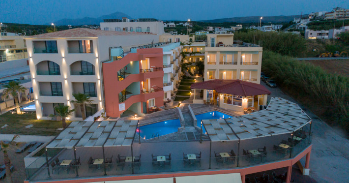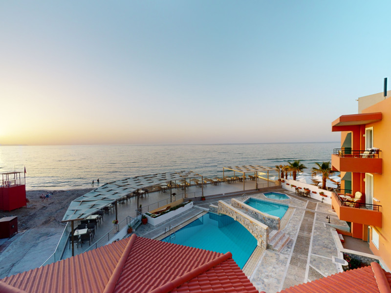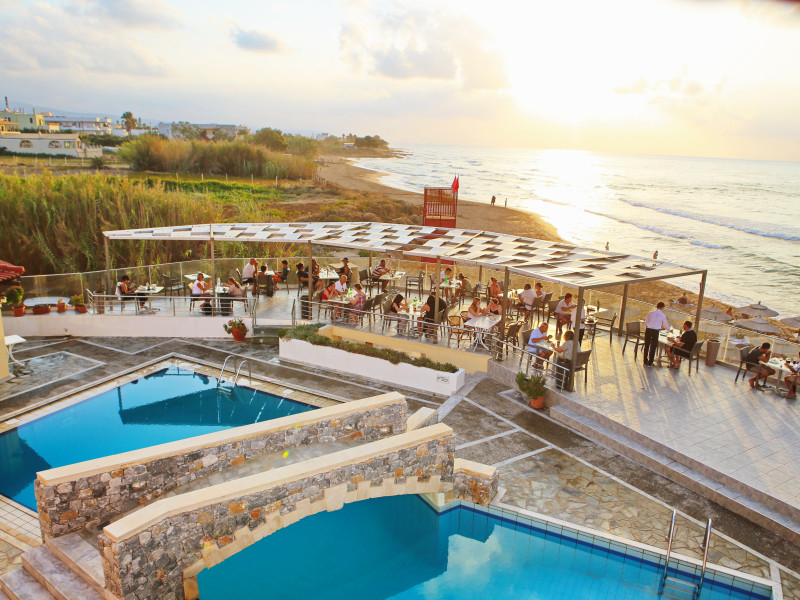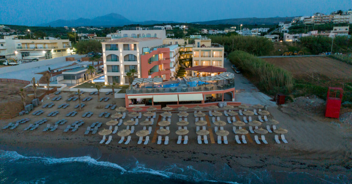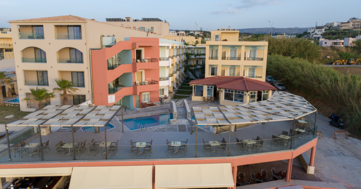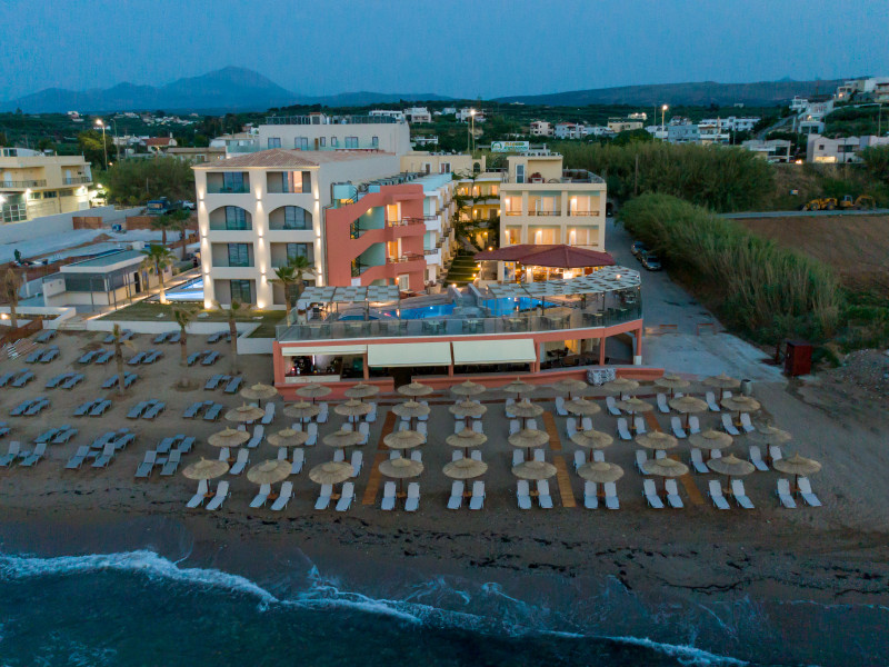 The hotel is ideally located in front of the beach of the picturesque village Sfakaki - it is only 10 minutes drive away from the city of Rethymno (9 km) and 45 minutes from the International Airport of Heraklion.