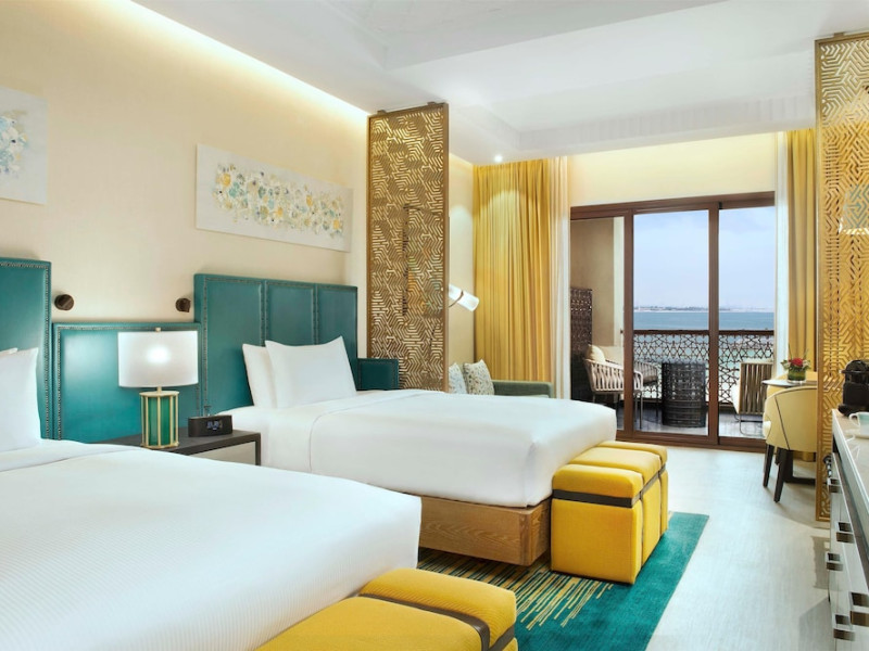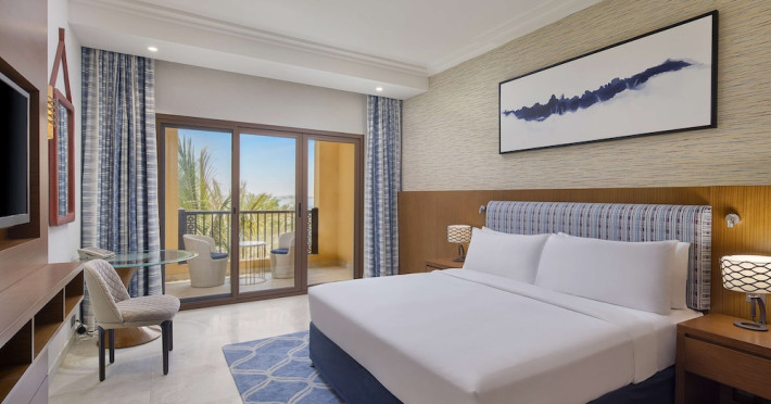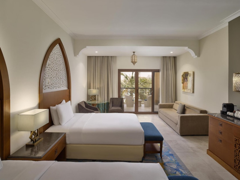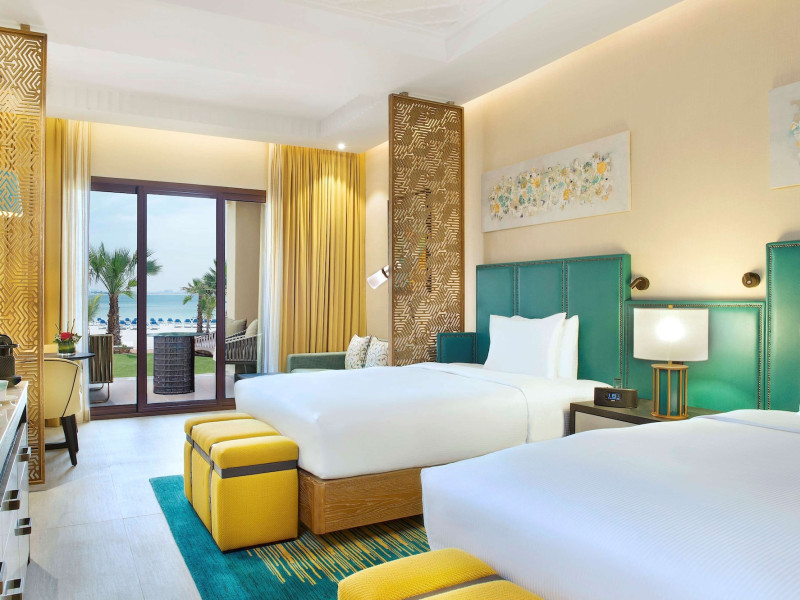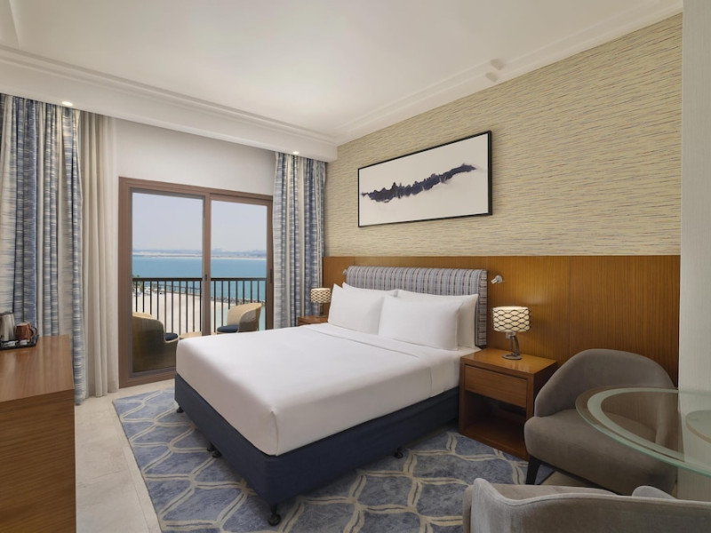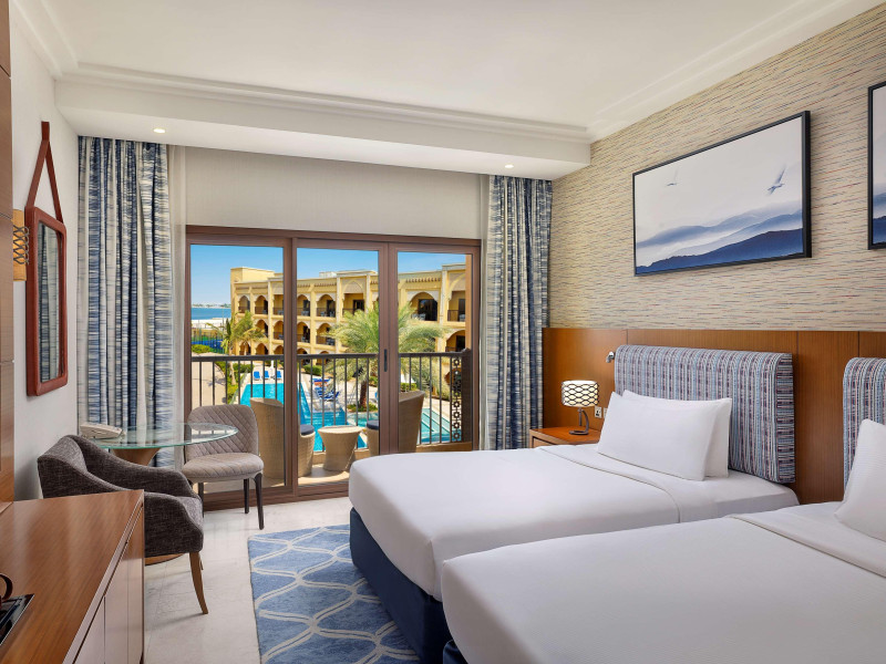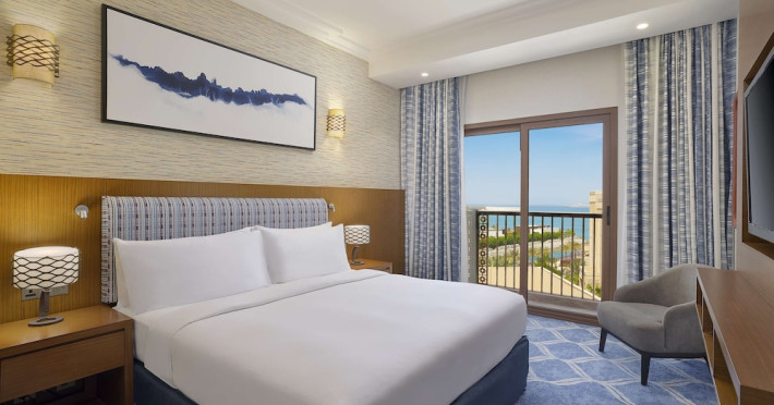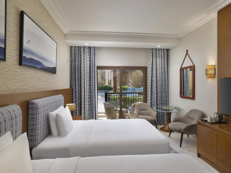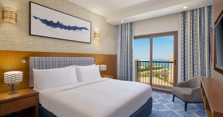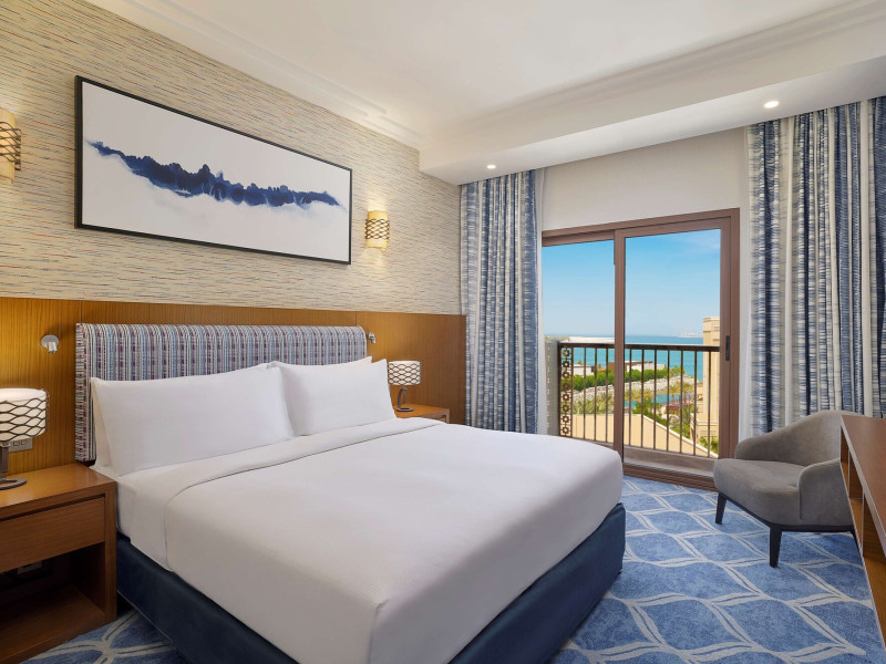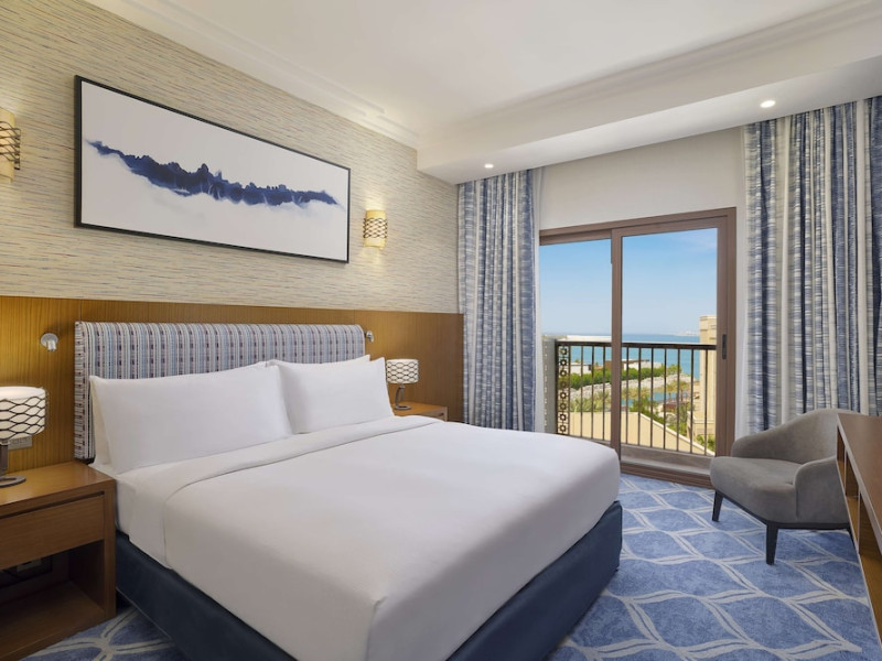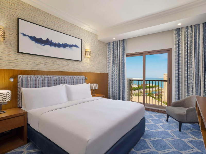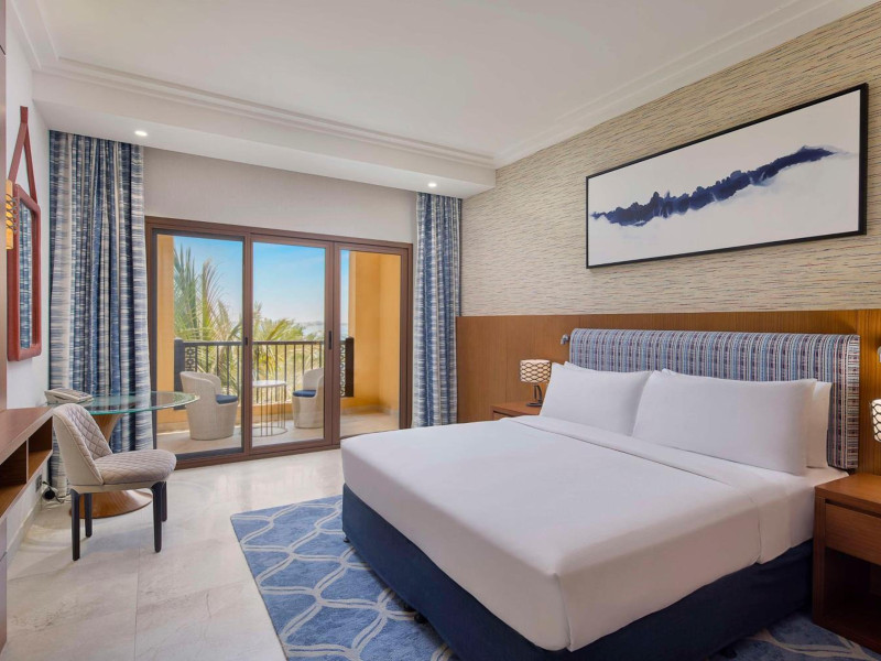 The DoubleTree by Hilton Resort & Spa Marjan Island in Ras Al Khaimah (Al Marjan Island) offers 723 air-conditioned rooms with private balconies or patios, refrigerators, MP3 docking stations, 42-inch flat-screen TVs, and complimentary Wi-Fi. Private bathrooms include showers, complimentary toiletries, and bidets. The resort boasts 650 meters of private white sandy beach, seven temperature-controlled outdoor swimming pools (including two children's pools), an indoor pool, and a floating sea pool with panoramic sea views. A full-service spa provides massages, body treatments, and facials. Dining options include 14 restaurants and bars, including an all-day dining venue, four specialty restaurants, a rooftop bar, two pool bars, a beach bar, a fruit kiosk, a lobby lounge, and a coffee shop; 24-hour room service is also available. A kids' club features a climbing wall, ball pit, video games, movies, and supervised activities, along with dedicated arcade areas for older children and an outdoor playground. A Pirate Boat Aqua Zone with water slides, sprinklers, and buckets, the largest Tarzan boat in the Middle East, two high dive boards (one 14 feet high), two water slides, and a large rope swing provide water activities. A padel tennis court is also available. Additional amenities include complimentary Wi-Fi in public areas, concierge services, babysitting (surcharge), a 24-hour business center, complimentary newspapers in the lobby, dry cleaning/laundry services, free valet parking, and a roundtrip airport shuttle (surcharge). The resort features 3,520 square feet (327 square meters) of event space, including a conference center and three meeting rooms. All-inclusive rates are available; however, charges may apply for some restaurants, special dinners and dishes, some beverages, and other amenities. Buffet breakfasts are available daily for a fee. Al Hamra Mall and Al Hamra Golf Club are within a 10-minute drive. Al Hamra Marina and Yacht Club are 7.4 mi (11.9 km) away, and Dreamland is 8.6 mi (13.9 km) away. Ras Al Khaimah Airport is a 25-minute drive from the resort. The preferred airport is Dubai International Airport (DXB). The Double Tree by Hilton Resort and Spa Marjan Island is a Tourist hotel. The nightlife/restaurants are located in the hotel.