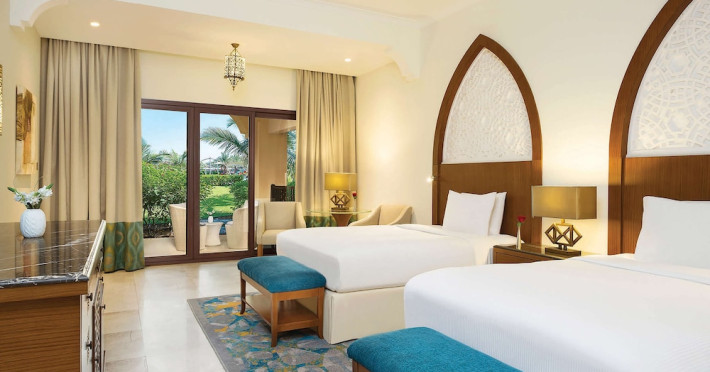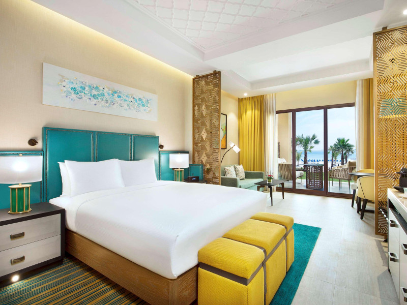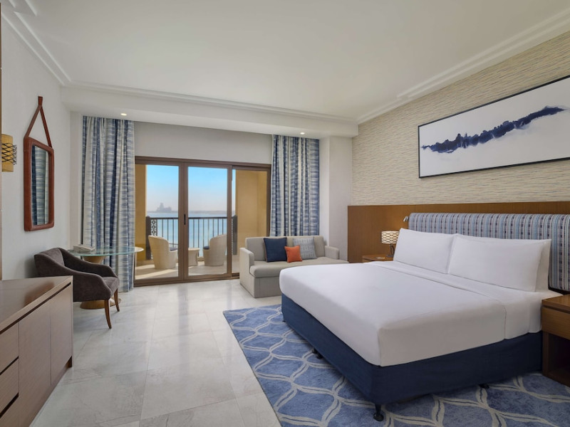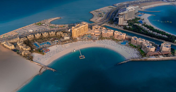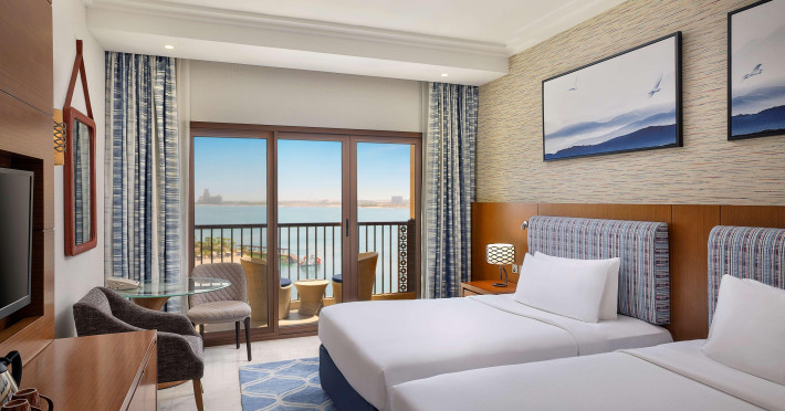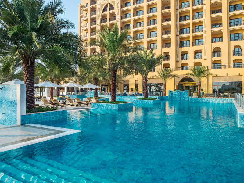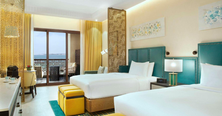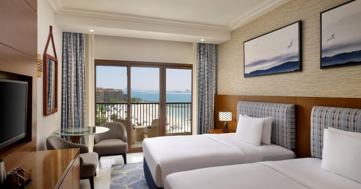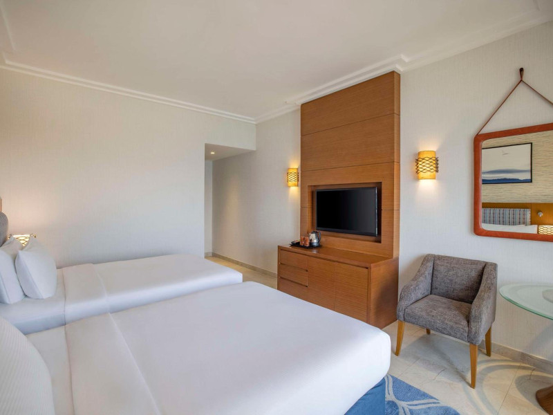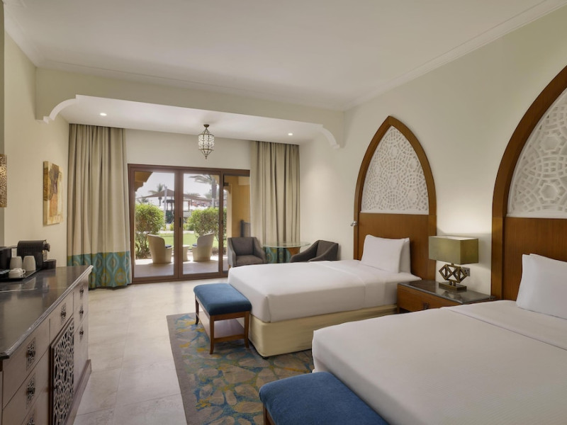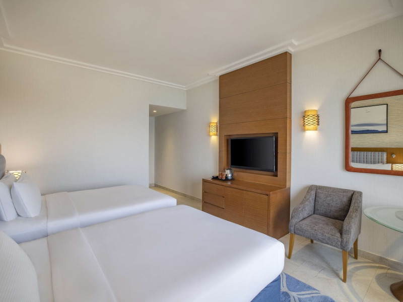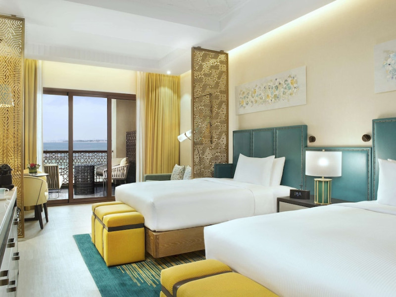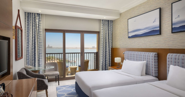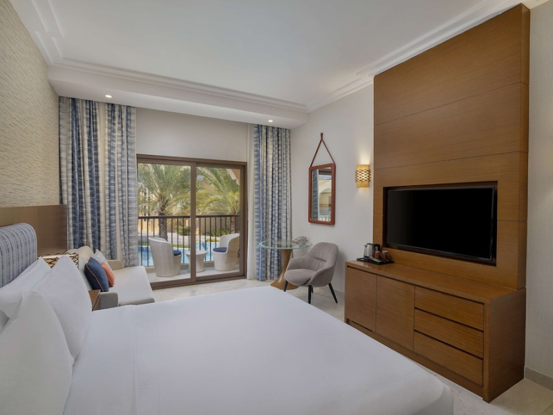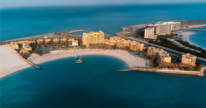 The DoubleTree by Hilton Resort & Spa Marjan Island in Ras Al Khaimah (Al Marjan Island) offers 723 air-conditioned rooms with private balconies or patios, refrigerators, MP3 docking stations, 42-inch flat-screen TVs, and complimentary Wi-Fi. Private bathrooms include showers, complimentary toiletries, and bidets. The resort boasts 650 meters of private white sandy beach, seven temperature-controlled outdoor swimming pools (including two children's pools), an indoor pool, and a floating sea pool with panoramic sea views. A full-service spa provides massages, body treatments, and facials. Dining options include 14 restaurants and bars, including an all-day dining venue, four specialty restaurants, a rooftop bar, two pool bars, a beach bar, a fruit kiosk, a lobby lounge, and a coffee shop; 24-hour room service is also available. A kids' club features a climbing wall, ball pit, video games, movies, and supervised activities, along with dedicated arcade areas for older children and an outdoor playground. A Pirate Boat Aqua Zone with water slides, sprinklers, and buckets, the largest Tarzan boat in the Middle East, two high dive boards (one 14 feet high), two water slides, and a large rope swing provide water activities. A padel tennis court is also available. Additional amenities include complimentary Wi-Fi in public areas, concierge services, babysitting (surcharge), a 24-hour business center, complimentary newspapers in the lobby, dry cleaning/laundry services, free valet parking, and a roundtrip airport shuttle (surcharge). The resort features 3,520 square feet (327 square meters) of event space, including a conference center and three meeting rooms. All-inclusive rates are available; however, charges may apply for some restaurants, special dinners and dishes, some beverages, and other amenities. Buffet breakfasts are available daily for a fee. Al Hamra Mall and Al Hamra Golf Club are within a 10-minute drive. Al Hamra Marina and Yacht Club are 7.4 mi (11.9 km) away, and Dreamland is 8.6 mi (13.9 km) away. Ras Al Khaimah Airport is a 25-minute drive from the resort. The preferred airport is Dubai International Airport (DXB). The Double Tree by Hilton Resort and Spa Marjan Island is a Tourist hotel. The nightlife/restaurants are located in the hotel.