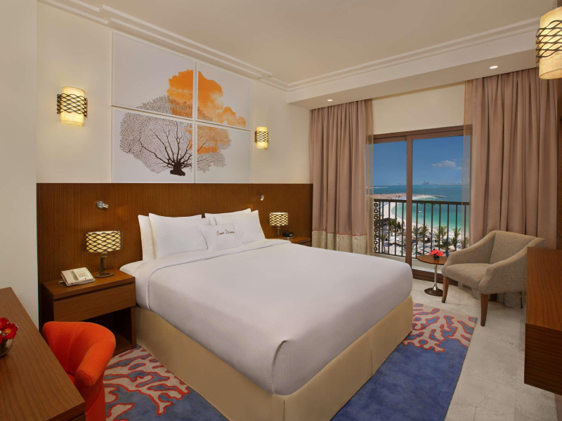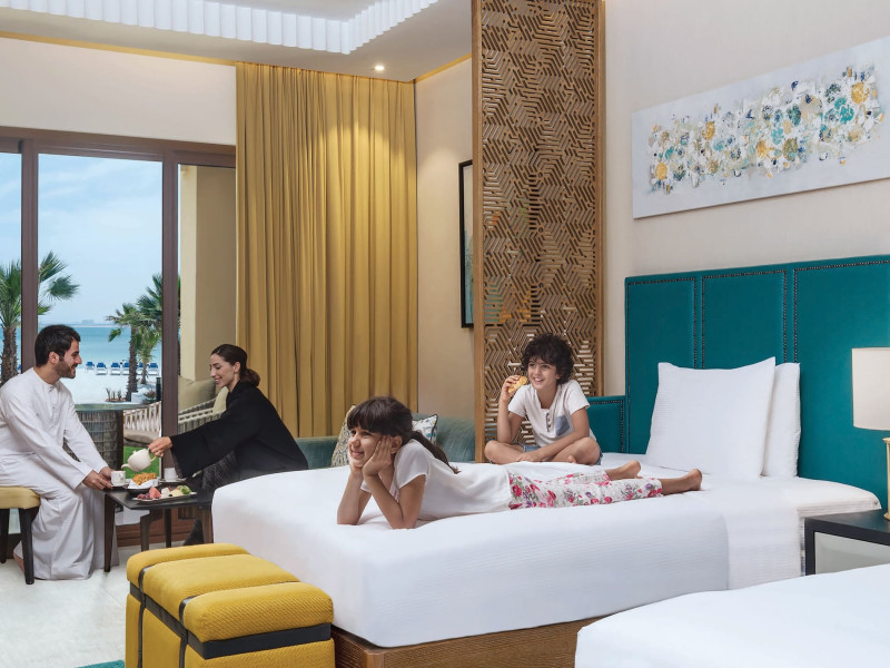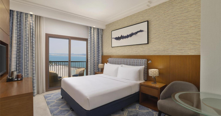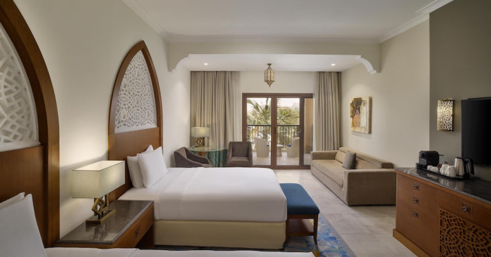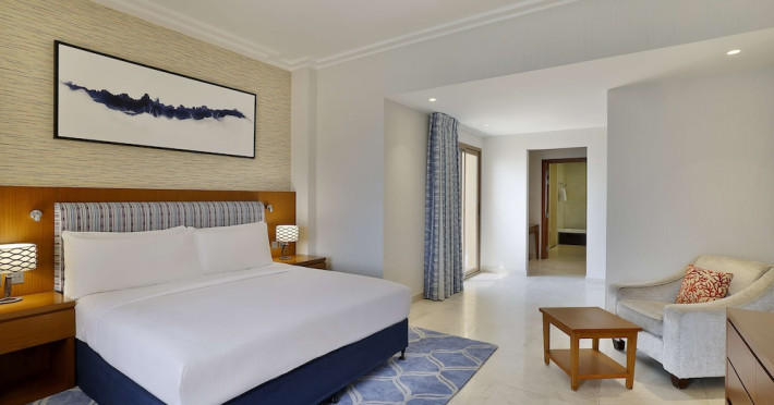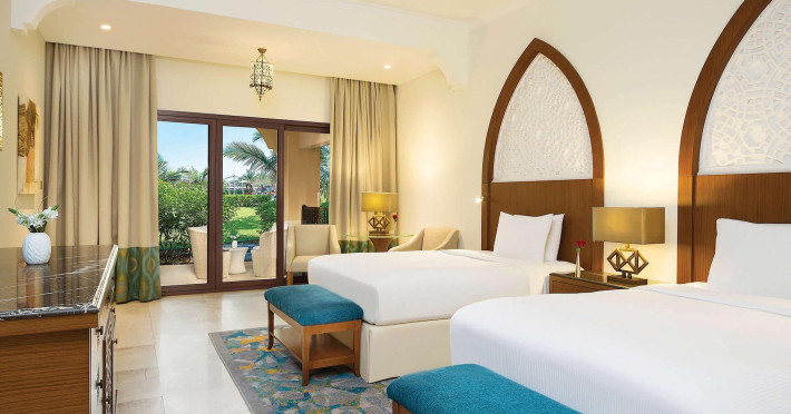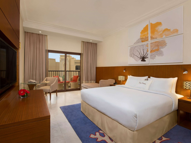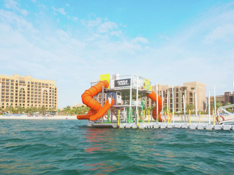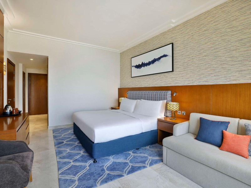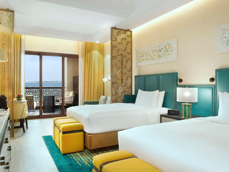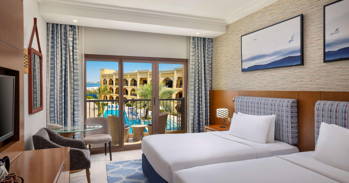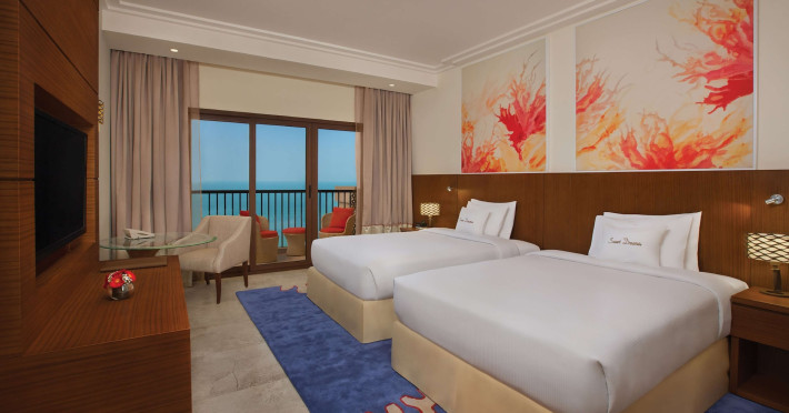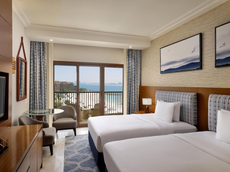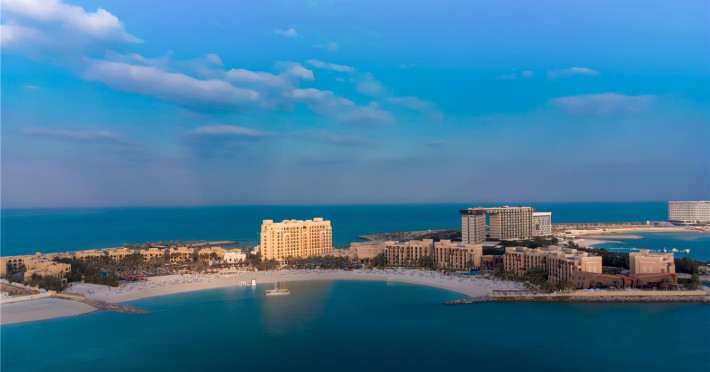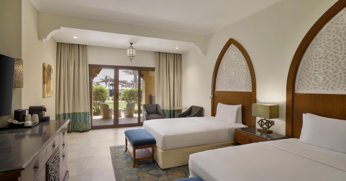 The DoubleTree by Hilton Resort & Spa Marjan Island in Ras Al Khaimah (Al Marjan Island) offers 723 air-conditioned rooms with private balconies or patios, refrigerators, MP3 docking stations, 42-inch flat-screen TVs, and complimentary Wi-Fi. Private bathrooms include showers, complimentary toiletries, and bidets. The resort boasts 650 meters of private white sandy beach, seven temperature-controlled outdoor swimming pools (including two children's pools), an indoor pool, and a floating sea pool with panoramic sea views. A full-service spa provides massages, body treatments, and facials. Dining options include 14 restaurants and bars, including an all-day dining venue, four specialty restaurants, a rooftop bar, two pool bars, a beach bar, a fruit kiosk, a lobby lounge, and a coffee shop; 24-hour room service is also available. A kids' club features a climbing wall, ball pit, video games, movies, and supervised activities, along with dedicated arcade areas for older children and an outdoor playground. A Pirate Boat Aqua Zone with water slides, sprinklers, and buckets, the largest Tarzan boat in the Middle East, two high dive boards (one 14 feet high), two water slides, and a large rope swing provide water activities. A padel tennis court is also available. Additional amenities include complimentary Wi-Fi in public areas, concierge services, babysitting (surcharge), a 24-hour business center, complimentary newspapers in the lobby, dry cleaning/laundry services, free valet parking, and a roundtrip airport shuttle (surcharge). The resort features 3,520 square feet (327 square meters) of event space, including a conference center and three meeting rooms. All-inclusive rates are available; however, charges may apply for some restaurants, special dinners and dishes, some beverages, and other amenities. Buffet breakfasts are available daily for a fee. Al Hamra Mall and Al Hamra Golf Club are within a 10-minute drive. Al Hamra Marina and Yacht Club are 7.4 mi (11.9 km) away, and Dreamland is 8.6 mi (13.9 km) away. Ras Al Khaimah Airport is a 25-minute drive from the resort. The preferred airport is Dubai International Airport (DXB). The Double Tree by Hilton Resort and Spa Marjan Island is a Tourist hotel. The nightlife/restaurants are located in the hotel.