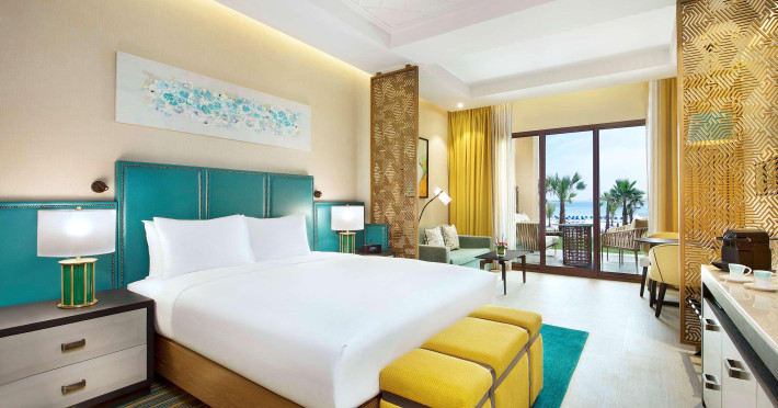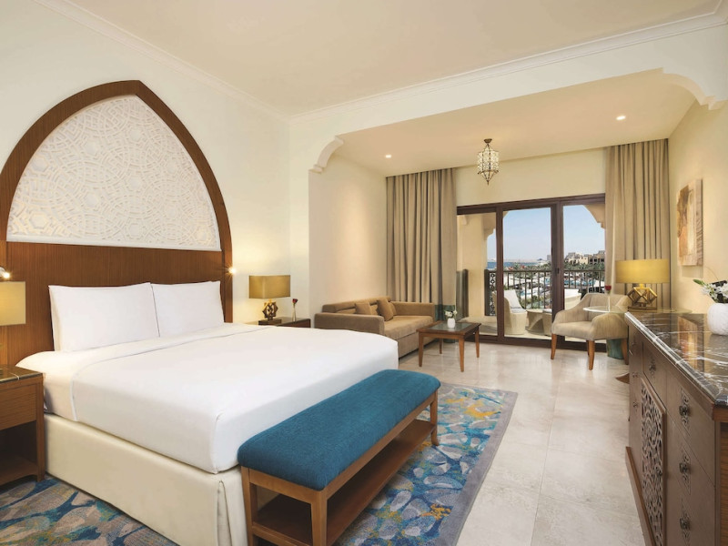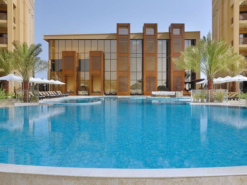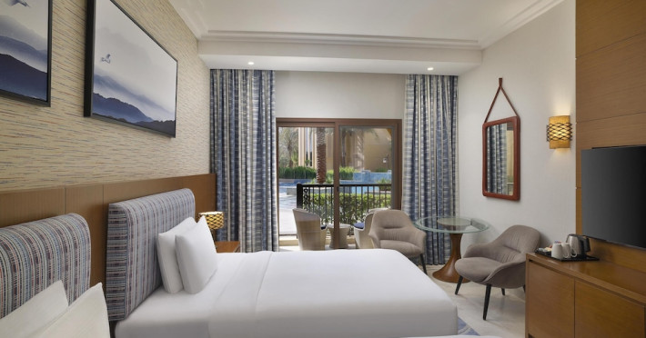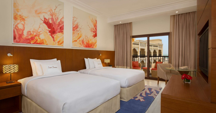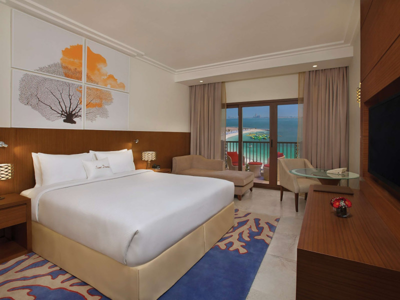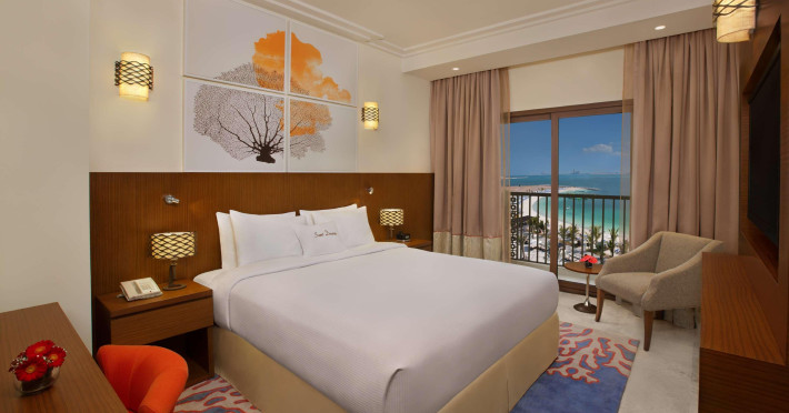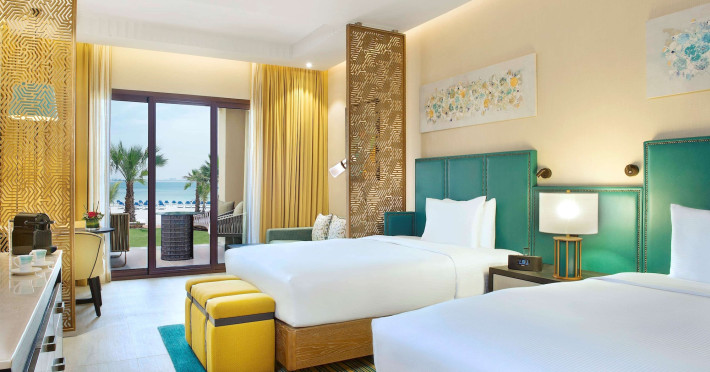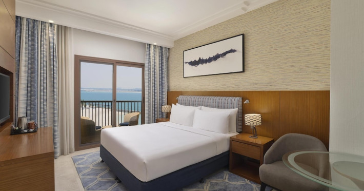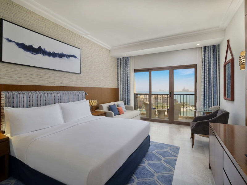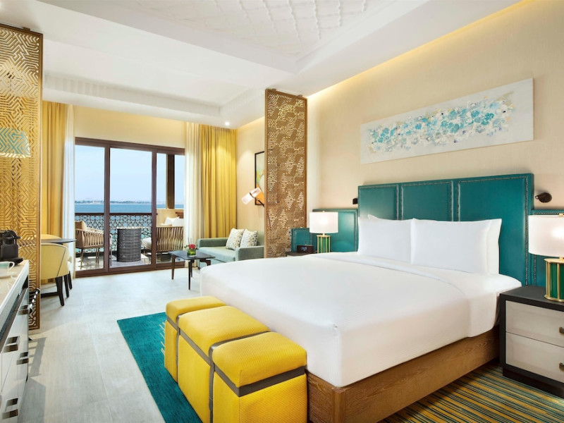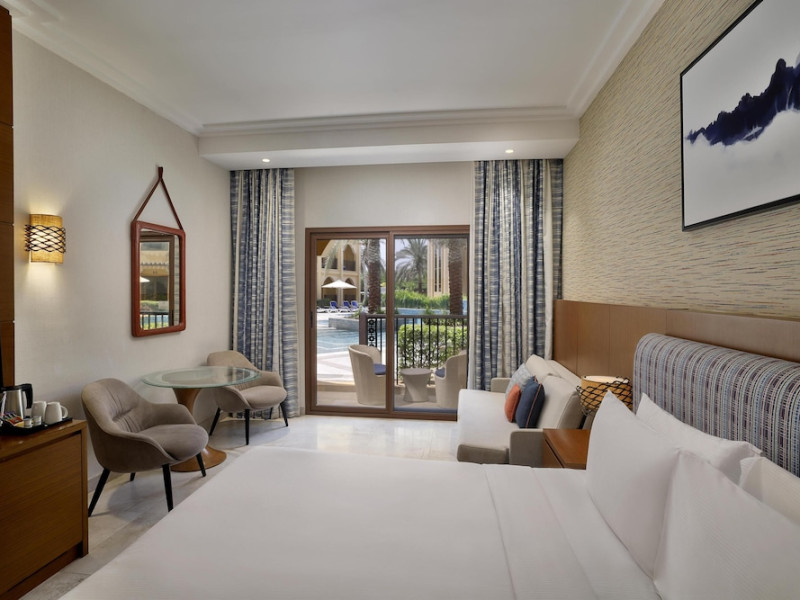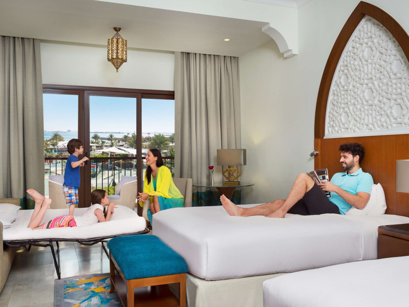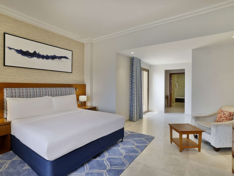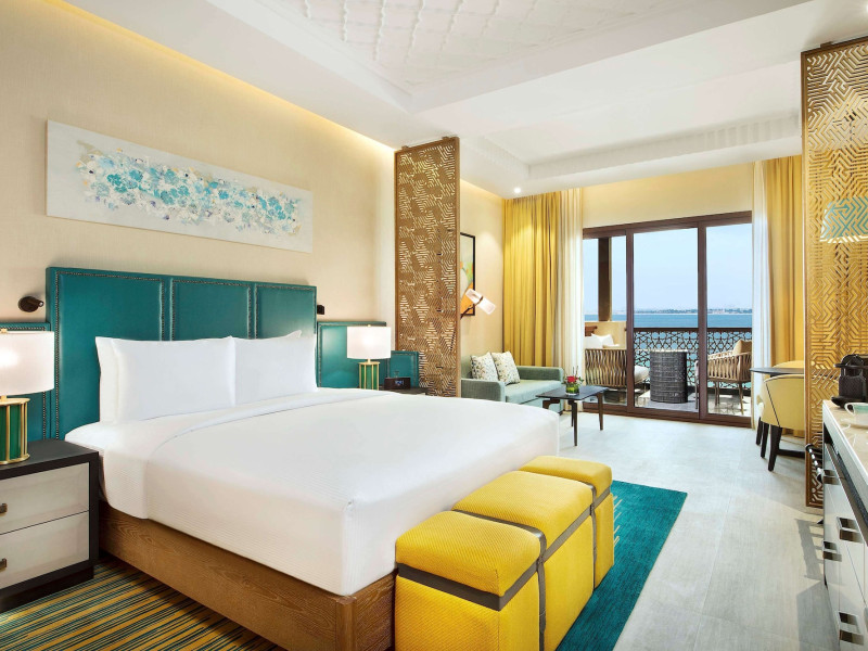 The DoubleTree by Hilton Resort & Spa Marjan Island in Ras Al Khaimah (Al Marjan Island) offers 723 air-conditioned rooms with private balconies or patios, refrigerators, MP3 docking stations, 42-inch flat-screen TVs, and complimentary Wi-Fi. Private bathrooms include showers, complimentary toiletries, and bidets. The resort boasts 650 meters of private white sandy beach, seven temperature-controlled outdoor swimming pools (including two children's pools), an indoor pool, and a floating sea pool with panoramic sea views. A full-service spa provides massages, body treatments, and facials. Dining options include 14 restaurants and bars, including an all-day dining venue, four specialty restaurants, a rooftop bar, two pool bars, a beach bar, a fruit kiosk, a lobby lounge, and a coffee shop; 24-hour room service is also available. A kids' club features a climbing wall, ball pit, video games, movies, and supervised activities, along with dedicated arcade areas for older children and an outdoor playground. A Pirate Boat Aqua Zone with water slides, sprinklers, and buckets, the largest Tarzan boat in the Middle East, two high dive boards (one 14 feet high), two water slides, and a large rope swing provide water activities. A padel tennis court is also available. Additional amenities include complimentary Wi-Fi in public areas, concierge services, babysitting (surcharge), a 24-hour business center, complimentary newspapers in the lobby, dry cleaning/laundry services, free valet parking, and a roundtrip airport shuttle (surcharge). The resort features 3,520 square feet (327 square meters) of event space, including a conference center and three meeting rooms. All-inclusive rates are available; however, charges may apply for some restaurants, special dinners and dishes, some beverages, and other amenities. Buffet breakfasts are available daily for a fee. Al Hamra Mall and Al Hamra Golf Club are within a 10-minute drive. Al Hamra Marina and Yacht Club are 7.4 mi (11.9 km) away, and Dreamland is 8.6 mi (13.9 km) away. Ras Al Khaimah Airport is a 25-minute drive from the resort. The preferred airport is Dubai International Airport (DXB). The Double Tree by Hilton Resort and Spa Marjan Island is a Tourist hotel. The nightlife/restaurants are located in the hotel.