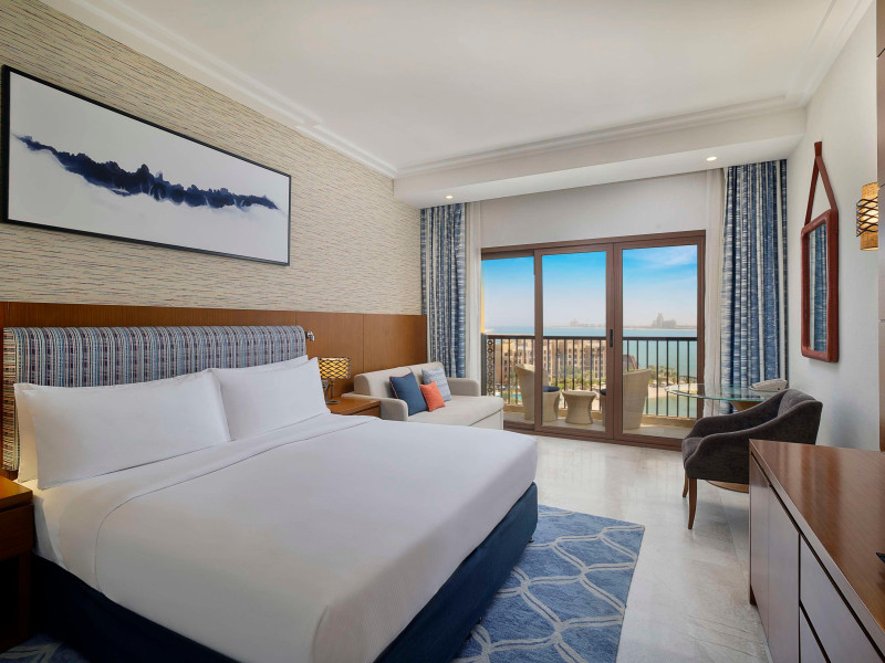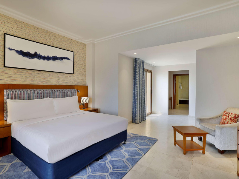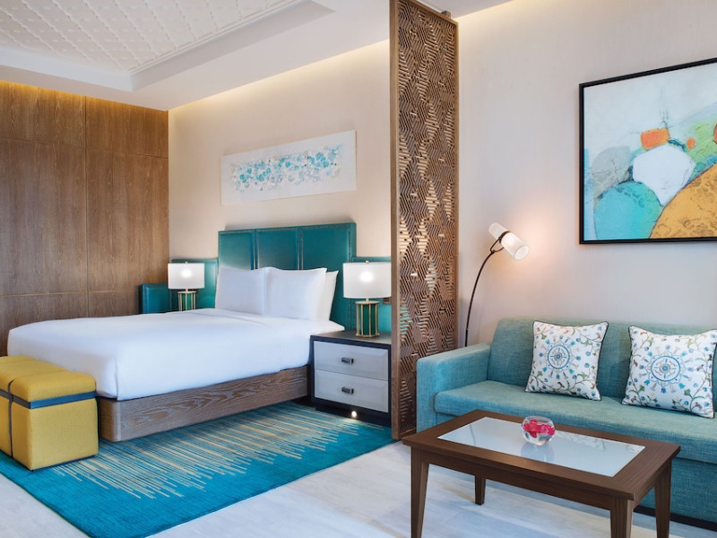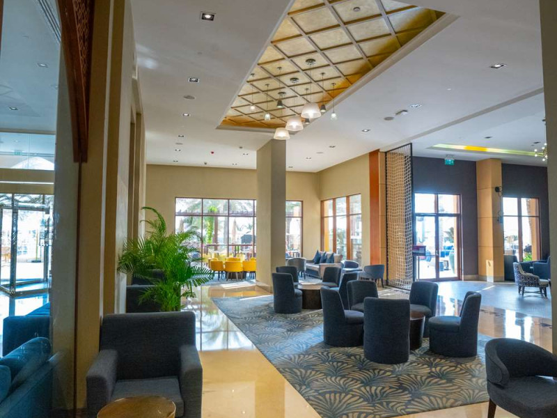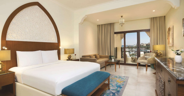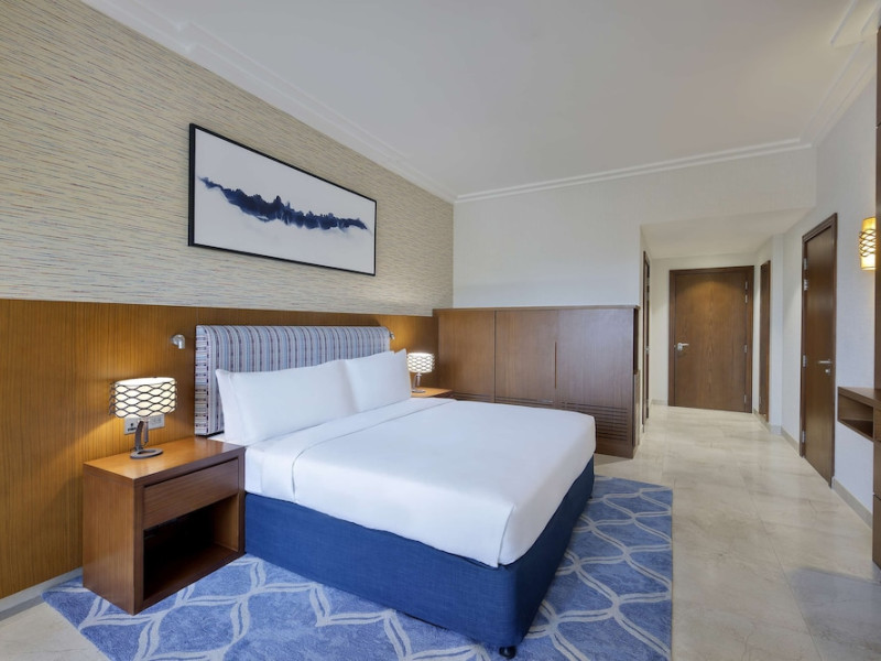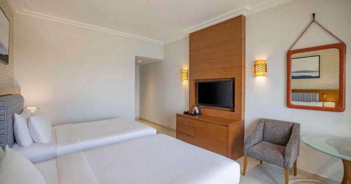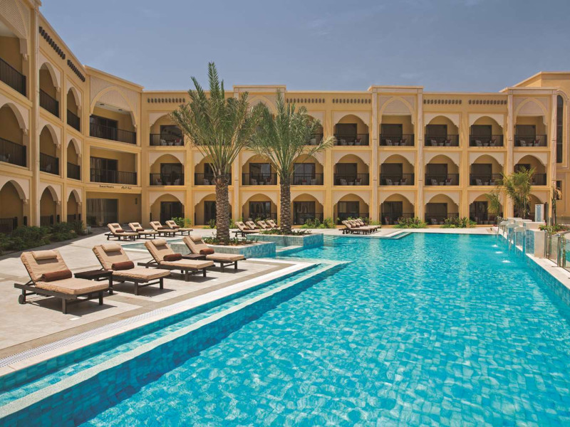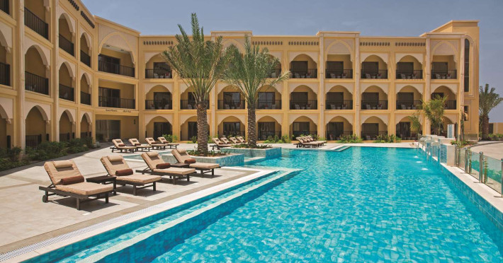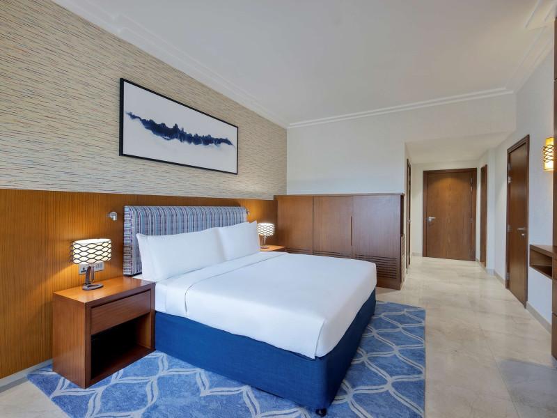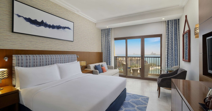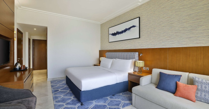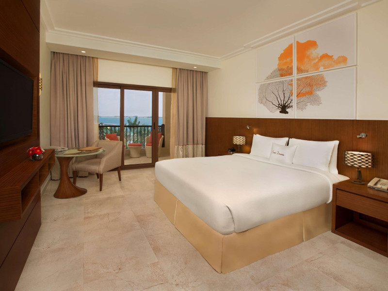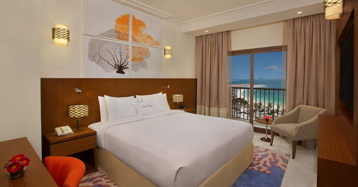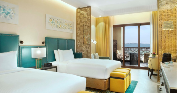 The DoubleTree by Hilton Resort & Spa Marjan Island in Ras Al Khaimah (Al Marjan Island) offers 723 air-conditioned rooms with private balconies or patios, refrigerators, MP3 docking stations, 42-inch flat-screen TVs, and complimentary Wi-Fi. Private bathrooms include showers, complimentary toiletries, and bidets. The resort boasts 650 meters of private white sandy beach, seven temperature-controlled outdoor swimming pools (including two children's pools), an indoor pool, and a floating sea pool with panoramic sea views. A full-service spa provides massages, body treatments, and facials. Dining options include 14 restaurants and bars, including an all-day dining venue, four specialty restaurants, a rooftop bar, two pool bars, a beach bar, a fruit kiosk, a lobby lounge, and a coffee shop; 24-hour room service is also available. A kids' club features a climbing wall, ball pit, video games, movies, and supervised activities, along with dedicated arcade areas for older children and an outdoor playground. A Pirate Boat Aqua Zone with water slides, sprinklers, and buckets, the largest Tarzan boat in the Middle East, two high dive boards (one 14 feet high), two water slides, and a large rope swing provide water activities. A padel tennis court is also available. Additional amenities include complimentary Wi-Fi in public areas, concierge services, babysitting (surcharge), a 24-hour business center, complimentary newspapers in the lobby, dry cleaning/laundry services, free valet parking, and a roundtrip airport shuttle (surcharge). The resort features 3,520 square feet (327 square meters) of event space, including a conference center and three meeting rooms. All-inclusive rates are available; however, charges may apply for some restaurants, special dinners and dishes, some beverages, and other amenities. Buffet breakfasts are available daily for a fee. Al Hamra Mall and Al Hamra Golf Club are within a 10-minute drive. Al Hamra Marina and Yacht Club are 7.4 mi (11.9 km) away, and Dreamland is 8.6 mi (13.9 km) away. Ras Al Khaimah Airport is a 25-minute drive from the resort. The preferred airport is Dubai International Airport (DXB). The Double Tree by Hilton Resort and Spa Marjan Island is a Tourist hotel. The nightlife/restaurants are located in the hotel.