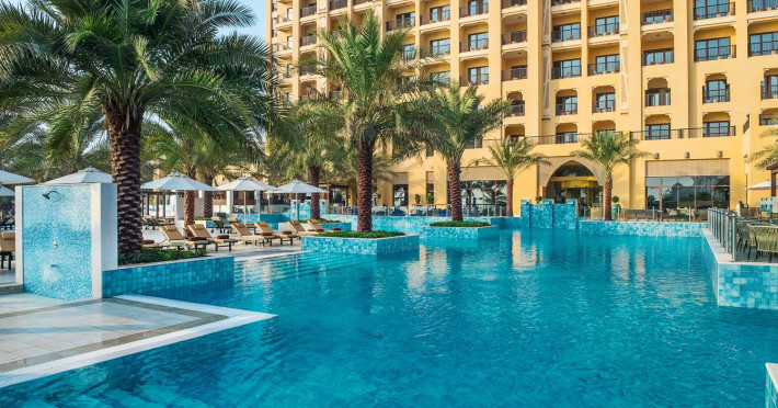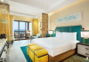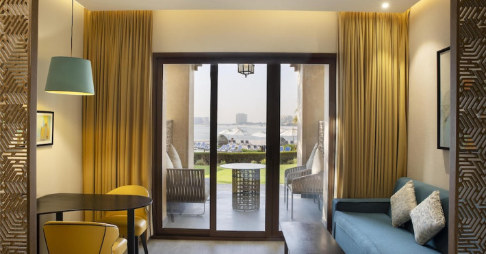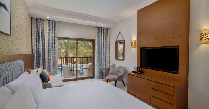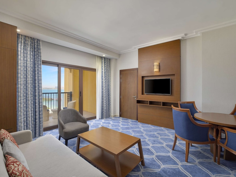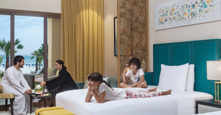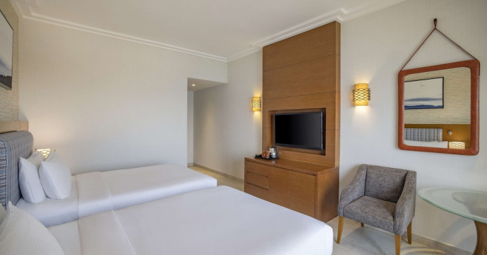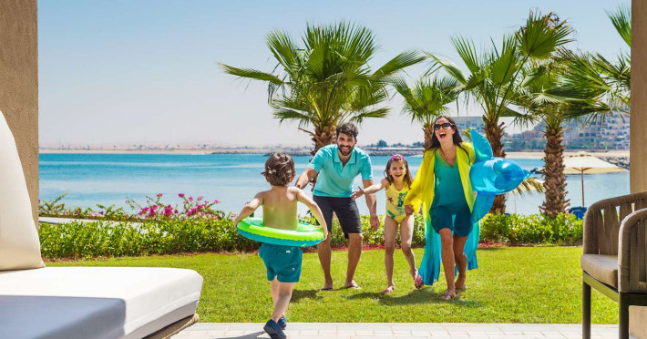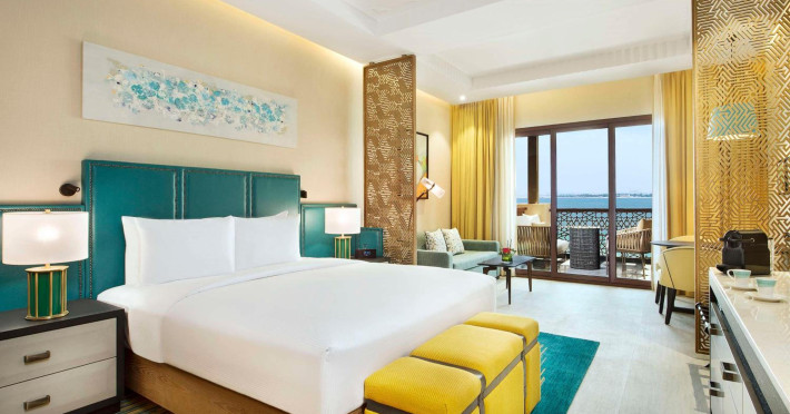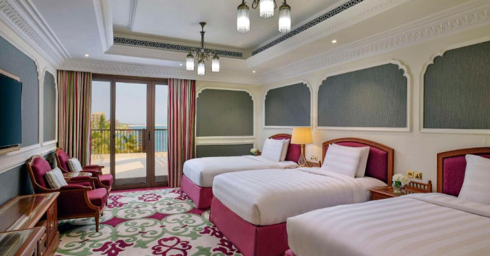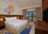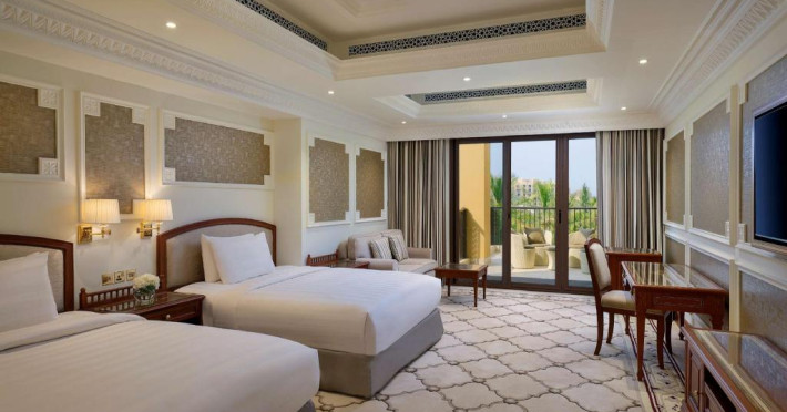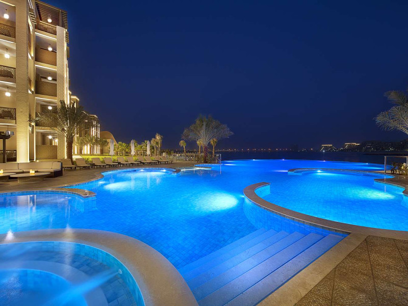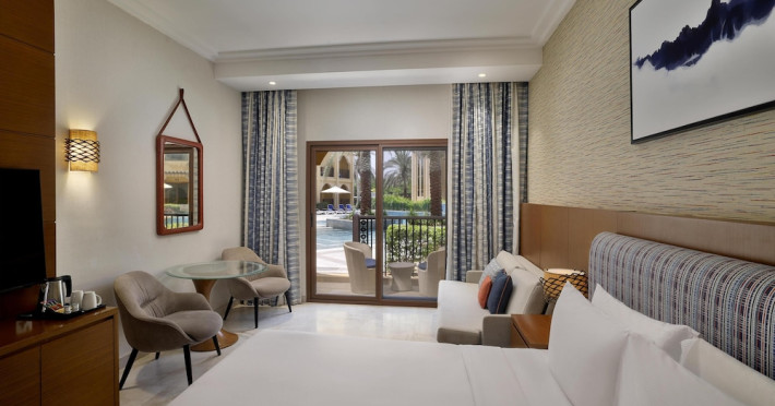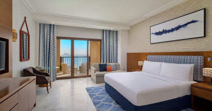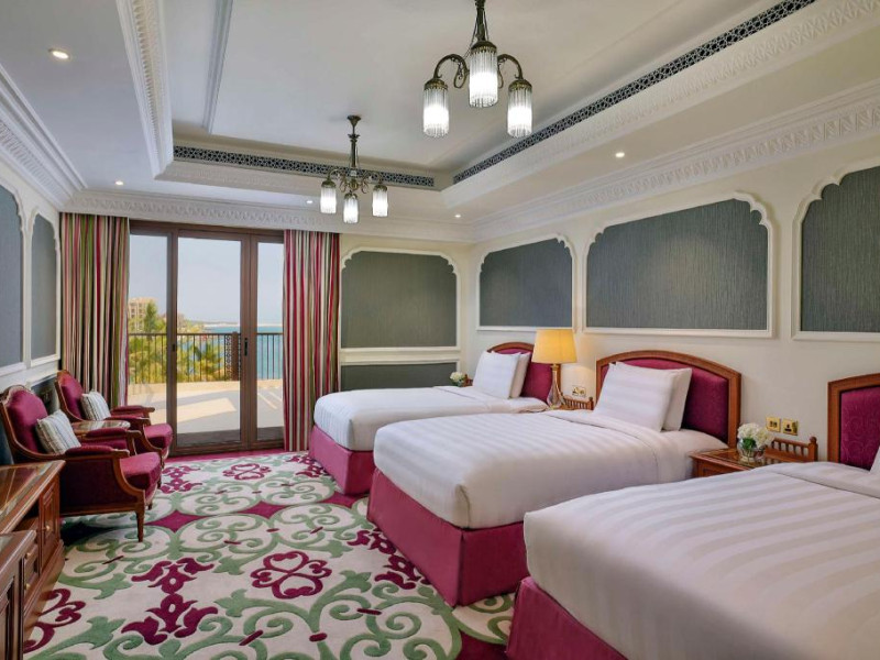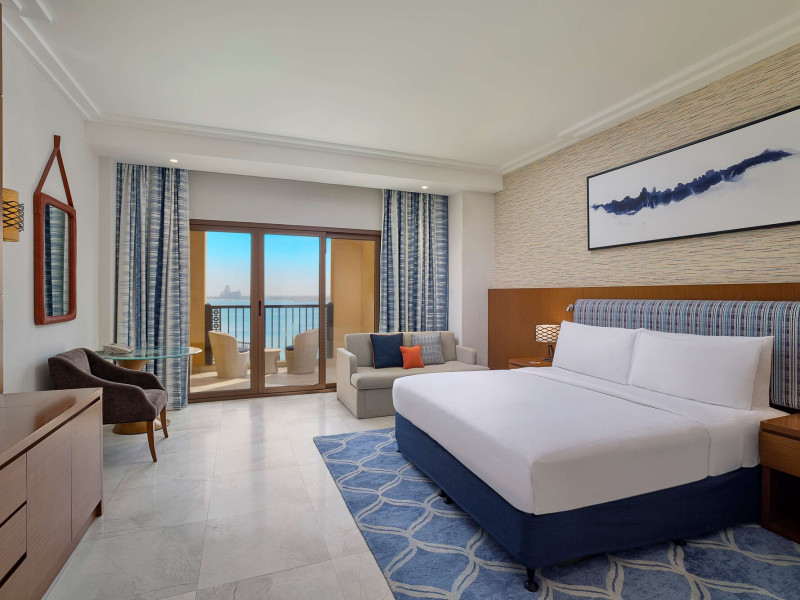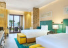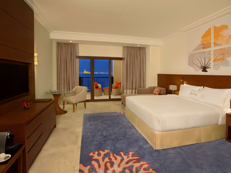 The DoubleTree by Hilton Resort & Spa Marjan Island in Ras Al Khaimah (Al Marjan Island) offers 723 air-conditioned rooms with private balconies or patios, refrigerators, MP3 docking stations, 42-inch flat-screen TVs, and complimentary Wi-Fi. Private bathrooms include showers, complimentary toiletries, and bidets. The resort boasts 650 meters of private white sandy beach, seven temperature-controlled outdoor swimming pools (including two children's pools), an indoor pool, and a floating sea pool with panoramic sea views. A full-service spa provides massages, body treatments, and facials. Dining options include 14 restaurants and bars, including an all-day dining venue, four specialty restaurants, a rooftop bar, two pool bars, a beach bar, a fruit kiosk, a lobby lounge, and a coffee shop; 24-hour room service is also available. A kids' club features a climbing wall, ball pit, video games, movies, and supervised activities, along with dedicated arcade areas for older children and an outdoor playground. A Pirate Boat Aqua Zone with water slides, sprinklers, and buckets, the largest Tarzan boat in the Middle East, two high dive boards (one 14 feet high), two water slides, and a large rope swing provide water activities. A padel tennis court is also available. Additional amenities include complimentary Wi-Fi in public areas, concierge services, babysitting (surcharge), a 24-hour business center, complimentary newspapers in the lobby, dry cleaning/laundry services, free valet parking, and a roundtrip airport shuttle (surcharge). The resort features 3,520 square feet (327 square meters) of event space, including a conference center and three meeting rooms. All-inclusive rates are available; however, charges may apply for some restaurants, special dinners and dishes, some beverages, and other amenities. Buffet breakfasts are available daily for a fee. Al Hamra Mall and Al Hamra Golf Club are within a 10-minute drive. Al Hamra Marina and Yacht Club are 7.4 mi (11.9 km) away, and Dreamland is 8.6 mi (13.9 km) away. Ras Al Khaimah Airport is a 25-minute drive from the resort. The preferred airport is Dubai International Airport (DXB). The Double Tree by Hilton Resort and Spa Marjan Island is a Tourist hotel. The nightlife/restaurants are located in the hotel.