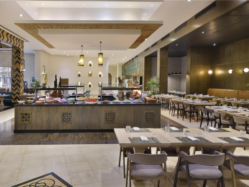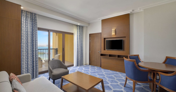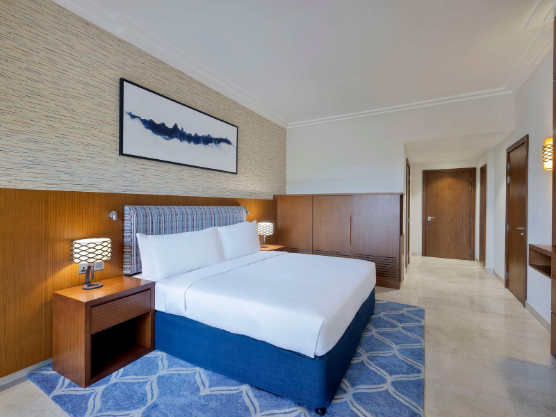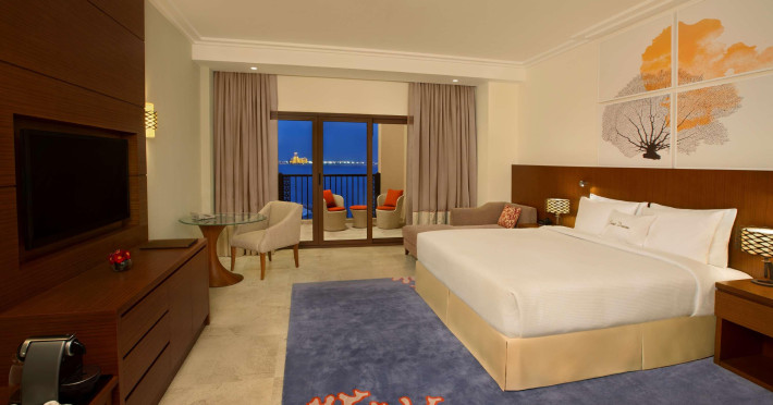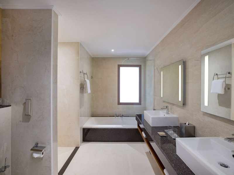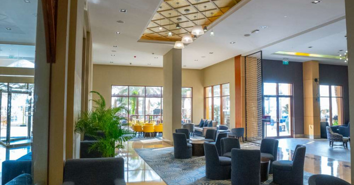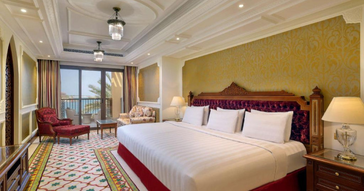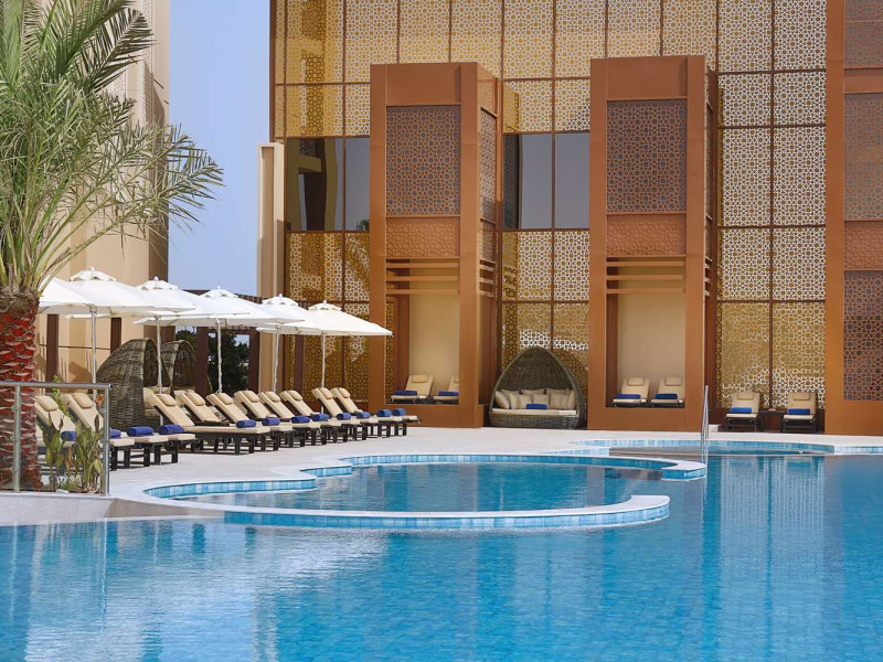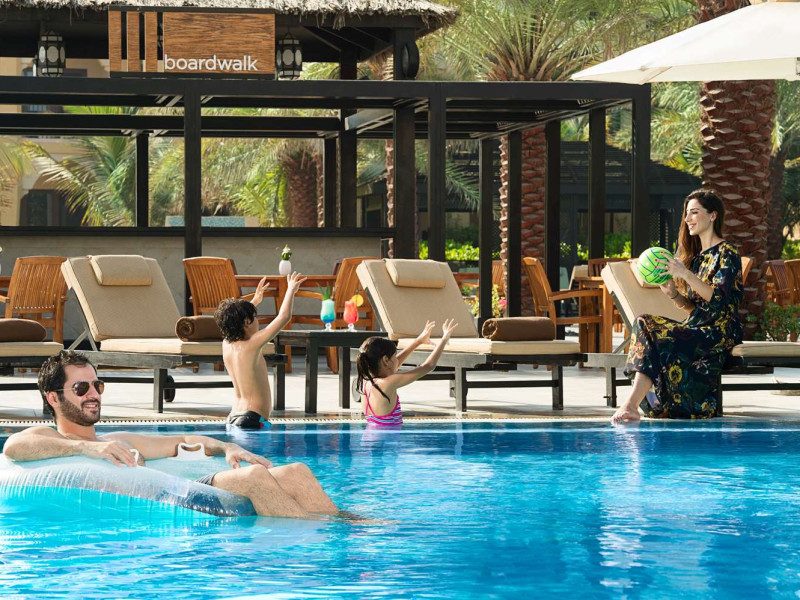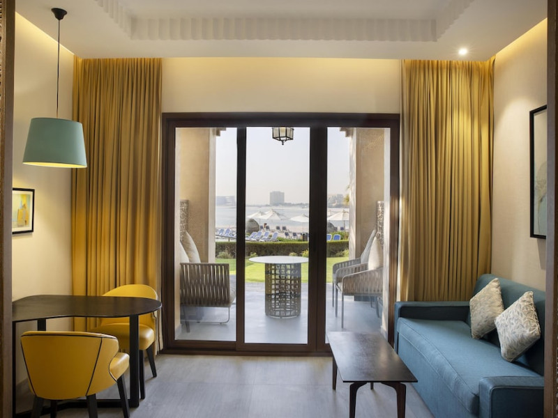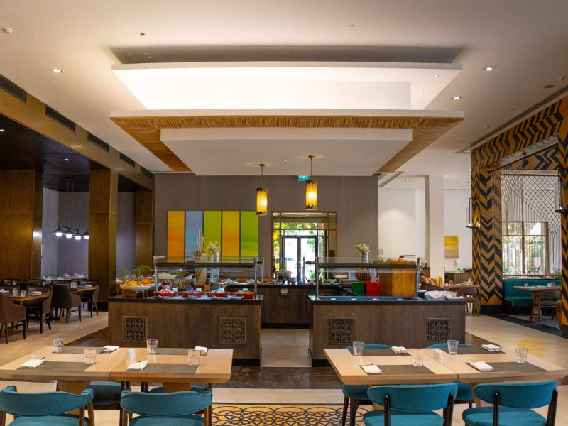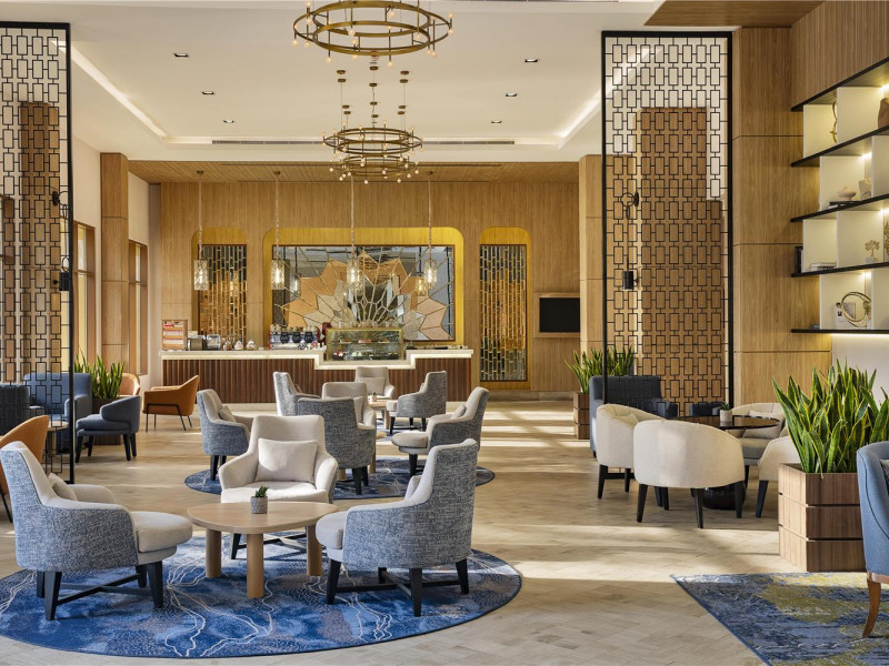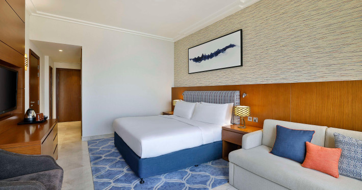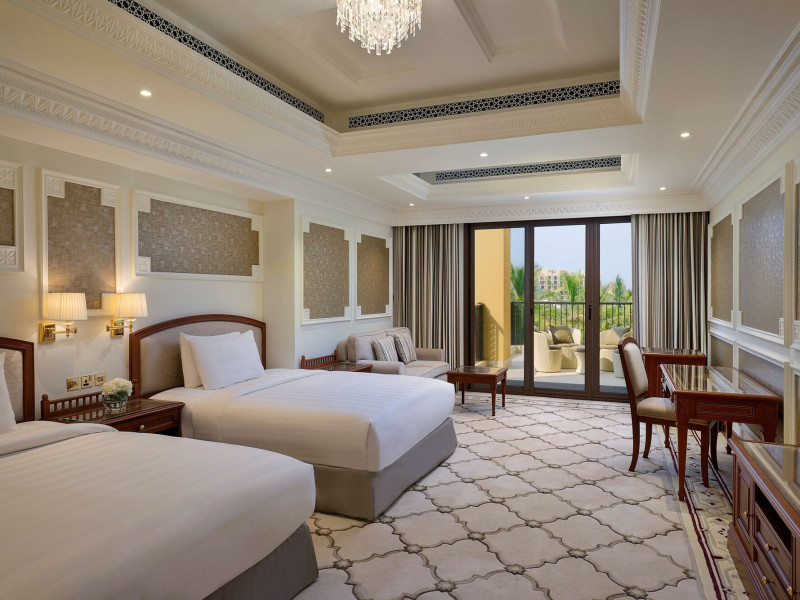 The DoubleTree by Hilton Resort & Spa Marjan Island in Ras Al Khaimah (Al Marjan Island) offers 723 air-conditioned rooms with private balconies or patios, refrigerators, MP3 docking stations, 42-inch flat-screen TVs, and complimentary Wi-Fi. Private bathrooms include showers, complimentary toiletries, and bidets. The resort boasts 650 meters of private white sandy beach, seven temperature-controlled outdoor swimming pools (including two children's pools), an indoor pool, and a floating sea pool with panoramic sea views. A full-service spa provides massages, body treatments, and facials. Dining options include 14 restaurants and bars, including an all-day dining venue, four specialty restaurants, a rooftop bar, two pool bars, a beach bar, a fruit kiosk, a lobby lounge, and a coffee shop; 24-hour room service is also available. A kids' club features a climbing wall, ball pit, video games, movies, and supervised activities, along with dedicated arcade areas for older children and an outdoor playground. A Pirate Boat Aqua Zone with water slides, sprinklers, and buckets, the largest Tarzan boat in the Middle East, two high dive boards (one 14 feet high), two water slides, and a large rope swing provide water activities. A padel tennis court is also available. Additional amenities include complimentary Wi-Fi in public areas, concierge services, babysitting (surcharge), a 24-hour business center, complimentary newspapers in the lobby, dry cleaning/laundry services, free valet parking, and a roundtrip airport shuttle (surcharge). The resort features 3,520 square feet (327 square meters) of event space, including a conference center and three meeting rooms. All-inclusive rates are available; however, charges may apply for some restaurants, special dinners and dishes, some beverages, and other amenities. Buffet breakfasts are available daily for a fee. Al Hamra Mall and Al Hamra Golf Club are within a 10-minute drive. Al Hamra Marina and Yacht Club are 7.4 mi (11.9 km) away, and Dreamland is 8.6 mi (13.9 km) away. Ras Al Khaimah Airport is a 25-minute drive from the resort. The preferred airport is Dubai International Airport (DXB). The Double Tree by Hilton Resort and Spa Marjan Island is a Tourist hotel. The nightlife/restaurants are located in the hotel.