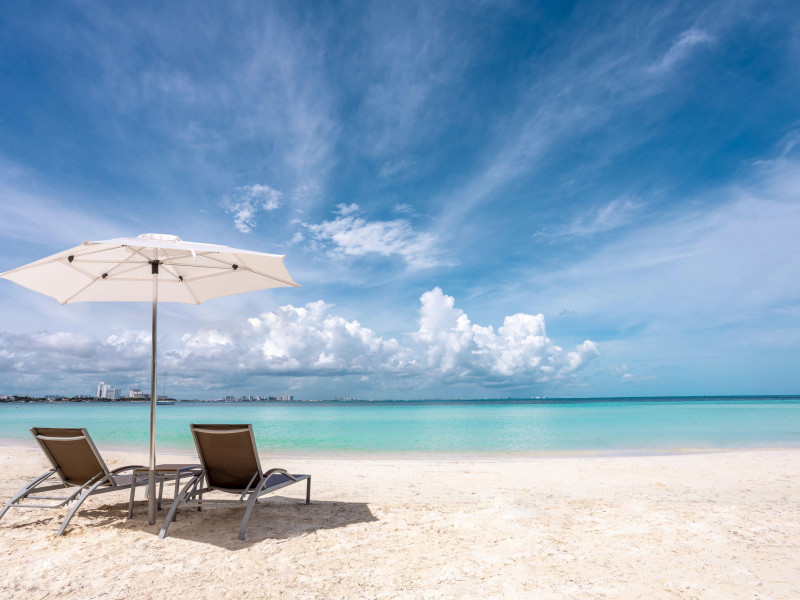 Plaja cu nisip chiar langa hotel, sezlonguri si umbrele gratuite.