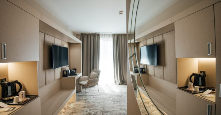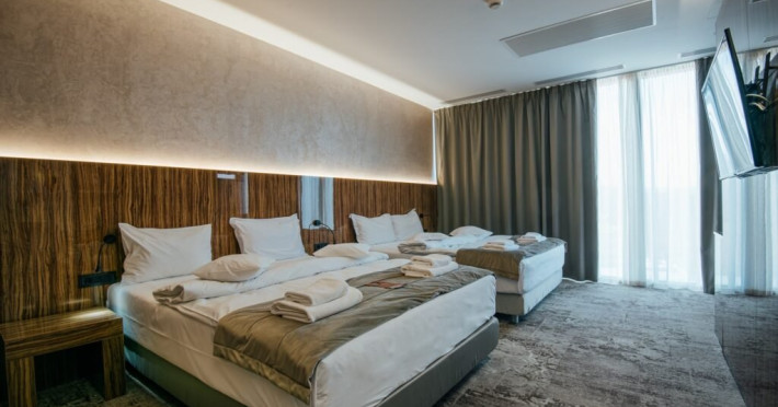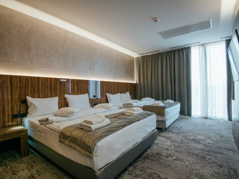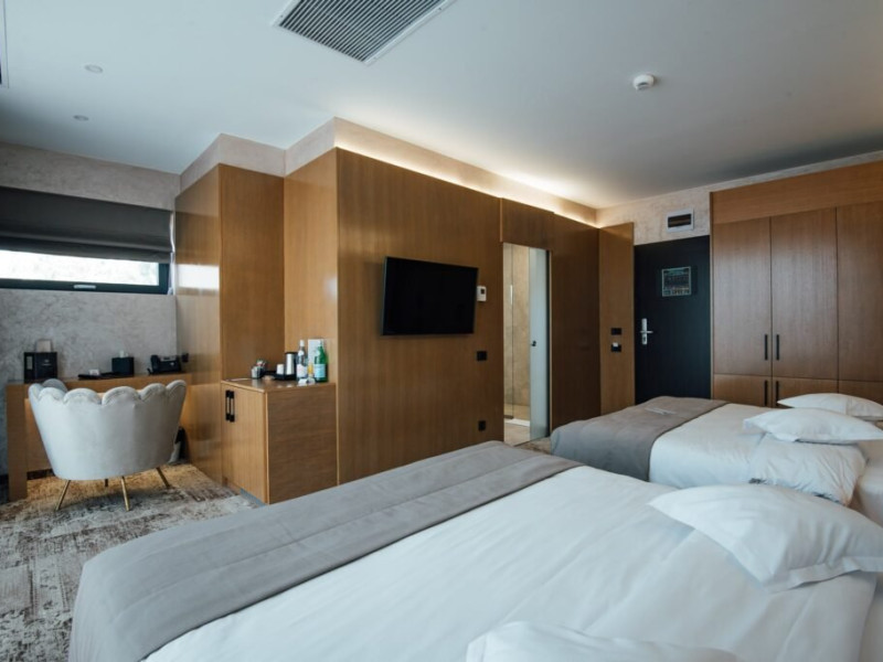Camera Family - doata cu doua paturi king size, saltele premium, aer conditionat, baie cu dus, halate de baie, uscator de par, minibar seif, frigider, fierbator apa, expressor cafea. Maxim 4 persoane. Unele camere au balcon.