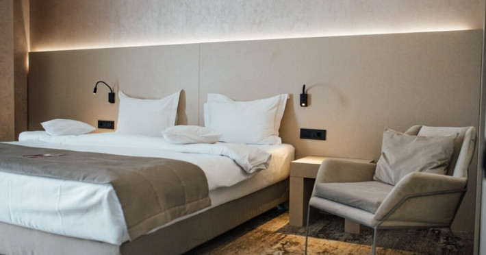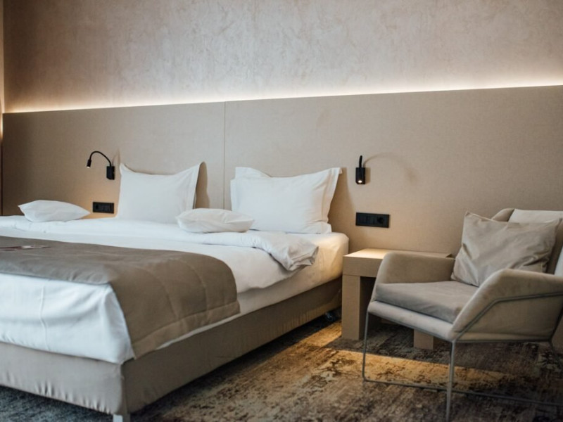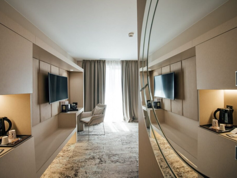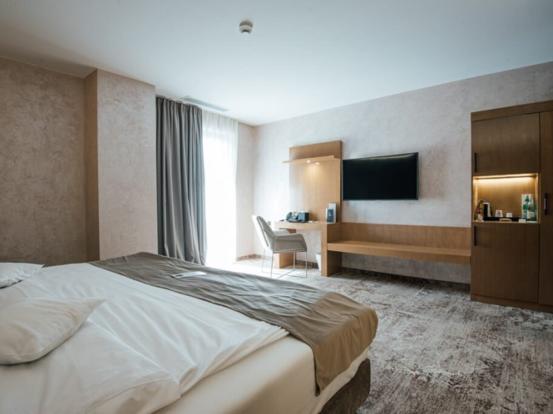 DESCRIERE CAMERE: Camera dublastandard - doata cu pat matrimonial, saltele premium, aer conditionat, baie cu dus, halate de baie, uscator de par, minibar seif. Maxim 2 persoane.
