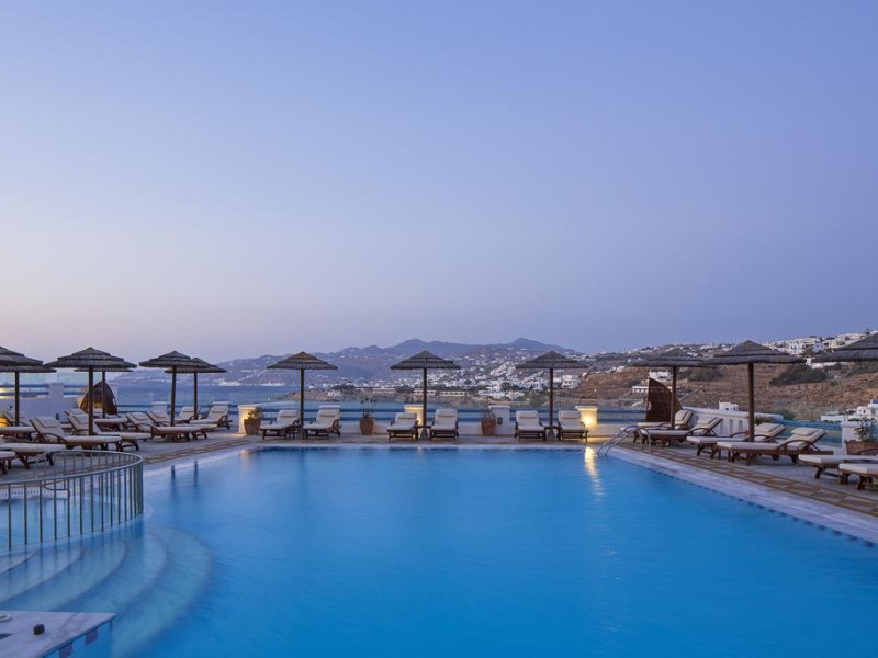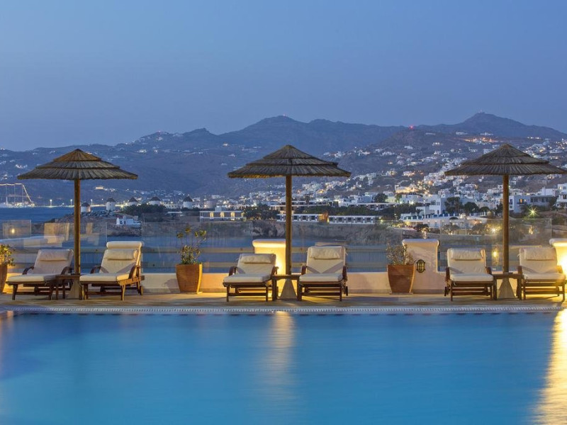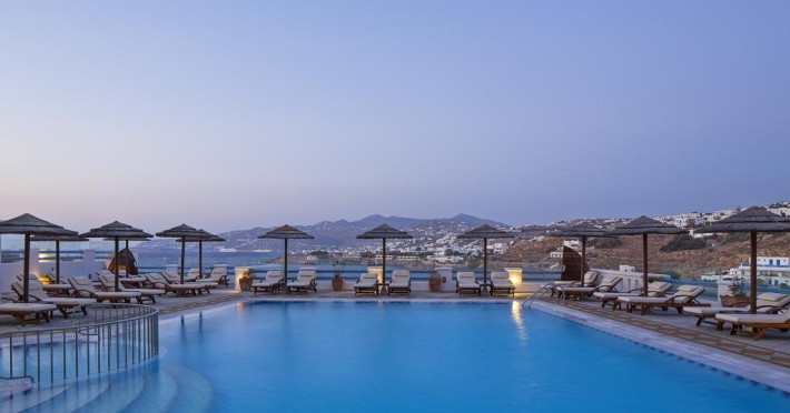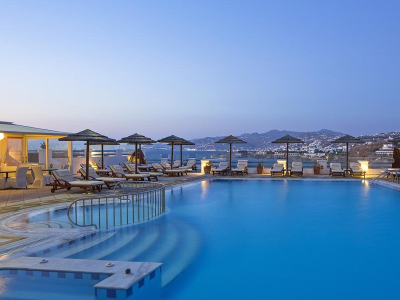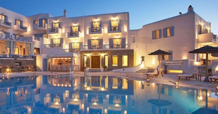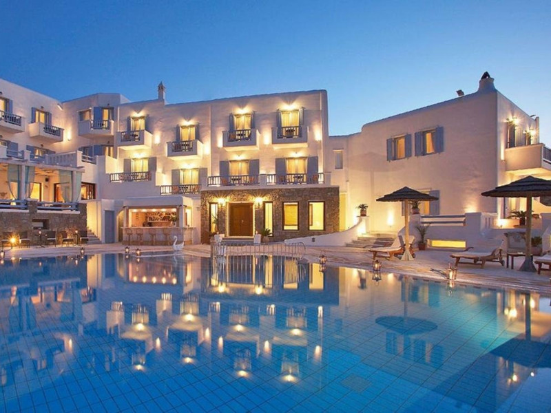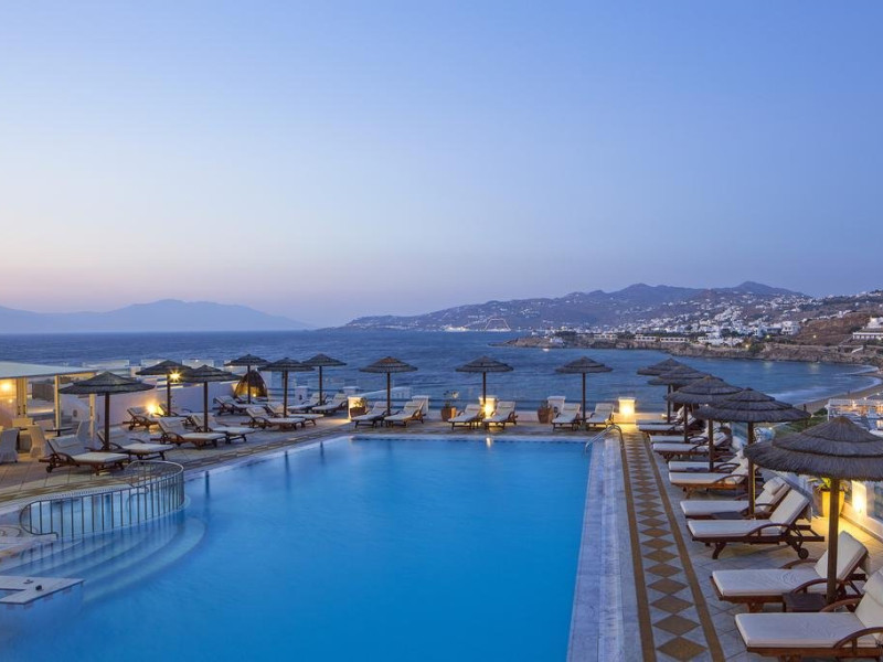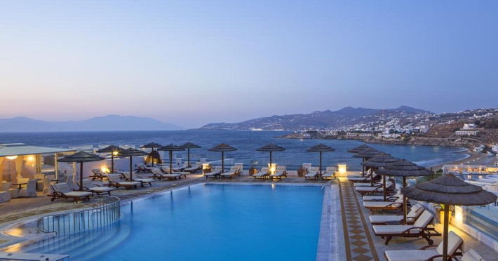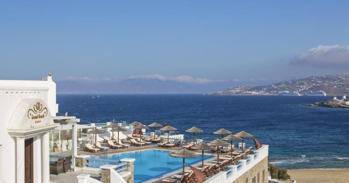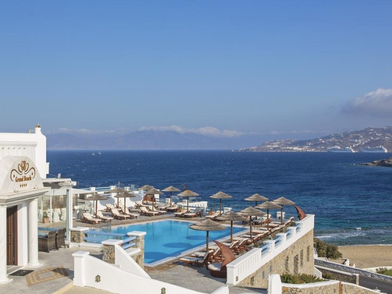 Descriere: Un resort elegant cu o localizare ideala, pe plaja de nisip Megali Ammos, oferind o vedere superba spre Marea Egee si celebrele mori de vant din orasul Mykonos. Localizare: pe plaja cu nisip din Megali Ammos, Grand Beach se afla la doar 400 de metri de animatul oras Mykonos. Dotari camere: Camerele sunt decorate modern si sunt dotate cu televizor, seif, frigider, uscator de par, aer conditionat,acces internet Wi-Fi, Facilitati hotel: Facilitatile de la Grand Bay include un salon de mic dejun, piscina cu apa de mare, piscina pentru copii, Jacuzzi in aer liber, bar la piscina, centru fitness, colt internt, parcare. Tip masa: mic dejun si optional demipensiune Clasificarea oficiala: 4* Web site: www.grandbeachmykonos.com