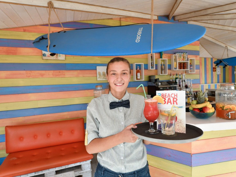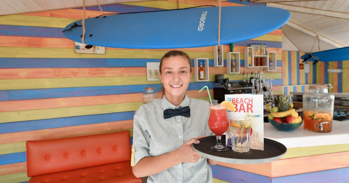 - Bauturi racoritoare si fructe servite de ospatari la piscina infinity si pe plaja