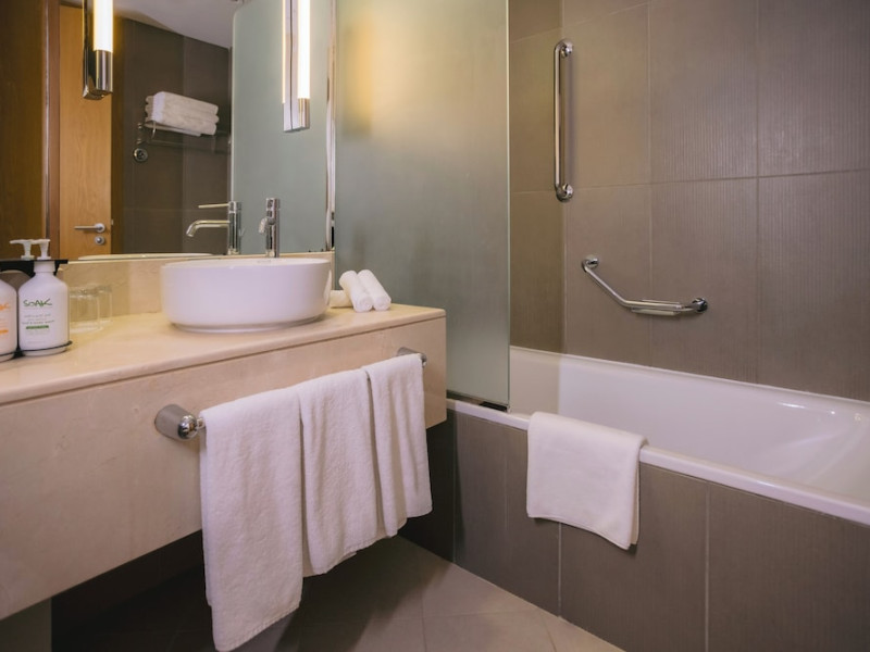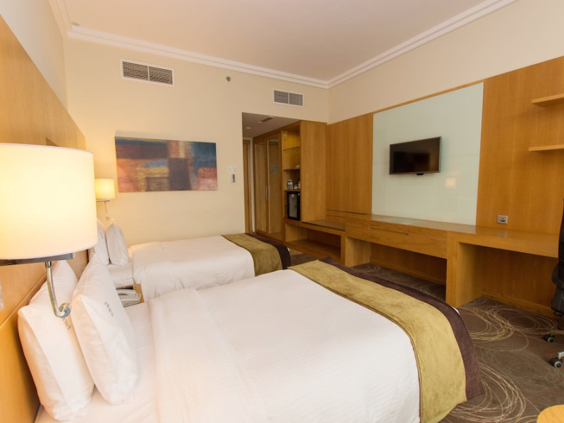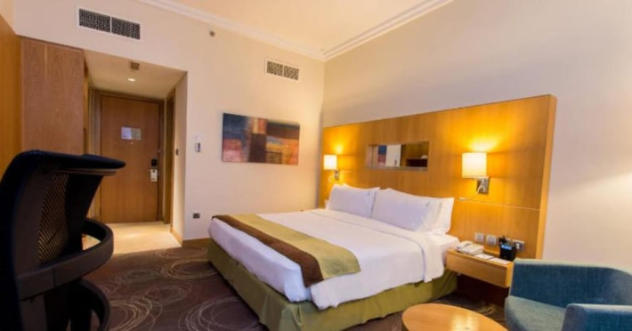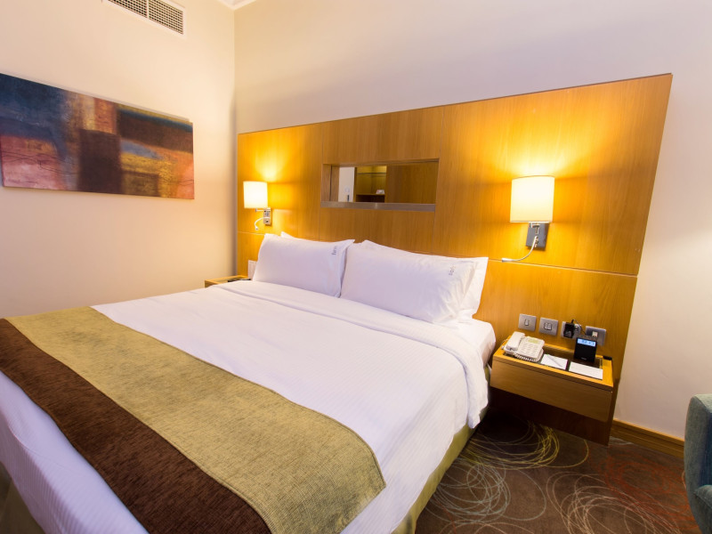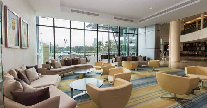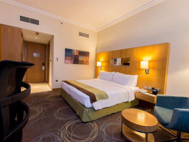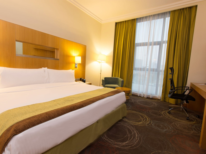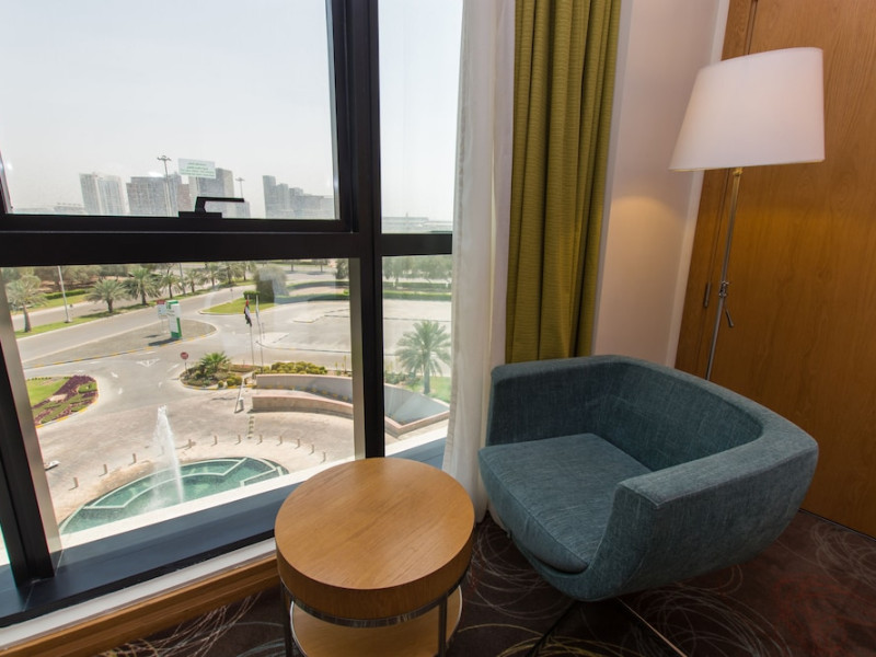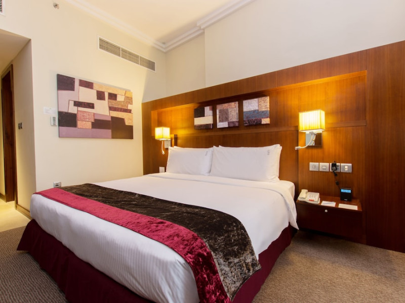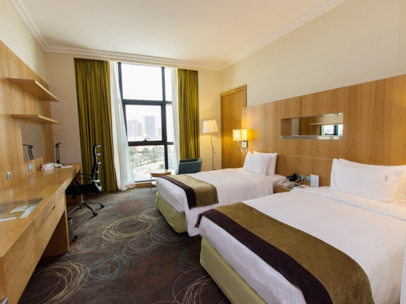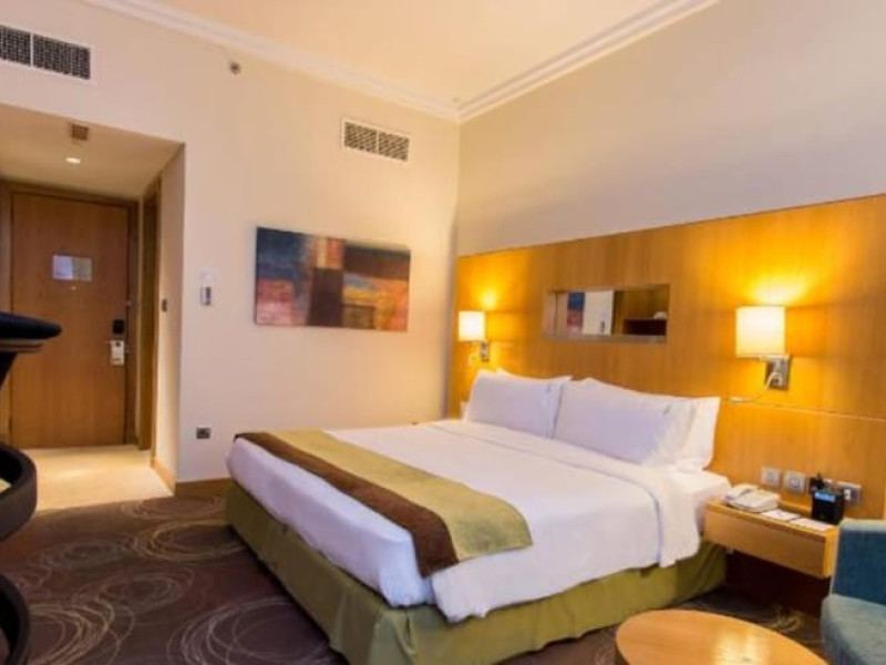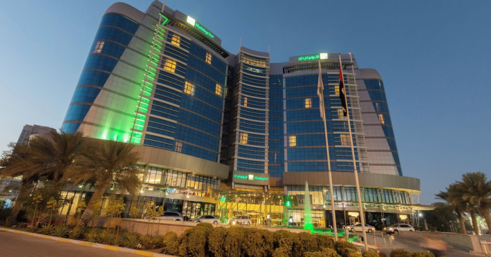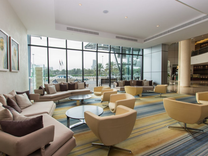 The Holiday Inn Abu Dhabi offers a warm and welcoming atmosphere for business and leisure travelers. Enjoy a peaceful and secure environment with enforced quiet hours and heightened security. Hotel amenities include a gym, pool, children's pool, steam room, sauna, and an outsourced spa and beauty salon. Dining options range from a main restaurant and café to a burger joint, sushi restaurant, and bars offering city views. Conveniently located near grocery stores, restaurants, and salons, the hotel is a five-minute drive from the Abu Dhabi National Exhibition Centre (ADNEC) and the Sheikh Zayed Grand Mosque. Event spaces are available for weddings, birthdays, corporate events, and more, with dedicated event planning support. Valet parking is provided. Guest rooms feature refrigerators and LED televisions with complimentary wired and wireless internet access. The hotel offers complimentary wired internet access, a 24-hour business center, and complimentary newspapers in the lobby. Buffet breakfast is available for a fee. The hotel is approximately 26 km from Abu Dhabi International Airport (AUH). The Holiday Inn Abu Dhabi Hotel is a Business, City hotel, Full Service, Modern, Tourist hotel. The nightlife/restaurants are located in the hotel.