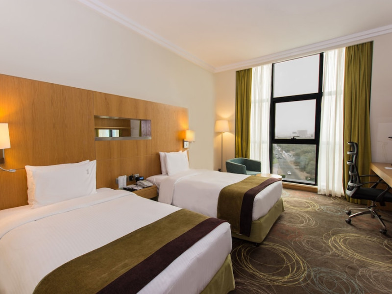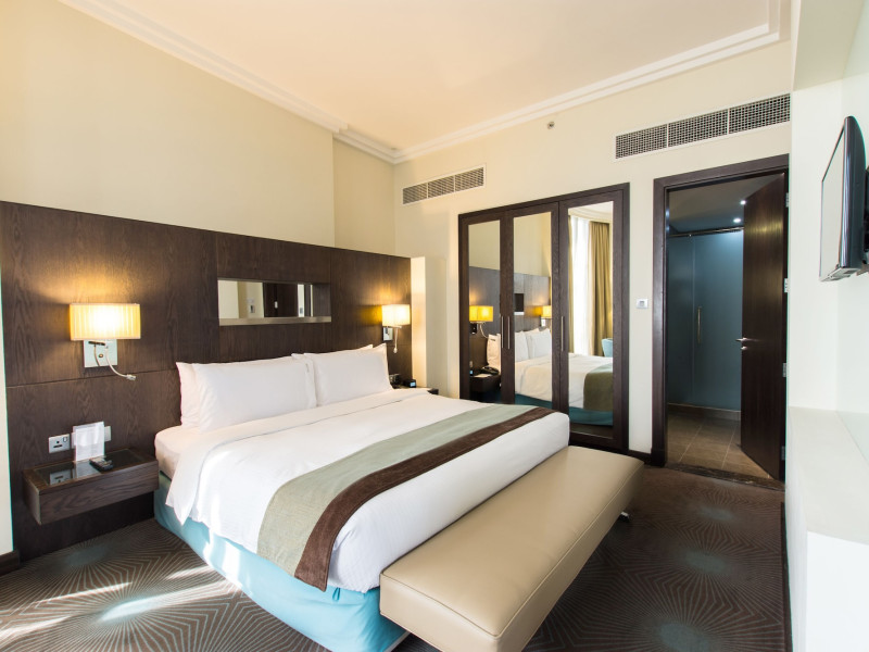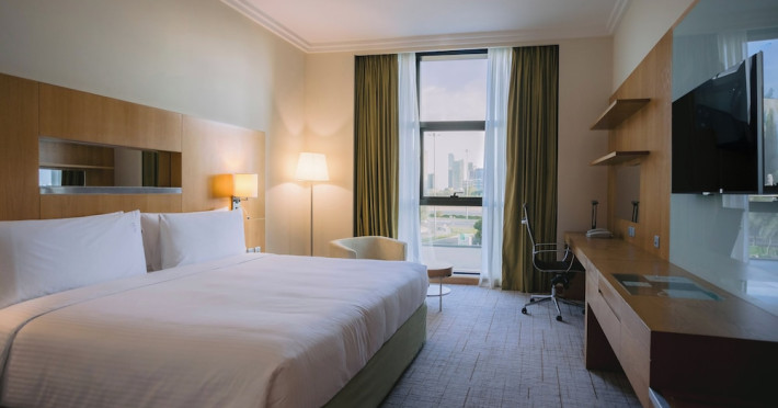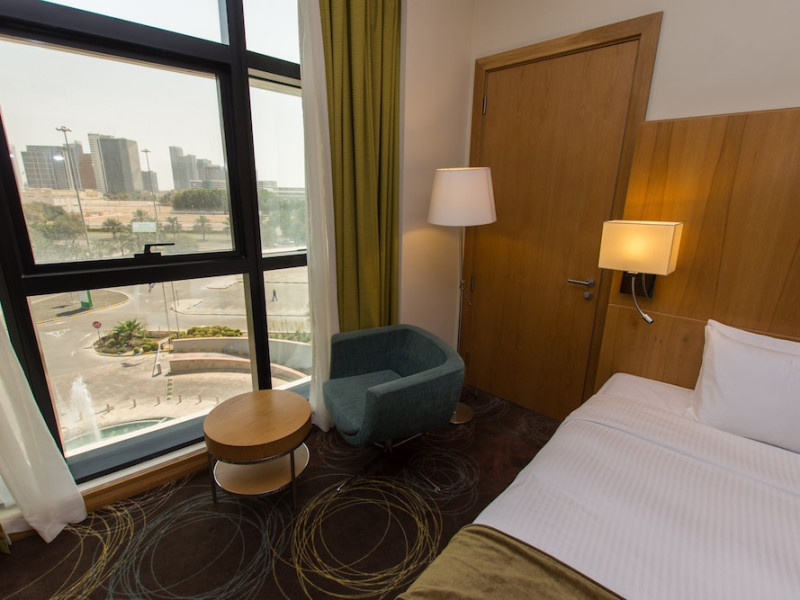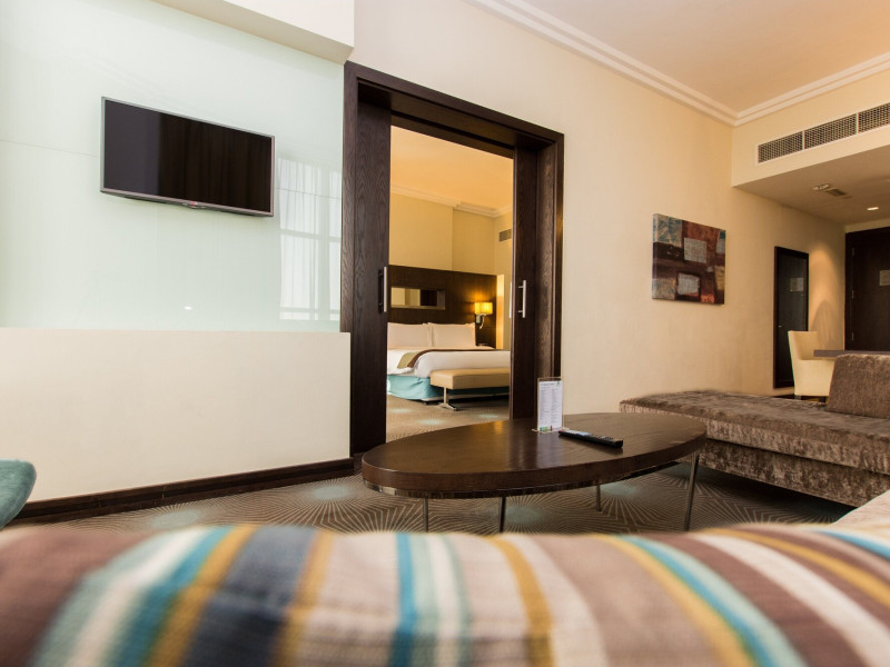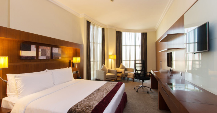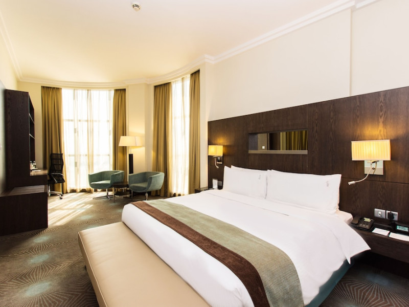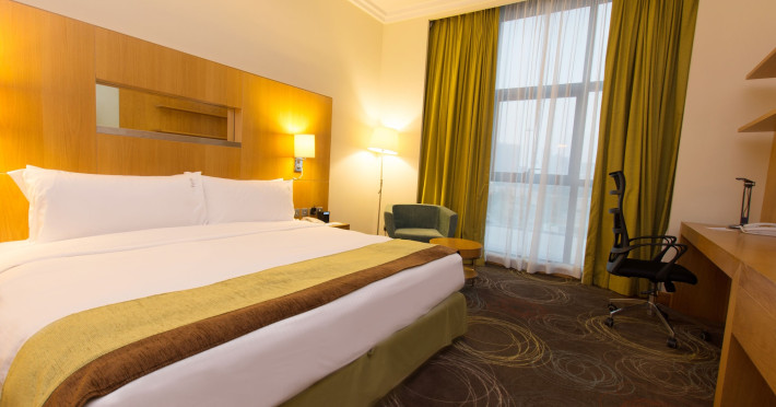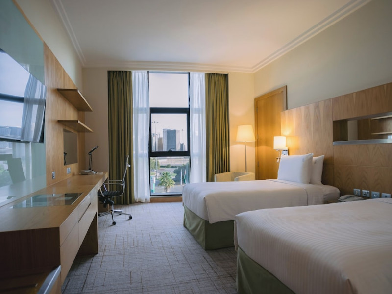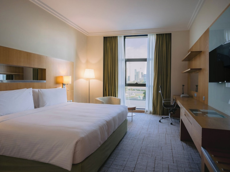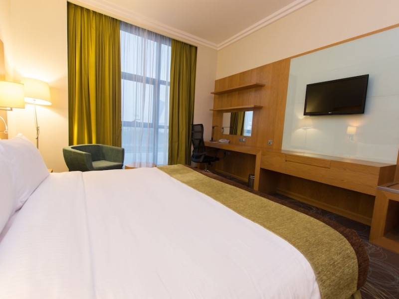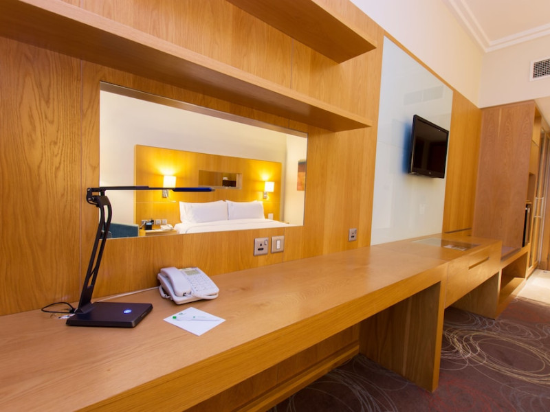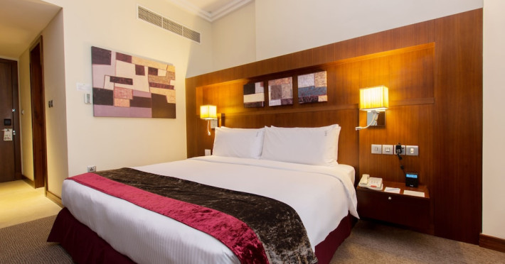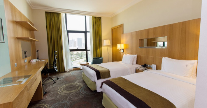 The Holiday Inn Abu Dhabi offers a warm and welcoming atmosphere for business and leisure travelers. Enjoy a peaceful and secure environment with enforced quiet hours and heightened security. Hotel amenities include a gym, pool, children's pool, steam room, sauna, and an outsourced spa and beauty salon. Dining options range from a main restaurant and café to a burger joint, sushi restaurant, and bars offering city views. Conveniently located near grocery stores, restaurants, and salons, the hotel is a five-minute drive from the Abu Dhabi National Exhibition Centre (ADNEC) and the Sheikh Zayed Grand Mosque. Event spaces are available for weddings, birthdays, corporate events, and more, with dedicated event planning support. Valet parking is provided. Guest rooms feature refrigerators and LED televisions with complimentary wired and wireless internet access. The hotel offers complimentary wired internet access, a 24-hour business center, and complimentary newspapers in the lobby. Buffet breakfast is available for a fee. The hotel is approximately 26 km from Abu Dhabi International Airport (AUH). The Holiday Inn Abu Dhabi Hotel is a Business, City hotel, Full Service, Modern, Tourist hotel. The nightlife/restaurants are located in the hotel.