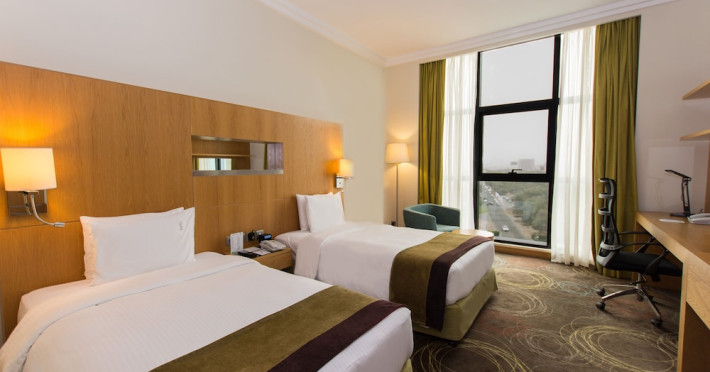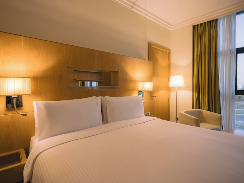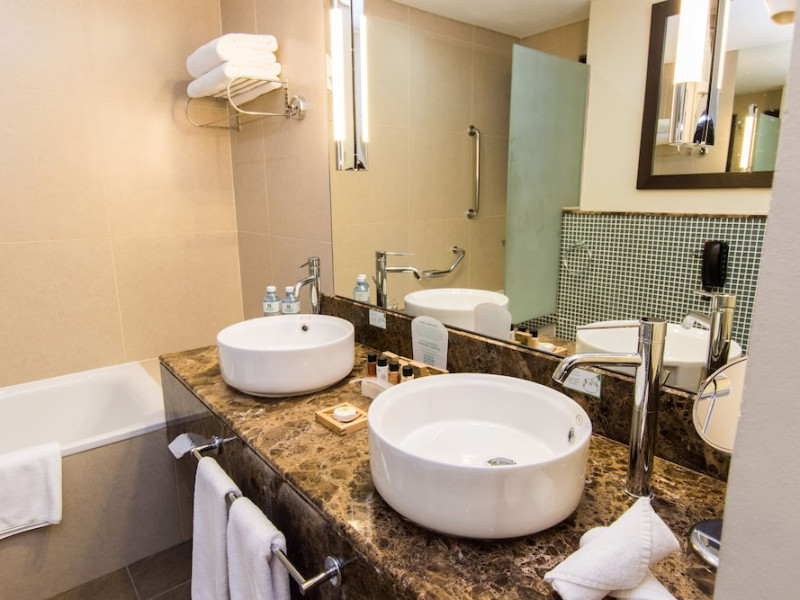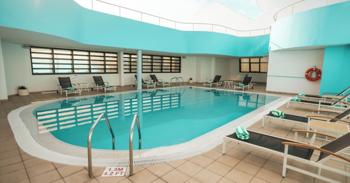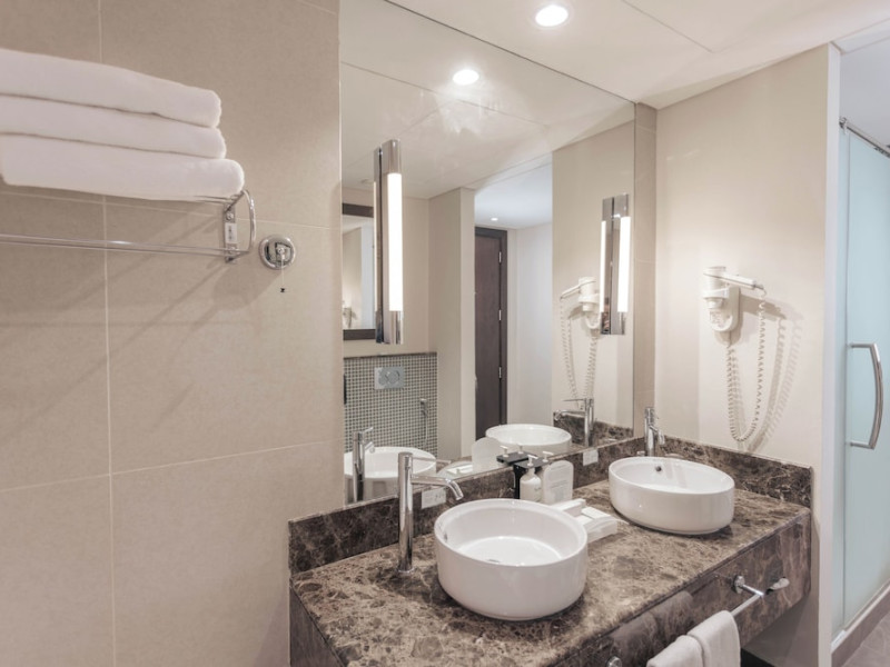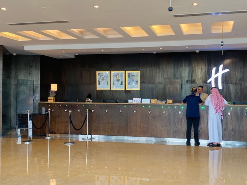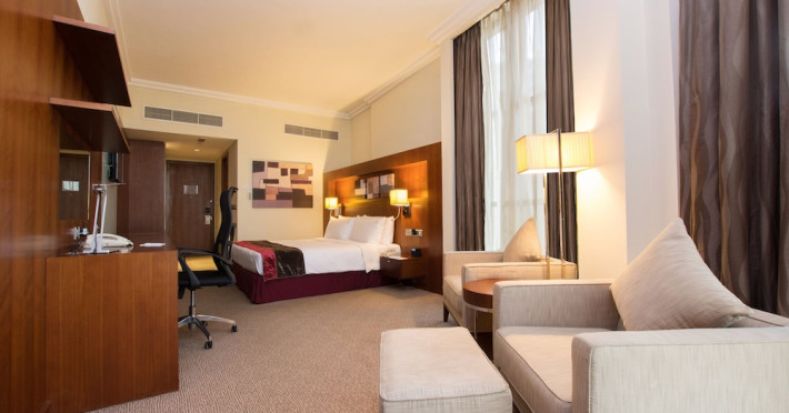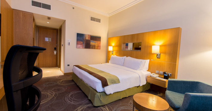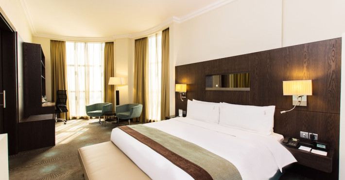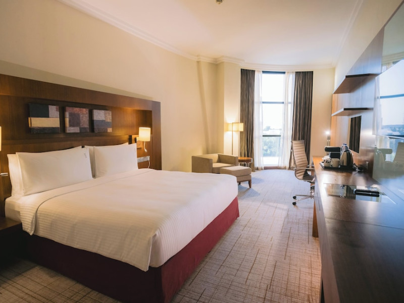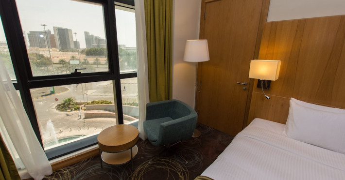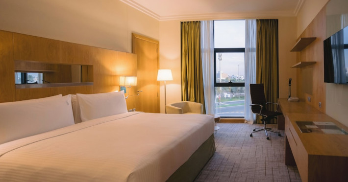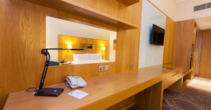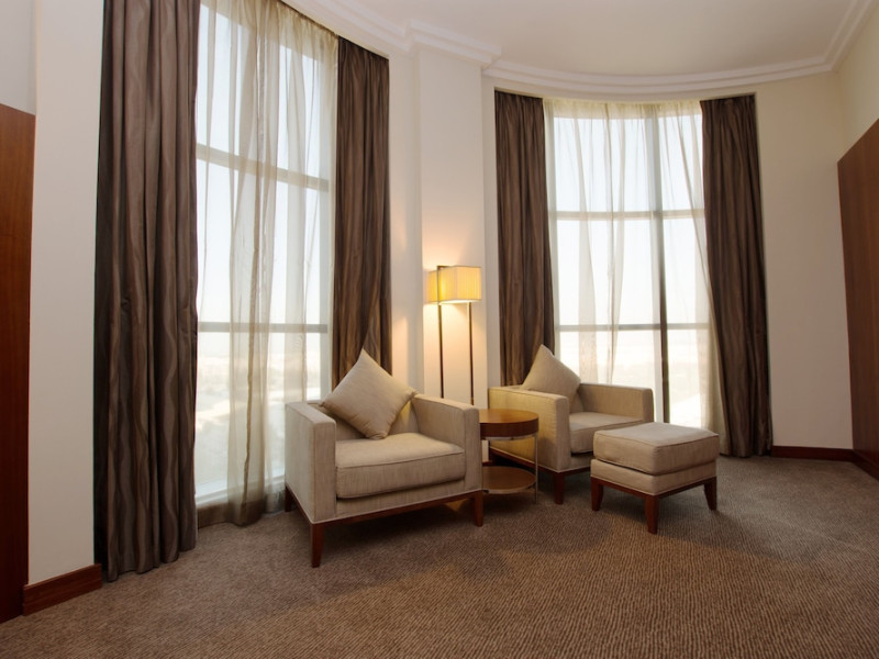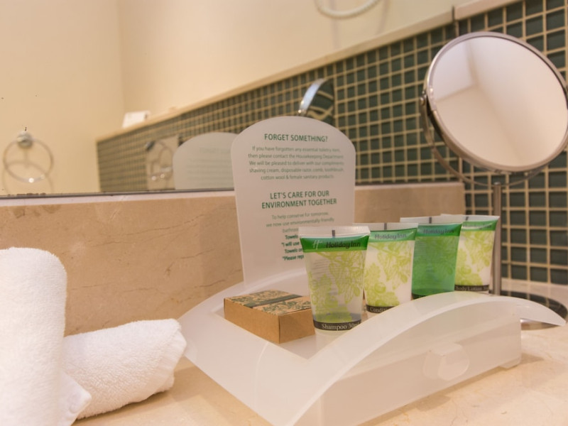 The Holiday Inn Abu Dhabi offers a warm and welcoming atmosphere for business and leisure travelers. Enjoy a peaceful and secure environment with enforced quiet hours and heightened security. Hotel amenities include a gym, pool, children's pool, steam room, sauna, and an outsourced spa and beauty salon. Dining options range from a main restaurant and café to a burger joint, sushi restaurant, and bars offering city views. Conveniently located near grocery stores, restaurants, and salons, the hotel is a five-minute drive from the Abu Dhabi National Exhibition Centre (ADNEC) and the Sheikh Zayed Grand Mosque. Event spaces are available for weddings, birthdays, corporate events, and more, with dedicated event planning support. Valet parking is provided. Guest rooms feature refrigerators and LED televisions with complimentary wired and wireless internet access. The hotel offers complimentary wired internet access, a 24-hour business center, and complimentary newspapers in the lobby. Buffet breakfast is available for a fee. The hotel is approximately 26 km from Abu Dhabi International Airport (AUH). The Holiday Inn Abu Dhabi Hotel is a Business, City hotel, Full Service, Modern, Tourist hotel. The nightlife/restaurants are located in the hotel.