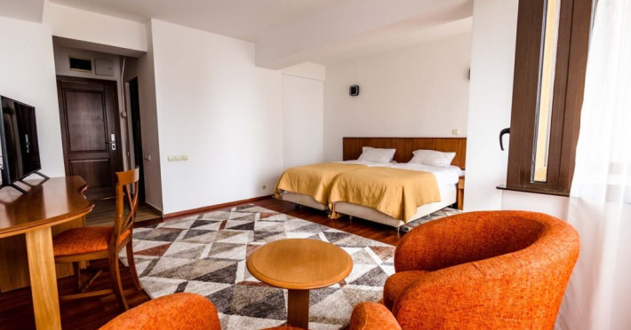 Hotelul dispune in total de 94 locuri de cazare dispuse pe 3 etaje in urmatoarea structura: 20 camere standard twin, 20 camere superior twin, 3 camere superior cu pat matrimonial si 4 apartamente cu pat matrimonial in dormitor si canapea extensibila in living. Hotelul are un restaurant compus din 2 saloane si cu acces la o terasa acoperita, situate pe acelasi nivel, ideale pentru petreceri sau evenimente private. FACILITATI UNITATE: Accesul este gratuit la piscina interioara cu apa incalzita la o temperatura de 28-30 C. Dimensiunile piscinei sunt L=11m , l=6m cu adancime intre 1,65m si 2.20m motiv ptr care nu este recomandata celor ce nu stiu sa inoate, biliard, tenis de masa, sala de fitness, internet in fiecare camera, parcare supravegheata video gratuita.