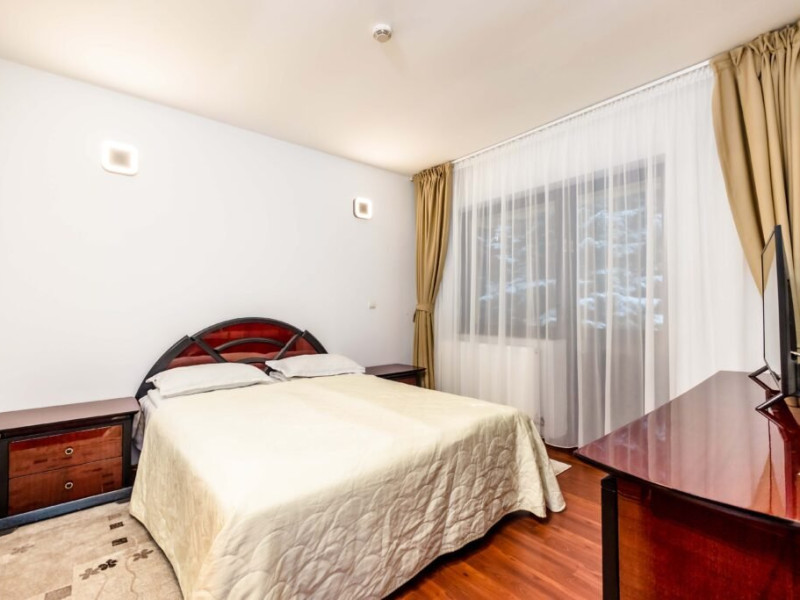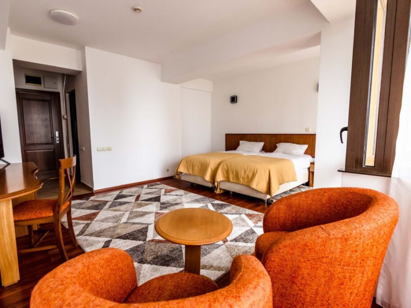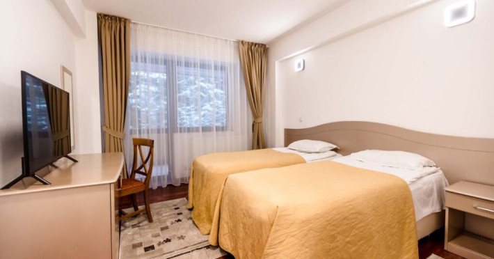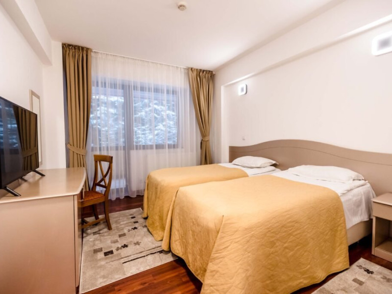 DESCRIERE CAMERE: Camere duble standard twin: 15 mp, smart TV, WiFi, seif, minibar, baie cu dus, balcon (vedere spre padure). Camere duble twin superior: 25 mp, smart TV, WiFi, seif, baie cu dus, balcon (vedere spre partia de Schi). Apartament: 40 mp, dormitor cu pat matrimonial 160x200, living cu canapea extensibila. WiFi, mnibar, seif, baie cu cada, balcon