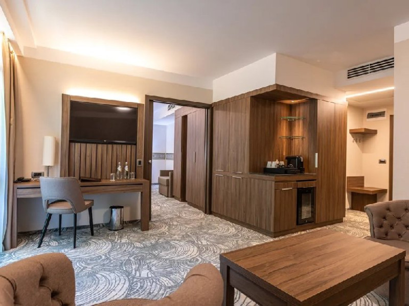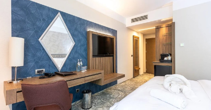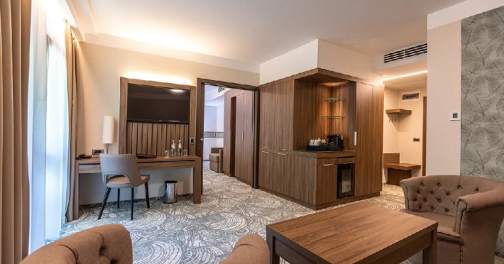 Hotelul are 104 camere nefumatoare complet echipate. Selectia de camere si apartamente confortabile, decorate elegant si complet echipate sunt garantia relaxarii si regenerarii. Camerele moderne cu design interior de bun gust au balcon sau luminatoare proprii, in timp ce patru apartamente vin cu toate utilitatile de care ar putea avea nevoie cel mai pretentios oaspete. Camera dubla clasica, formata dintr-o camera de lux, o baie, living, toate dotate cu facilitati de ultima generatie, mini-bar, linie telefonica direct, uscator de par, fier de calcat si masa de calcat (la cerere), blocare electronica a cardului cu cheie, detector de fum, TV LCD cu ecran plat, suport pentru bagaje, TV prin satelit, baie eleganta cu cabina de dus, dulap, aparat de cafea, scaun tapitat cu cotiere, seif. Camera dubla + fotoliu extensibil: formata dintr-o camera de lux, o baie, living, toate dotate cu facilitati de ultima generatie, mini-bar, linie telefonica direct, uscator de par, fier de calcat si masa de calcat (la cerere), blocare electronica a cardului cu cheie, detector de fum, TV LCD cu ecran plat, suport pentru bagaje, TV prin satelit, baie eleganta cu cabina de dus, dulap, aparat de cafea, scaun tapitat cu cotiere, seif, fotoliu extensibil cu lenjerie de pat. Apartamentul are tot ce ai nevoie pentru sejurul tau. Un ansamblu mobilat selectiv format dintr-un living plin de farmec si un dormitor insotit de un dressing amenajat convenabil, un lounge distins, o baie, un balcon, toate dotate cu facilitati de ultima generatie, mini-bar, linie telefonica direct, uscator de par, fier de calcat si masa de calcat (lacerere), blocare electronica a cardului cu cheie, detector de fum, TV LCD cu ecran plat, suport pentru bagaje, TV prin satelit, baie eleganta cu cabina de dus, dulap dulap, aparat de cafea, canapea extensibila, seif.