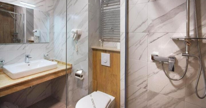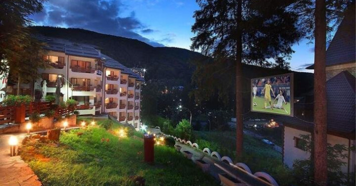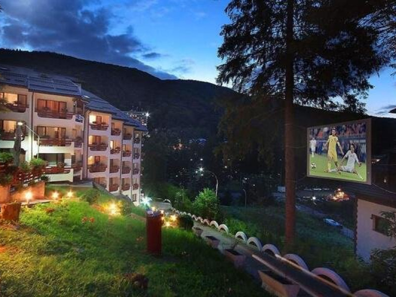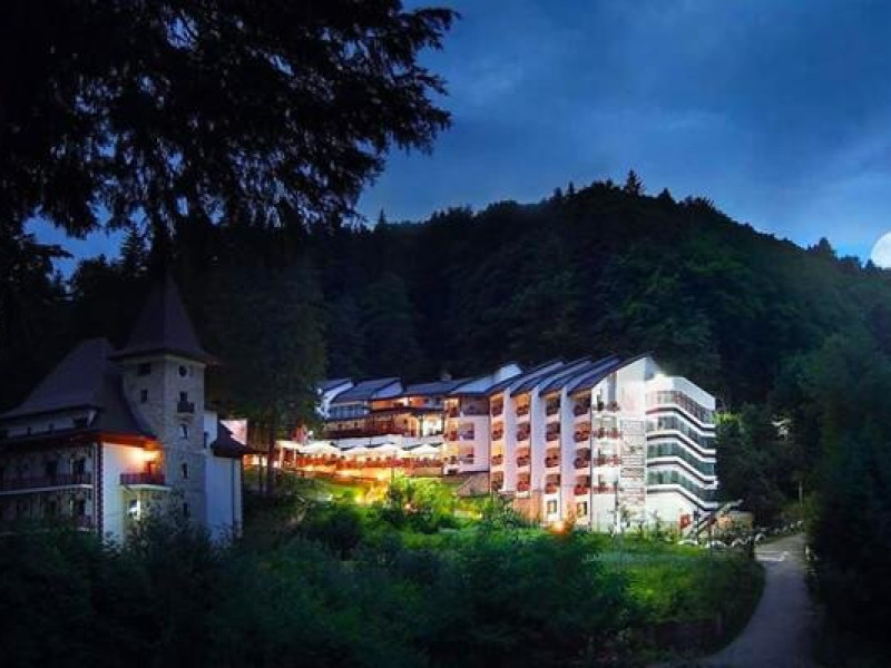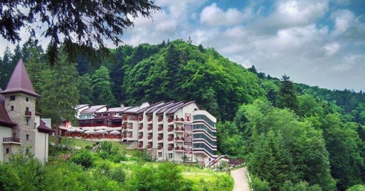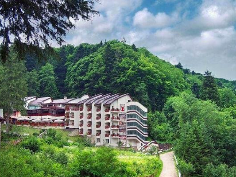 INFORMATII GENERALE Complexul hotelier Dobru este situat pe versantul estic al Carpatilor Orientali, in pitoreasca statiune Slanic Moldova, la o altitudine de 530 de metri. Cladirea este construita in trepte, pe un perete stancos abrupt aflat chiar de-a lungul cursului paraului Slanic.