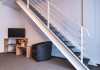 Apartamentele junior sunt dispuse pe doua niveluri: la parter living cu canapea extensibila si la etaj o camera cu pat matrimonial. Exista o singura baie, situata la parter.