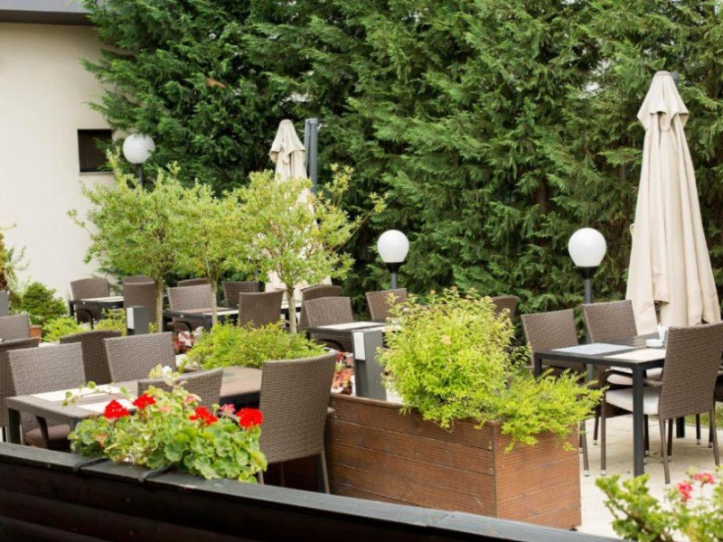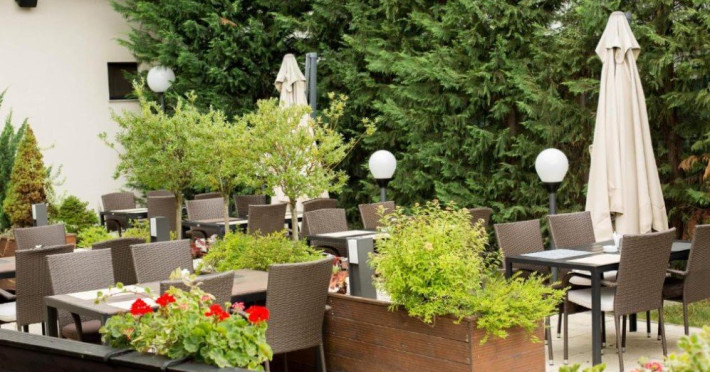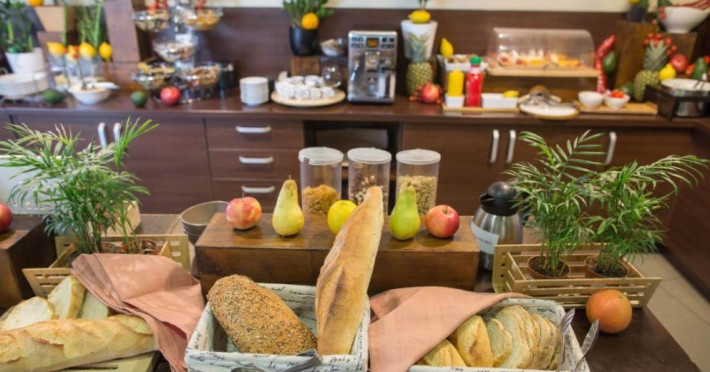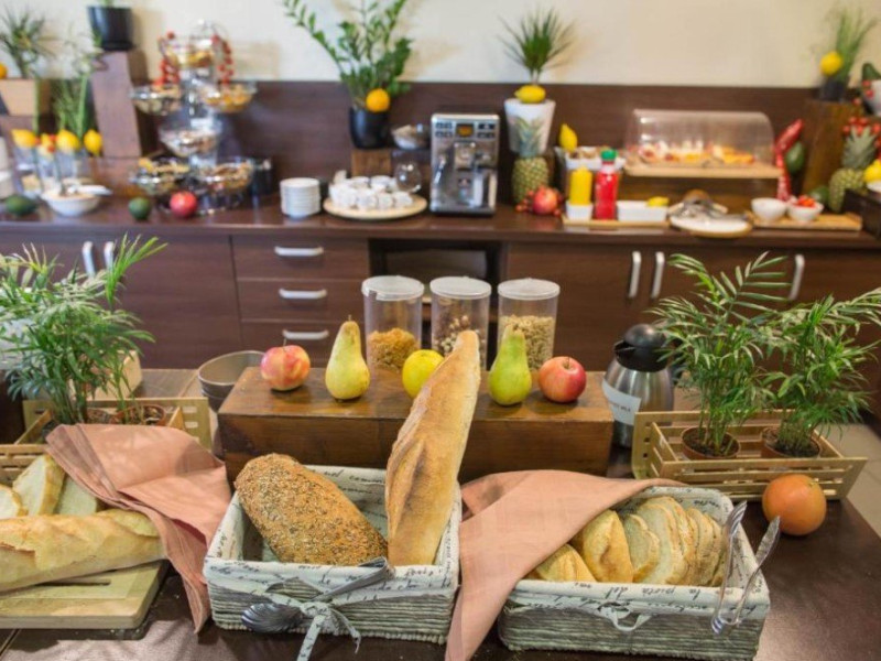 Restaurantul cu terasa de vara serveste preparate italiene, iar Hotel Galaxy ofera, de asemenea, bar si minimarket. Se ofera room service si mic dejun tip bufet. Un alt restaurant se gaseste la 200 de metri.