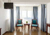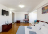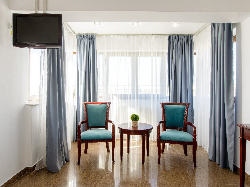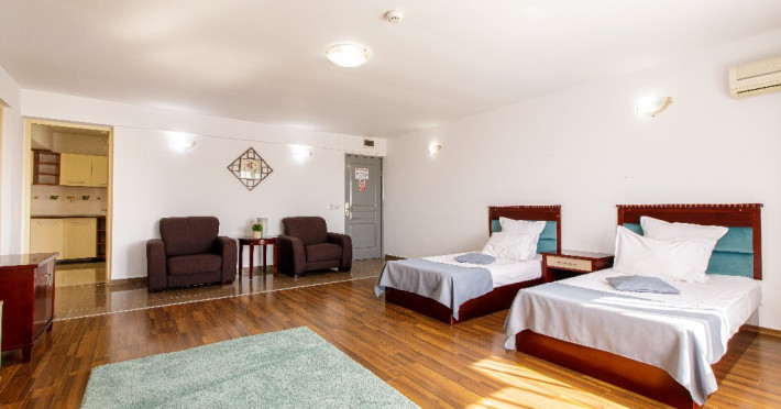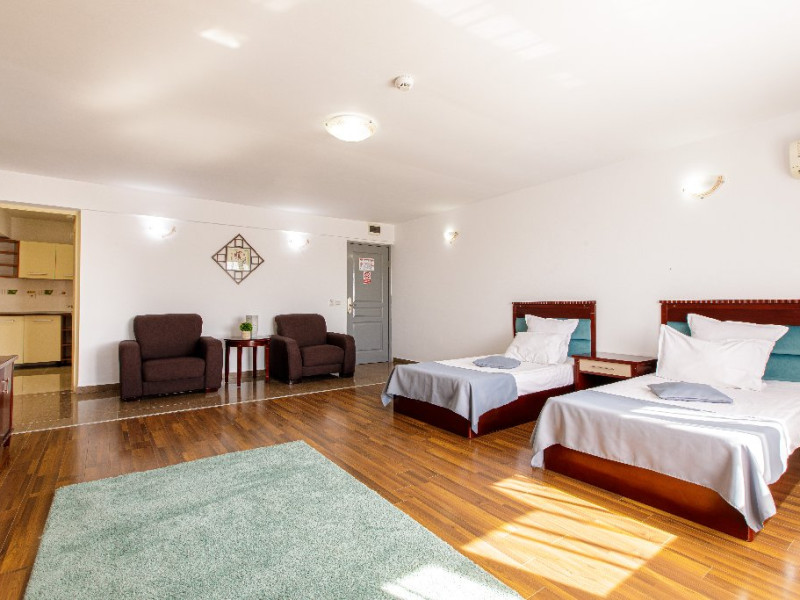 Hotelul dispune de 4 camere studio superior. Acest tip de camera ofera un spatiu generos, suprafata utila a acesteia fiind de 42 mp. Camera tip studio superior este foarte luminoasa si este excelenta pentru cazarile de cuplu. Camera cu pat matrimonial dispune de spatiu de relaxare cu masuta si fotolii iar din balconul acesteia puteti admira privelistea asupra orasului Constanta sau puteti savura cafeaua in intimidate dimineata. Fiecare camera dispune de bucatarie complet utilata unde puteti pregati gustarile preferate, baie cu cabina de dus, TV LCD, aer conditionat, telefon. 42 m2/ 2 adulti.