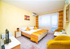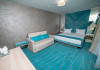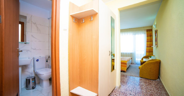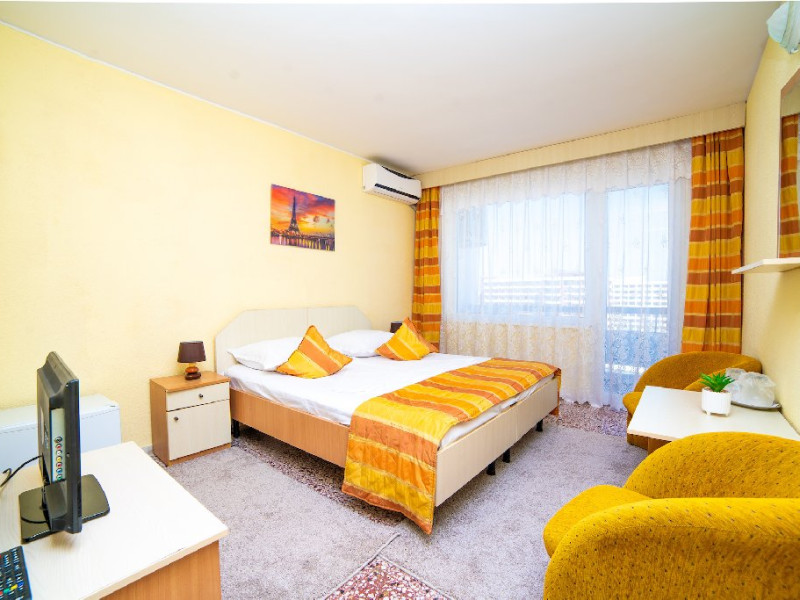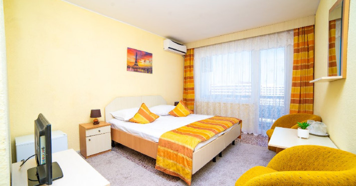 Camera Family Aceasta camera generoasa de tip garsoniera este compusa dintr-un dormitor spatios cu un pat matrimonial si O CANAPEA EXTENSIBILA, aer conditionat, televizor LCD, telefon, minibar, dressing si baie privata cu dus, uscator de par si articole de toaleta. Balconul privat al camerei de familie-garsoniera ofera o priveliste frontala catre mare, creand astfel un spatiu linistit si relaxant pentru oaspetii nostri. Aceasta camera este o solutie ideala pentru familiile sau grupurile mici de prieteni care isi doresc confort si spatiu generos de cazare, fara a renunta la facilitatile si serviciile oferite de Hotelul Meteor.