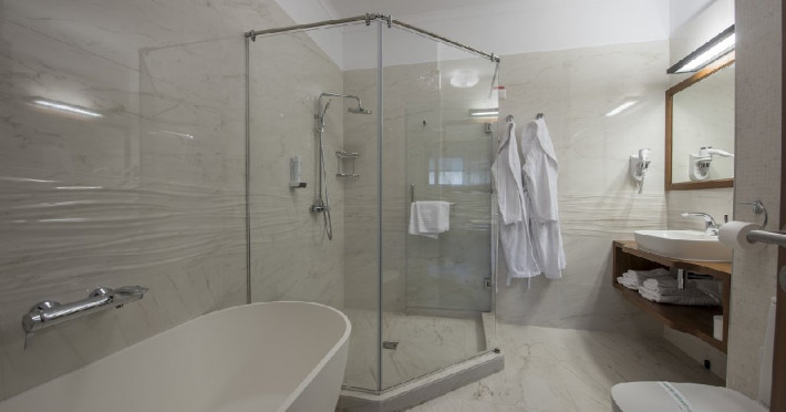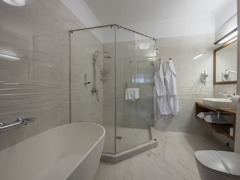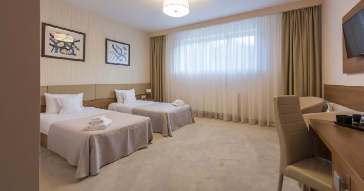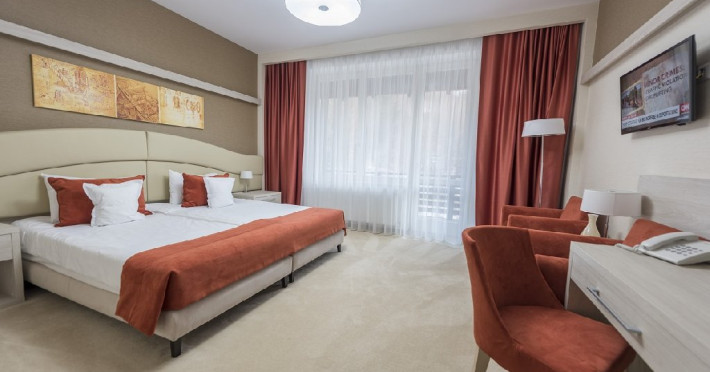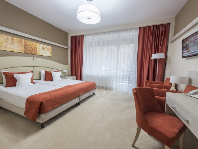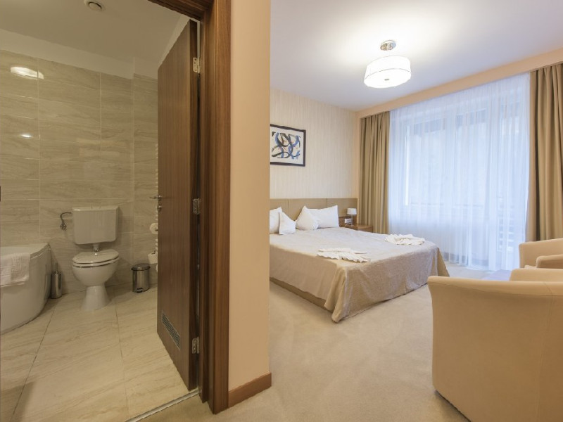 DESCRIERE CAMERE: sistem de climatizare, cablu TV cu pachet de peste 100 de programe, internet Wireless gratuit, linie telefonica, minibar, baie cu dotari full (fiecare vas WC cu functie de bideu, cada/cabina de dus,uscator de par, produse cosmetice, etc), seif, halat de baie, papuci, facilitati pentru prepararea ceaiului, detectoare de fum, patut copil la cerere, fier de calcat si masa de calcat la cerere. ATENTIE - Camerele duble premier sunt fara balcon !!!
