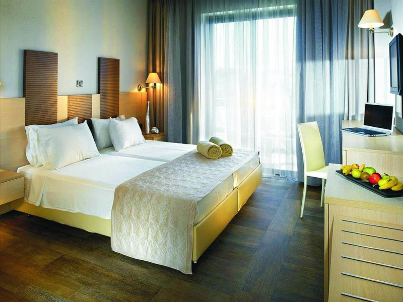 Facilitati camere: Camerele spatioase ofera comfort, cu vedere spre mare, gradini sau piscina si se disting prin decorul elegant. Mai mult decat atat, suitele spatioase garanteaza o sedere placuta si luxoasa. Camerele duble ale hotelului sunt spatioase(25 mp) si foarte confortabile, va ofera mai multe facilitati precum telefonie internationala, TV satelit cu ecran TFT, mini bar, halate de baie, paturi de lux, servicii de dupa-amiaza, uscator de par si seif electronic.