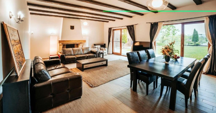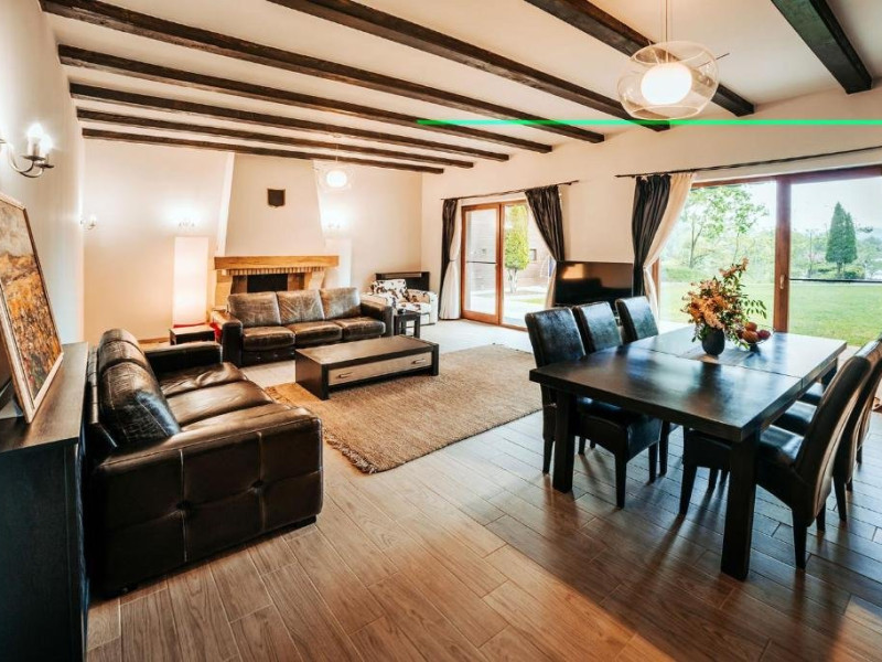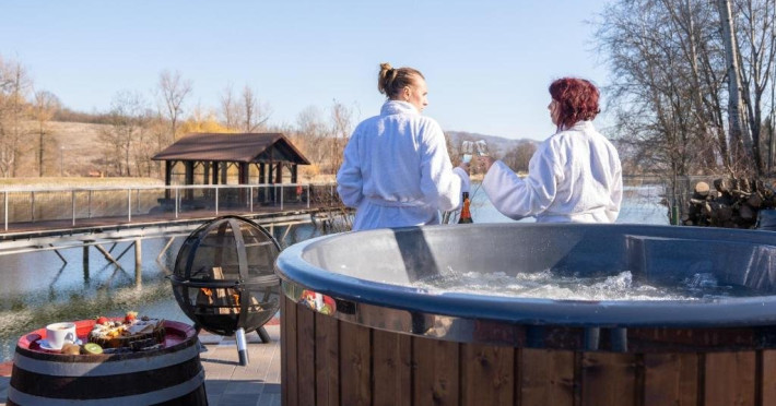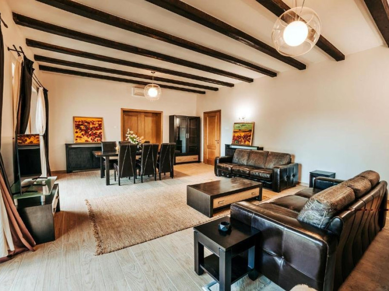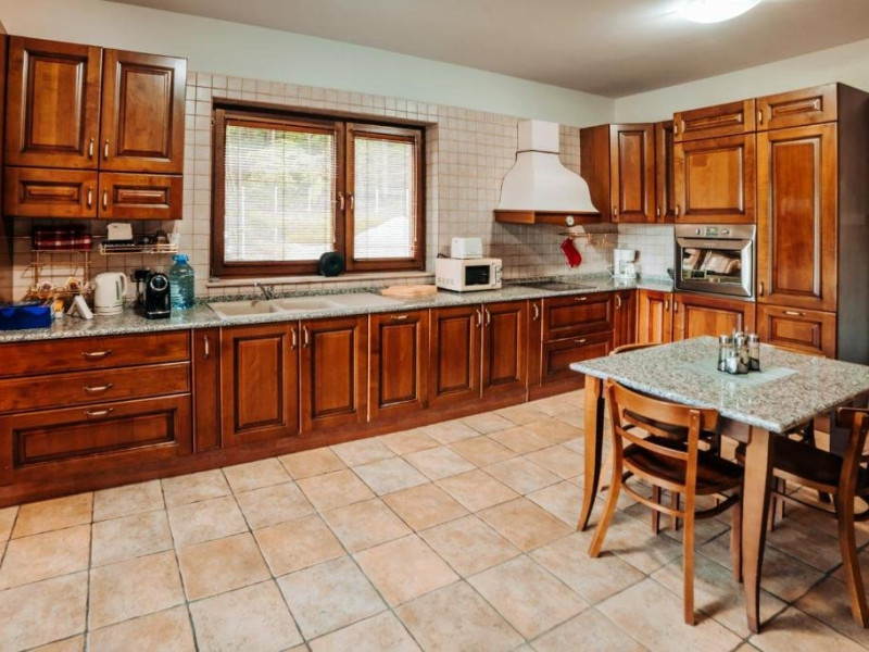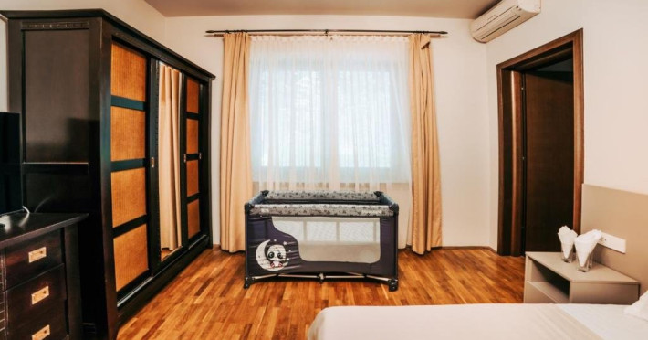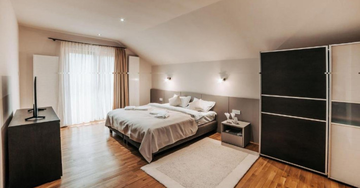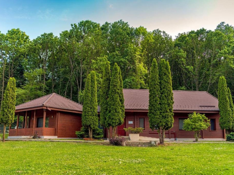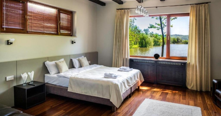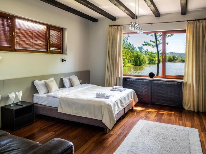 DOTARI SI SERVICII: Servicii disponibile contra cost: open bar cu pachete flexibile, sauna si ciubar pentru momente de relaxare, pachete personalizate pentru mese (mic dejun, pranz, cina, gratar) si activitati de team building dedicate grupurilor. Serviciile pot fi adaptate in functie de numarul de persoane, durata sejurului si tipul evenimentului si sunt disponibile la cerere, pe baza de programare. Casa Peluza - cu o suprafata de aproximativ 100 mp, are 3 dormitoare fiecare cu pat matrimonial si baie proprie cu dus, sufragerie cu canapea extensibila, balcon cu vedere lac, dar si la gradina, bucatarie utilata, AC, TV, internet, Poate acomoda 6 adulti, suplimentar 2 copii, inchiriere integrala vila.