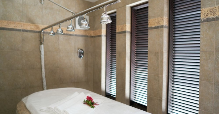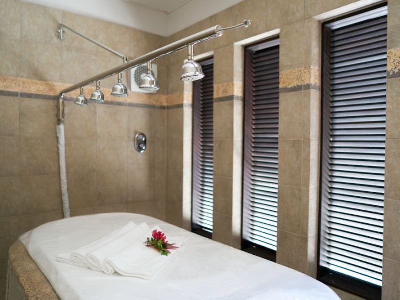 The hotel features multiple outdoor swimming pools, a fitness center, a steam room, and a full-service spa offering massages, body treatments, and facials. Recreational activities include table tennis, tennis, windsurfing, and snorkeling.