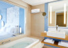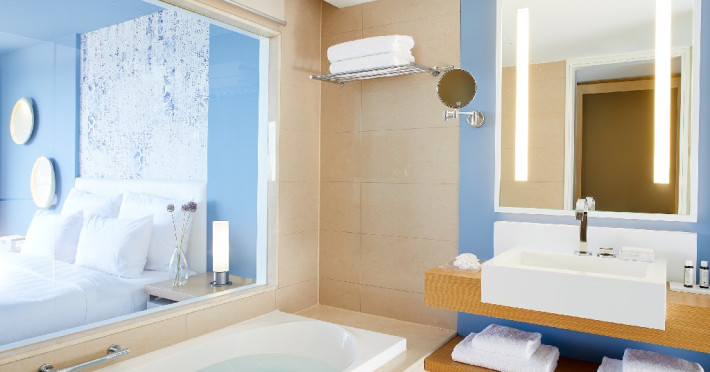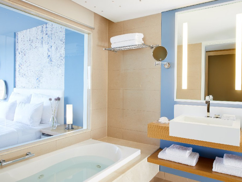 Dotari camere: Camerele sunt luminoase, au un aspect modern si sunt dotate cu aer conditionat, acces internet WiFi (gratuit), telefon, seif (gratuit), televizor Smart, balcon/terasa, cafetiera Nespresso si facilitati pentru ceai (aprovizionare zilnica), cada cu hidromasaj, halate si papuci de baie, uscator de par, cos de bun venit (vin spumant si fructe).