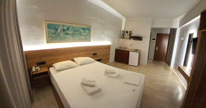 Este situat la aproximativ 50–100 m de plajă, la doar câțiva pași de zona cu magazine, taverne și baruri.