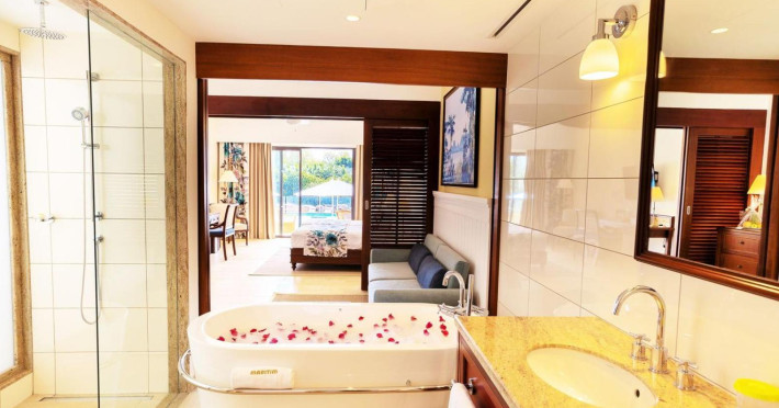 The resort boasts an outdoor pool, spa with massages, body treatments, and facials, outdoor tennis courts, a 9-hole golf course, and water-skiing facilities. Additional amenities include complimentary wireless internet access, concierge services, babysitting (surcharge), a 24-hour business center, and complimentary newspapers in the lobby. The resort provides conference space and meeting rooms. A roundtrip airport shuttle is available for a surcharge (24 hours), and free self-parking is offered on-site. Other services include a ticket service, tours, dry cleaning, and laundry service. Some rooms offer air conditioning, blackout curtains, linen service, coffee/tea maker, bottled water, and bathrobes. Guests can enjoy on-site dining, a cafe, and BBQ facilities. Leisure amenities include a hot tub, salon, steam room, spa, sauna, and fitness center. The Maritim Resort and Spa Mauritius is a hotel.