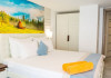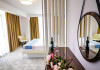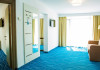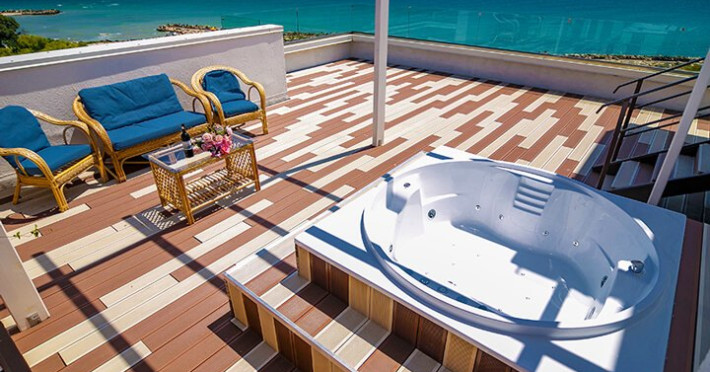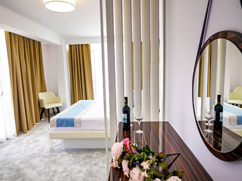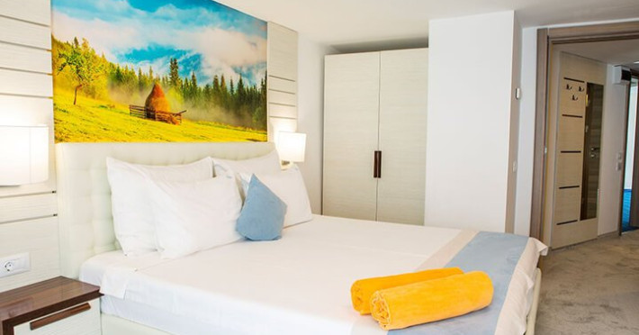 Apartament Junior Suite cu Jacuzzi pe terasa- suprafata de aproximatix 30 mp + terasa generoasa cu jacuzzi, dormitor cu pat matrimonial (180/190 cm) si living cu canapea extensibila, o baie in dormitor. Recomandare: Junior Suite este destinat cazarii a 2 adulti si 2 copii sau 3 adulti. Acest tip de camera nu suporta adaugarea unui pat suplimentar.