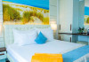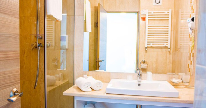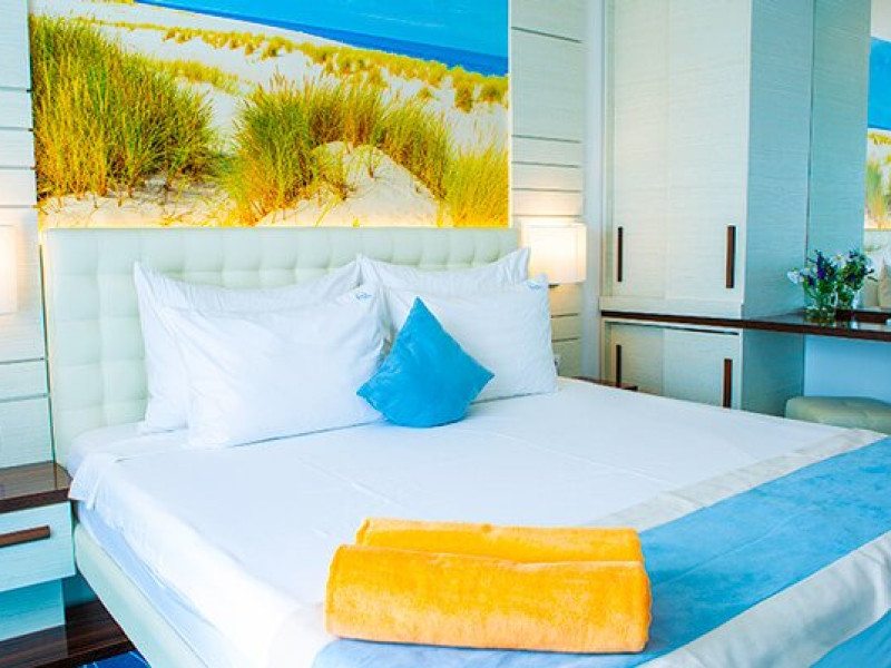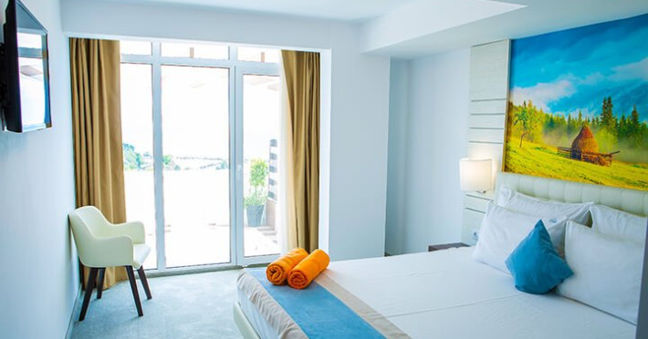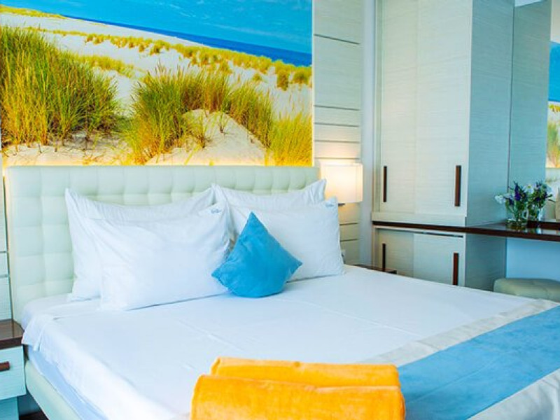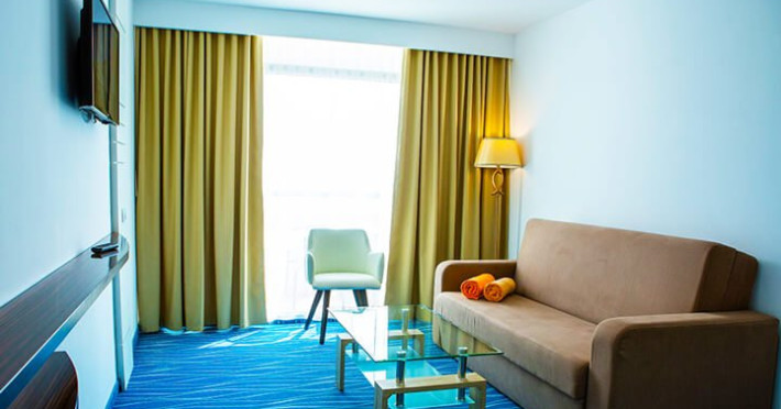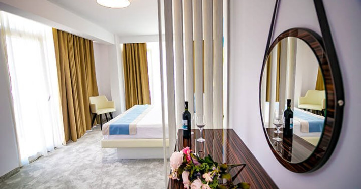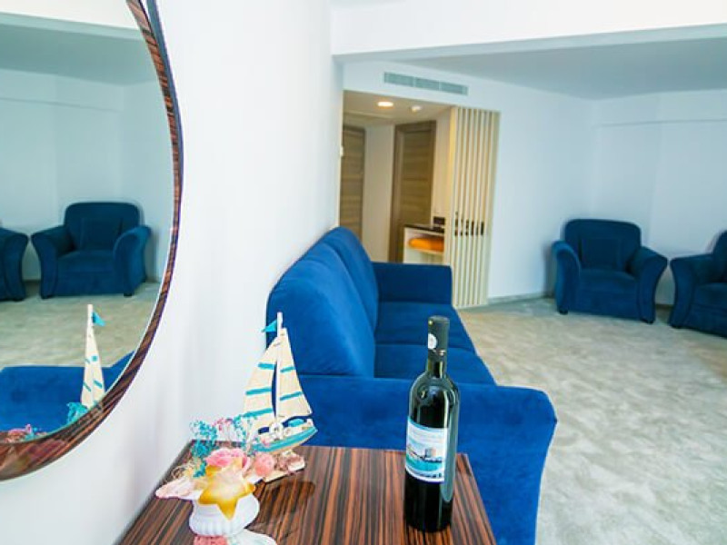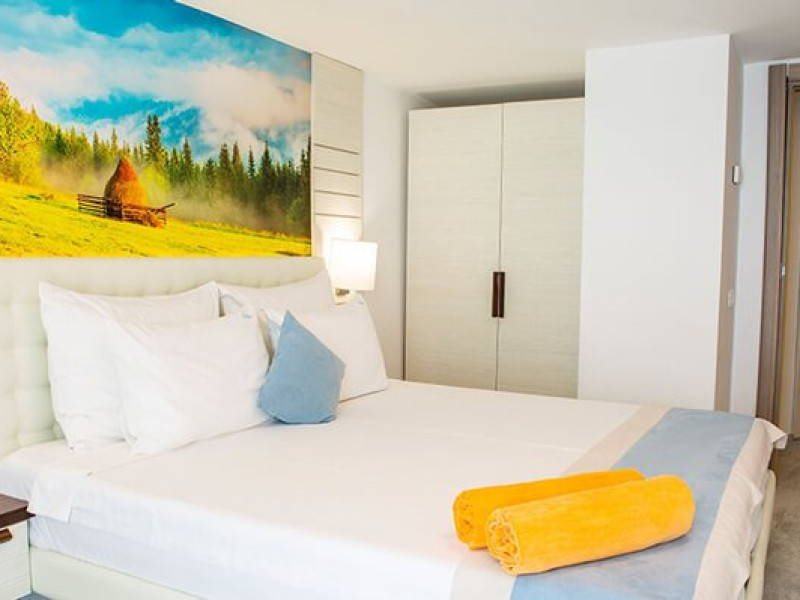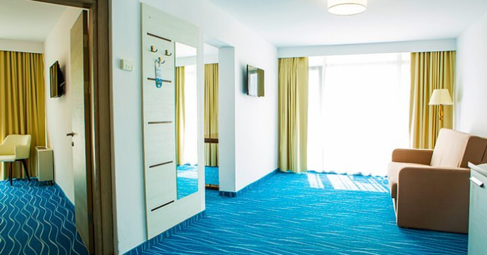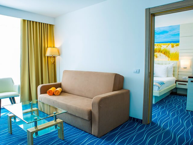 Apartamente Junior: - Apartamentul Junior Suite este compus din camera de zi, cu canapea extensibila si dormitor cu pat matrimonial, avand o suprafata de aproximativ 30 mp. Apartamentul dispune de o singura baie. Recomandare: Junior Suite este destinat cazarii a 2 adulti si 2 copii sau 3 adulti. Acest tip de camera nu suporta adaugarea unui pat suplimentar.