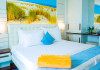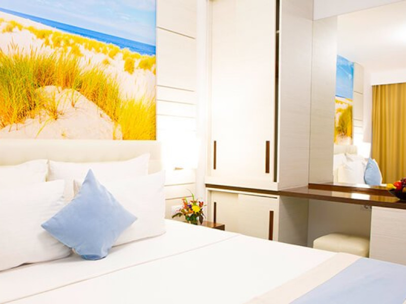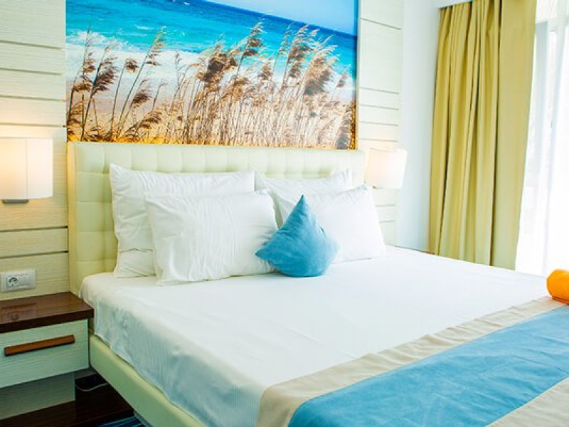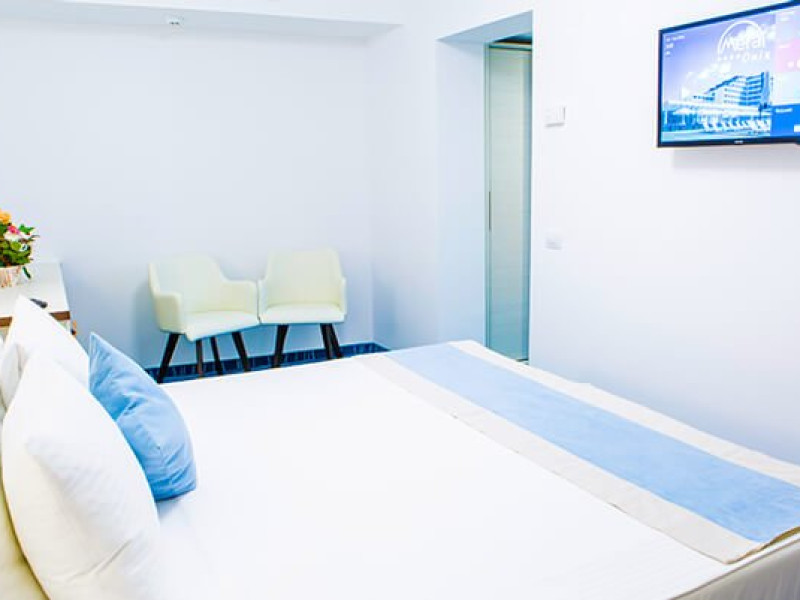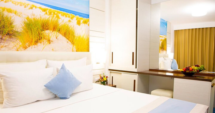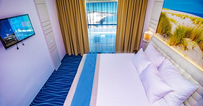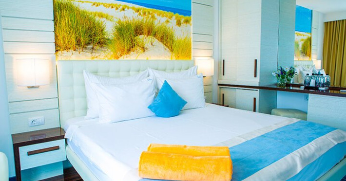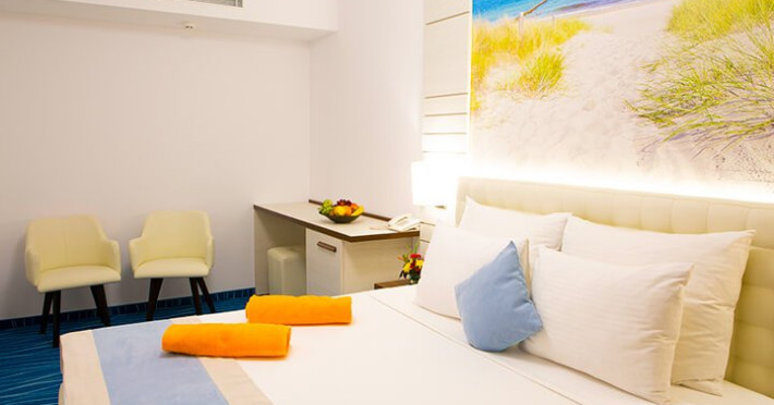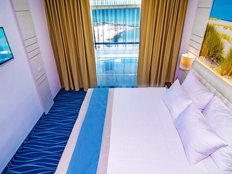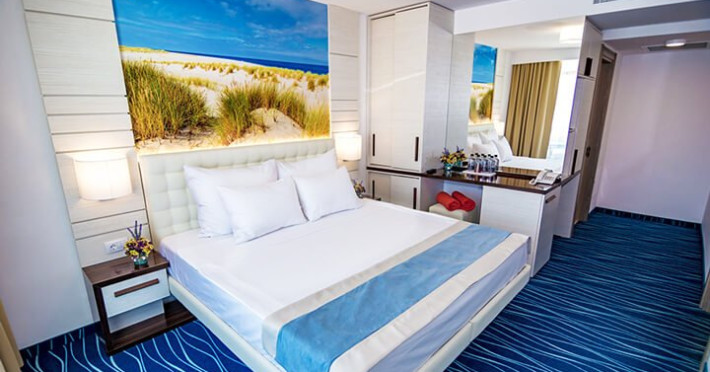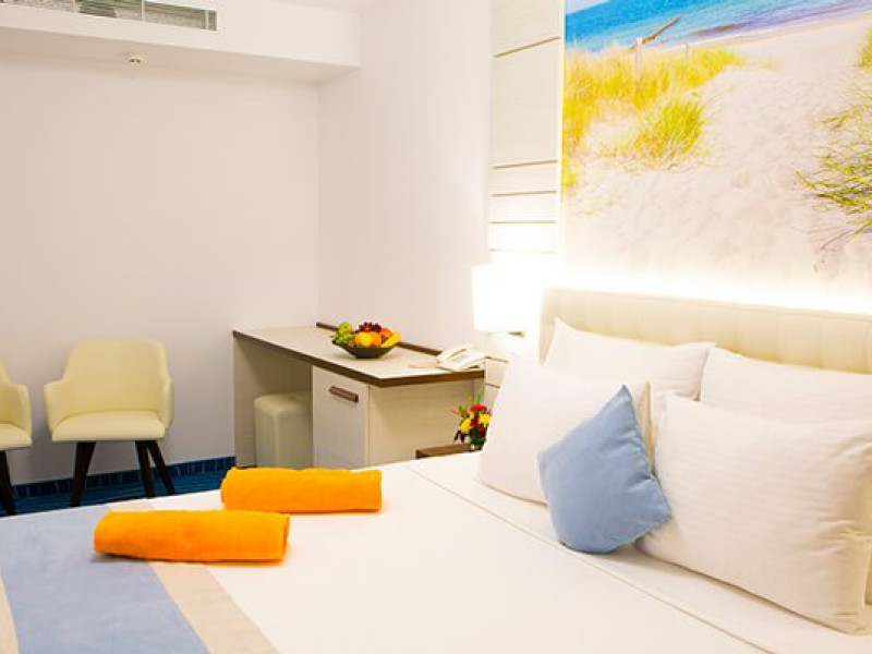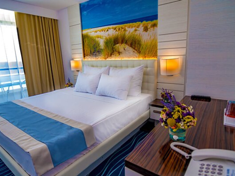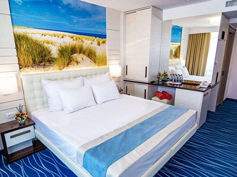 Dotari camere: sistem de acces in camera pe baza de cartela/bratara, aer conditionat, TV LCD, telefon, seif, baie cu cabina de dus, uscator de par, cosmetice hoteliere, prosoape de plaja, balcon, minibar contra cost.