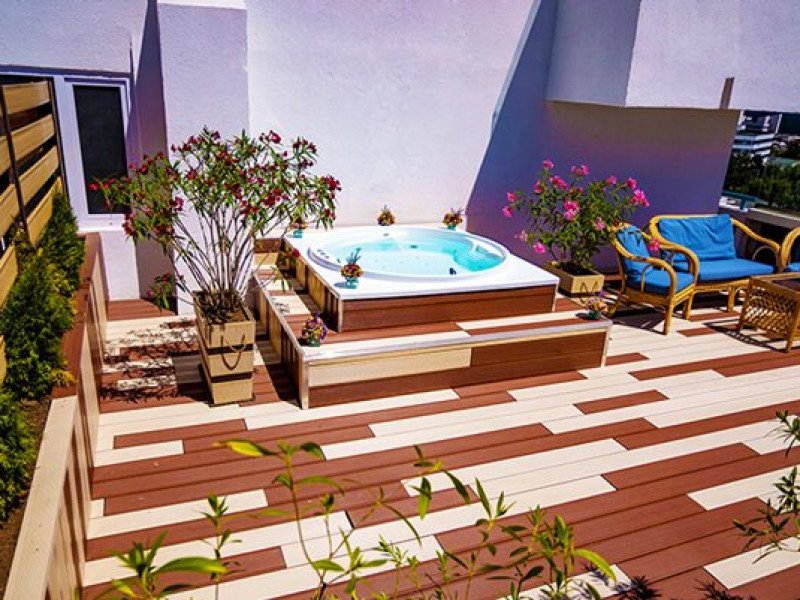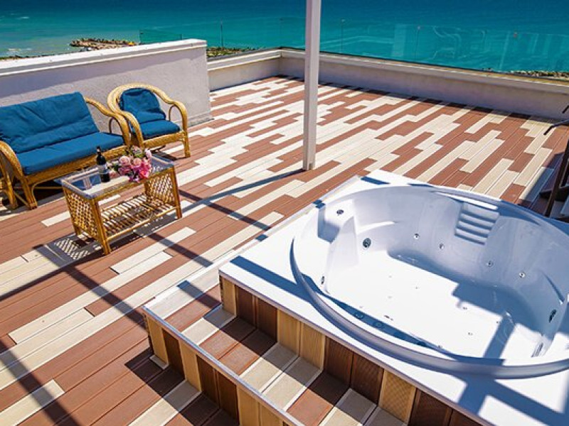 Apartament Junior Suite cu Jacuzzi pe terasa- suprafata de aproximatix 30 mp + terasa generoasa cu jacuzzi, dormitor cu pat matrimonial (180/190 cm) si living cu canapea extensibila, o baie in dormitor.