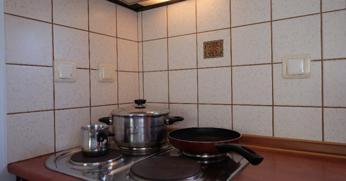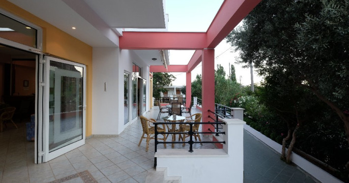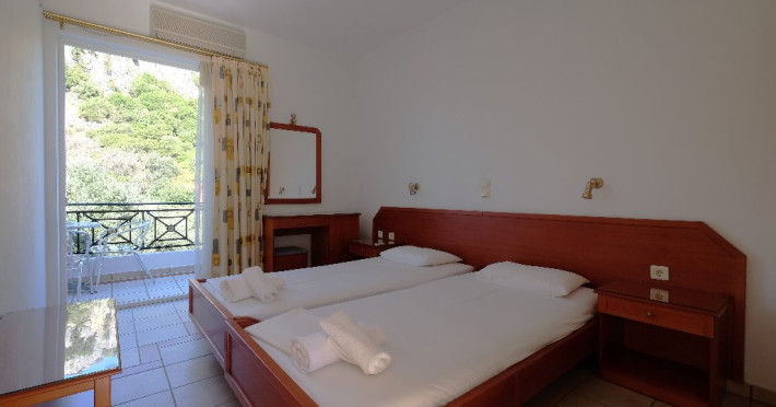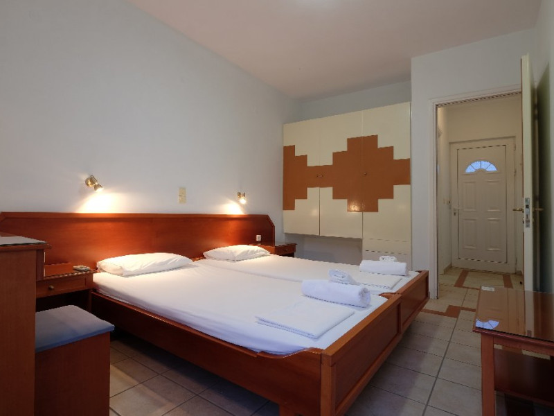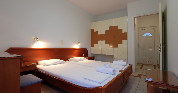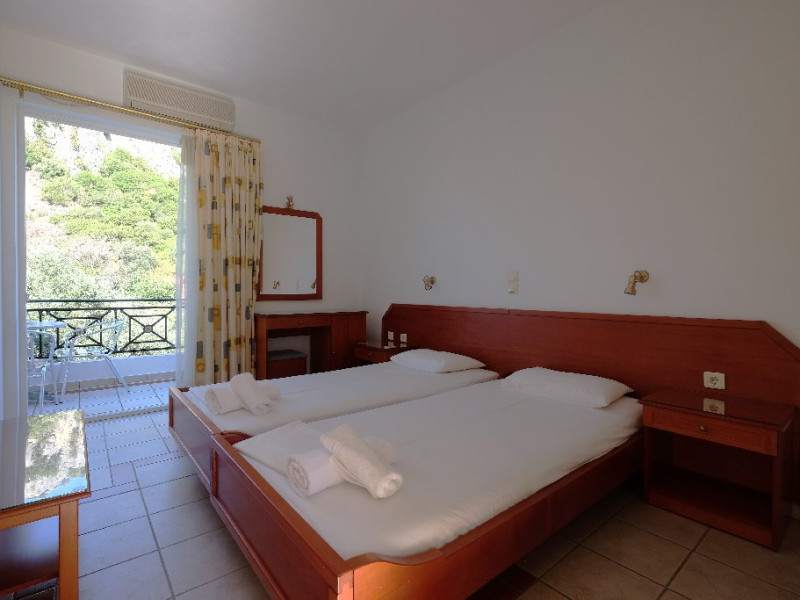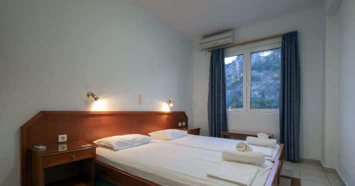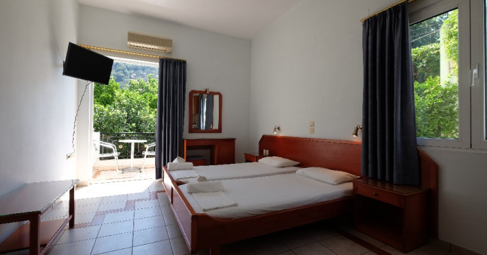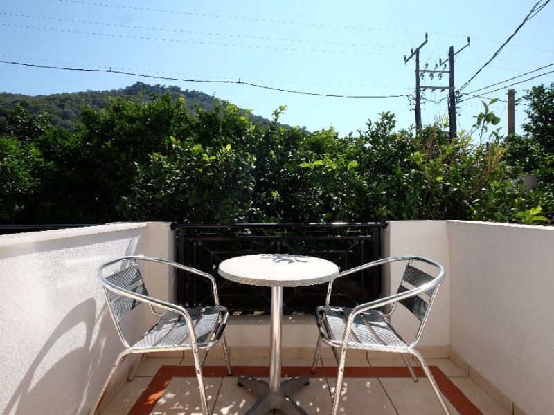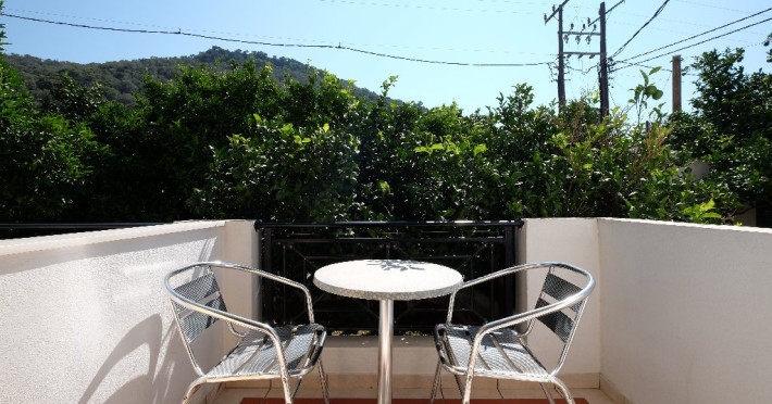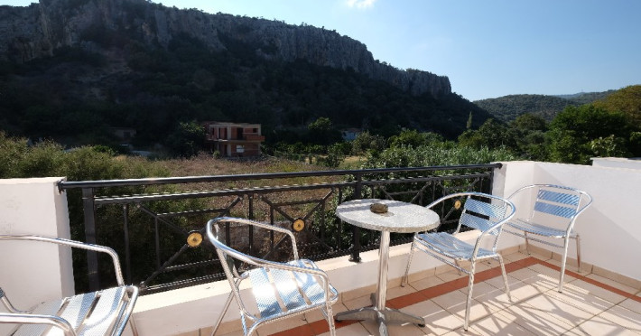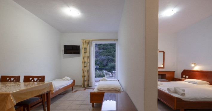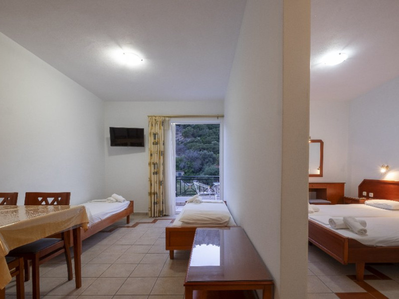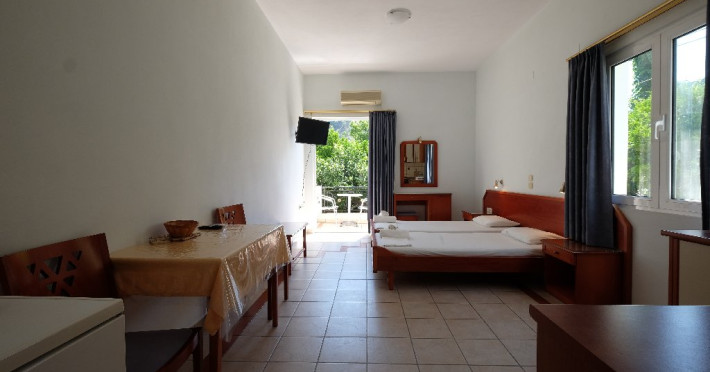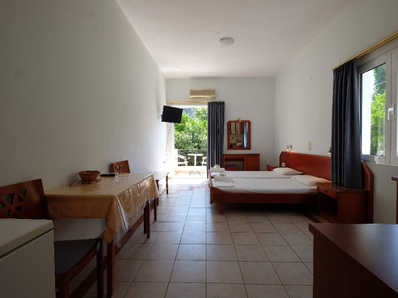 DOTARI CAMERE: Studiourile spatioase, prevazute cu aer conditionat, va asteapta cu un balcon ce ofera privelisti incantatoare catre Marea Egee si munte. Fiecare unitate include o chicineta echipata cu o plita si un frigider, iar bai private sunt dotate cu dus.