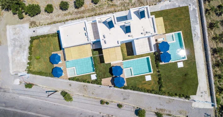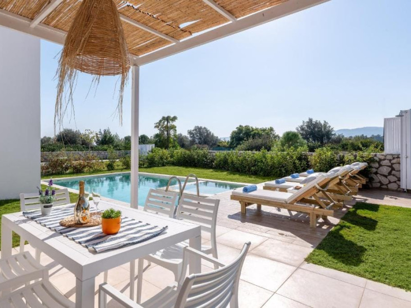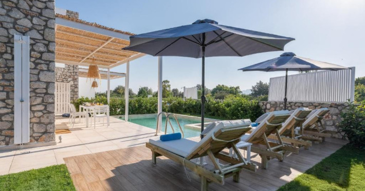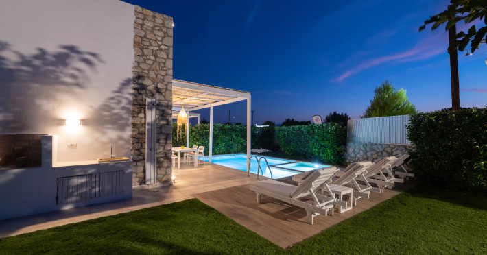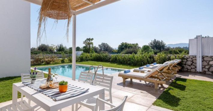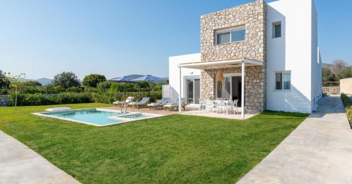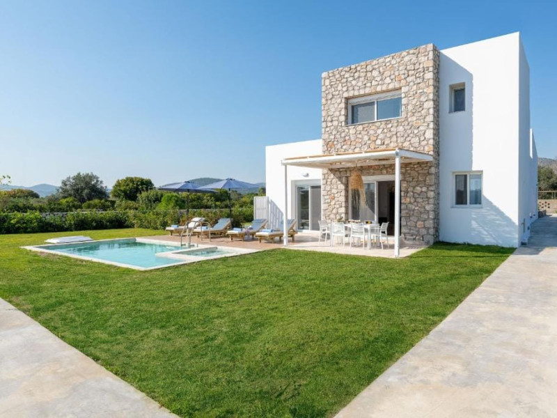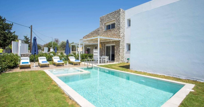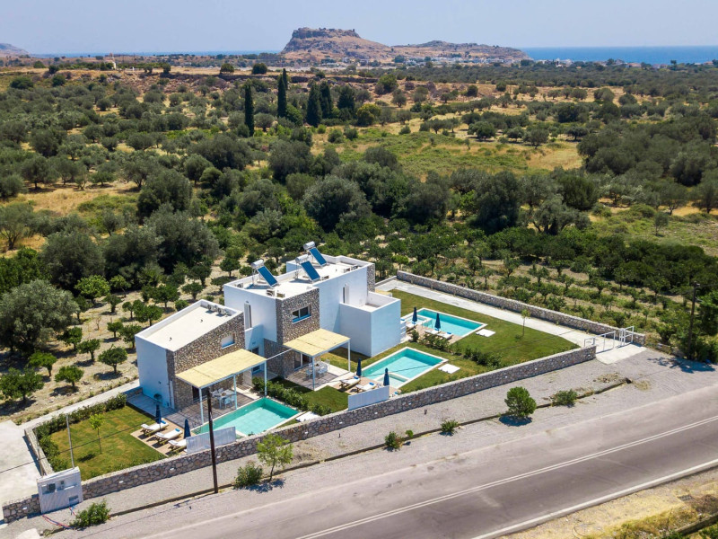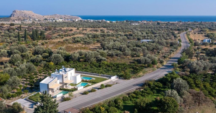 Kostas and Diana offer you superb new A/C villas,each with private pool ,jakkuzi and kind pool .suitable for families, couples or groups, each sleeps up to 6 and has it’s own private pool, garden and sun-deck on a small newly developed complex of 3 villas close to beautiful Haraki Bay (two minutes by car), the Golden Sands of Agathi Beach (five minutes by car) and unspoilt Masari village (five minutes walk). The spectacular ancient capital of Lindos is only ten minutes drive from your villa, which occupies a quiet position on the beach road, surrounded by open countryside. Comfortable and spacious lounge with sofas, TV etc, and access via French windows to outside dining patio and pool area. Fully equipped kitchen/dining room. The master bedroom is en-suite with a TV and large balcony overlooking the pool. Kostas & Diana have also created a communal area next to the villas, with a kitchen garden, barbecue and outdoor dining facilities, which guests may enjoy at their leisure.