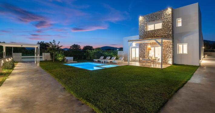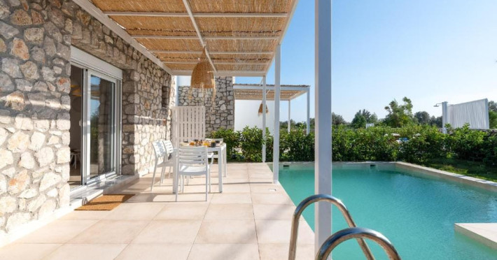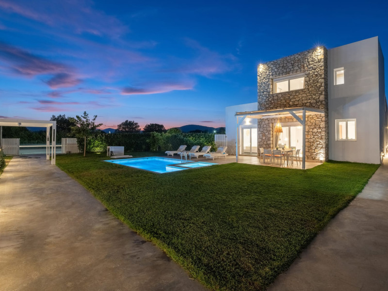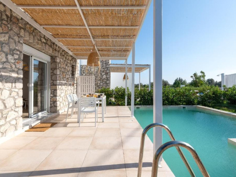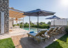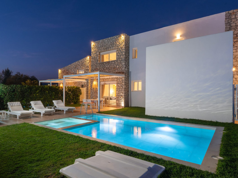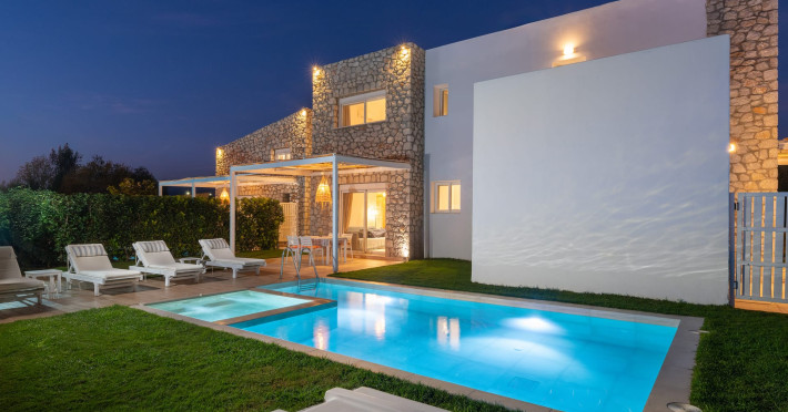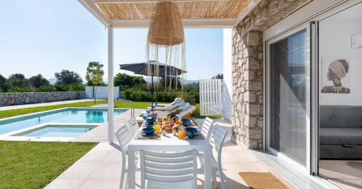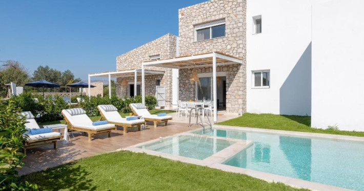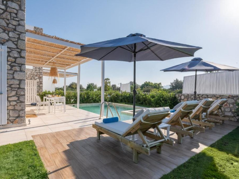 Kostas and Diana offer you superb new A/C villas,each with private pool ,jakkuzi and kind pool .suitable for families, couples or groups, each sleeps up to 6 and has it’s own private pool, garden and sun-deck on a small newly developed complex of 3 villas close to beautiful Haraki Bay (two minutes by car), the Golden Sands of Agathi Beach (five minutes by car) and unspoilt Masari village (five minutes walk). The spectacular ancient capital of Lindos is only ten minutes drive from your villa, which occupies a quiet position on the beach road, surrounded by open countryside. Comfortable and spacious lounge with sofas, TV etc, and access via French windows to outside dining patio and pool area. Fully equipped kitchen/dining room. The master bedroom is en-suite with a TV and large balcony overlooking the pool. Kostas & Diana have also created a communal area next to the villas, with a kitchen garden, barbecue and outdoor dining facilities, which guests may enjoy at their leisure.