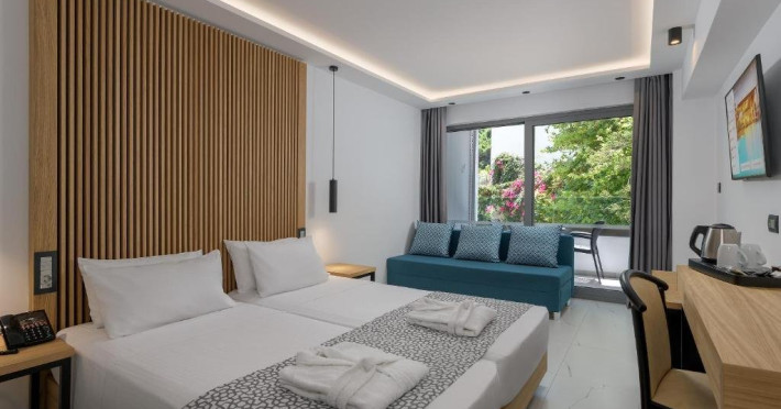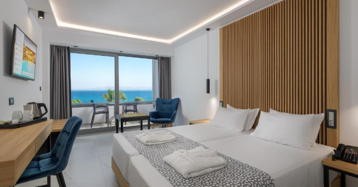 Localizare : Hotelul este situat la 50m de plaja, la 6km de orasul Rodos si la 10 km distanta de aeroport. La aproximativ 500m se gasesc baruri, cafenele si magazine.Statiunea Ixia este una dintre cele mai ofertante din acest punct de vedere.