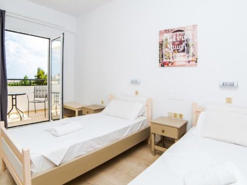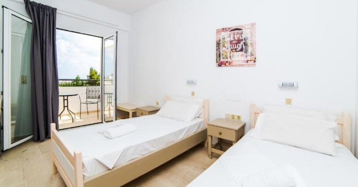 Dotari camere: Pasiphae Hotel dispune de 19 unitati de cazare: 13 camere duble (20 mp), 5 camere tripele (25 mp) si 1 camera single (18 mp). Toate camerele sunt dotate cu aer conditionat (cu plata, 7 euro/zi), wi-fi gratuit, mini frigider, ventilator, baie cu dus, balcon/terasa.