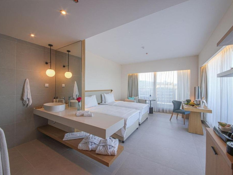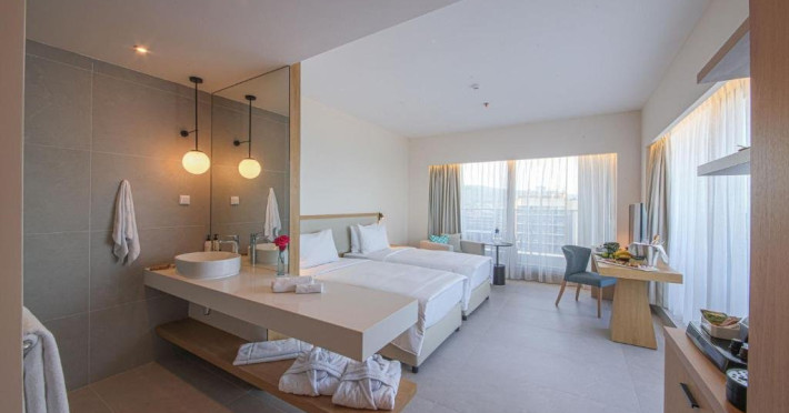 Localizare: Poseidon Beach Resort este situat in Nisipurile de Aur. Facilitati hotel: Hotelul este construit in 2024, are 9 etaje, 2 lifturi. Hotelul pune la dispozitia clientilor 4 restaurante, baruri, loc de joaca pentru copii (la Apollo Spa Resort), acces gratuit la facilitatile si zonele comune ale hotelului Apollo, piscina exterioara infinity, piscine interioare si exterioare. Camere pentru persoane cu dizabilitati la cerere. Plaja 1 umbrela si 2 sezlonguri per camera incluse (in perioada 10.0610.09). Nu este specificat clar unde va fi localizata plaja. Contra cost: Aphrodite Beauty Spa, clinica de sanatate si Boutique Spa din Poseidon, babysitting, room service, serviciu de spalatorie, roof top Sky bar, wellness restaurant, bar la piscina si gustari, mini bar, parcare - locuri limitate. Dotari camere: Camerele sunt dotate cu TV prin satelit, Wi-Fi, facilitati pentru ceai si cafea, fier si masa de calcat (la cerere), mini bar (umplut doar o data, in ziua sosirii), balcon, cabina de dus, uscator de par. -Deluxe aprox. 31-33 mp. Situate la etajele 13, cu pat matrimonial sau paturi twin. Pat suplimentar disponibil. -Superior aprox. 32-33 mp. Situate la etajele 49, cu pat matrimonial sau paturi twin. Pat suplimentar disponibil. -Family Interconnected aprox. 64 mp cu pat matrimonial si paturi twin. Animale de companie: Nu sunt permise Site web: https://poseidonbeachresort.com/ro/